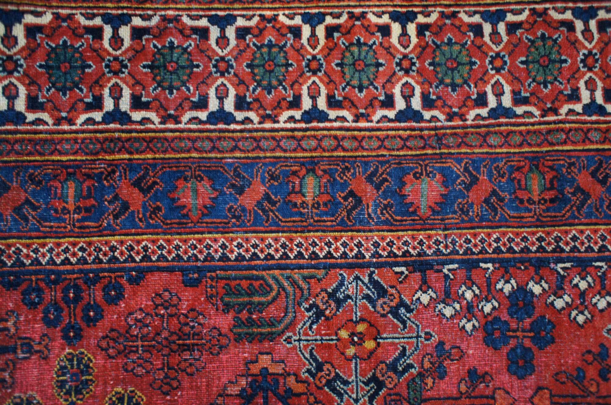A Joshagan rug is a type of oriental rug that has been woven in the Persian village of Joshagan for centuries. The rugs are known for their intricate designs, which often feature a diamond-shaped medallion in the center on a deep red background with dark blue borders and corners. The rugs are typically made from high-quality wool, which is spun into yarn and dyed using traditional methods before being woven. The foundation of the rugs is usually cotton, providing a sturdy backbone for the designs. The rugs are also known for their medium to high knot density, often between 120 and 200 knots per square inch, which allows for detailed patterns and contributes to the rug's durability