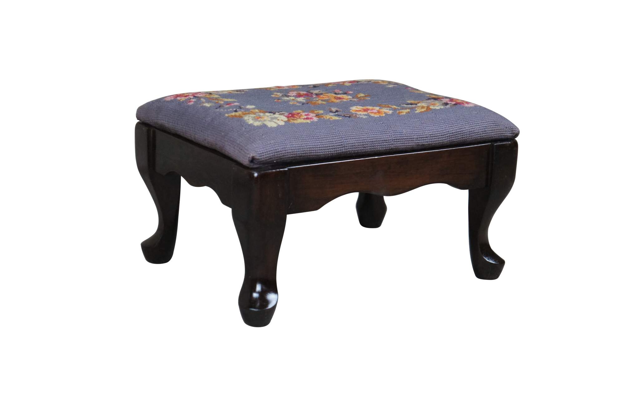 A lovely antique footstool with floral needlepoint embroidered top. Features a serpentine apron and cabriole legs.