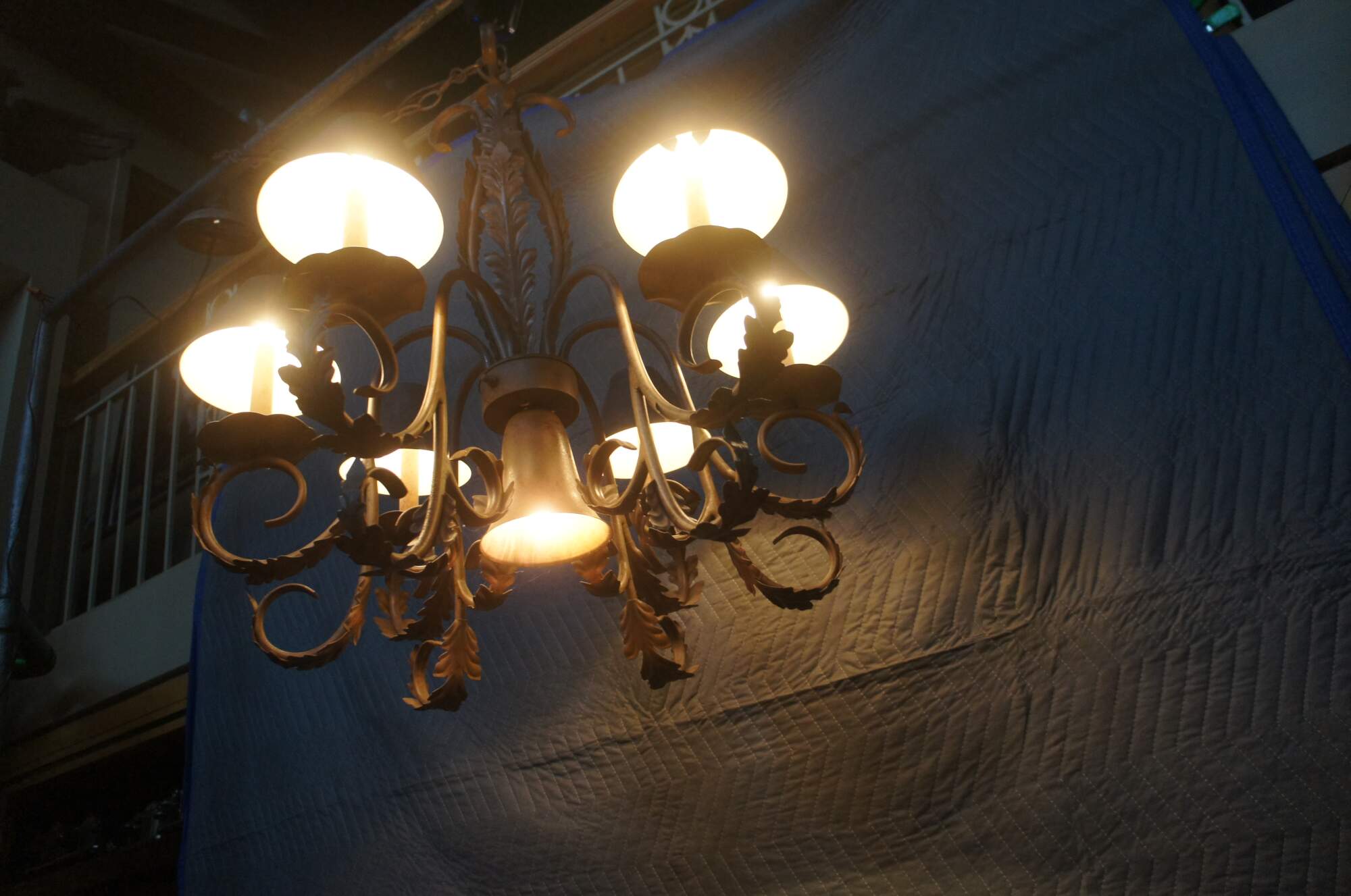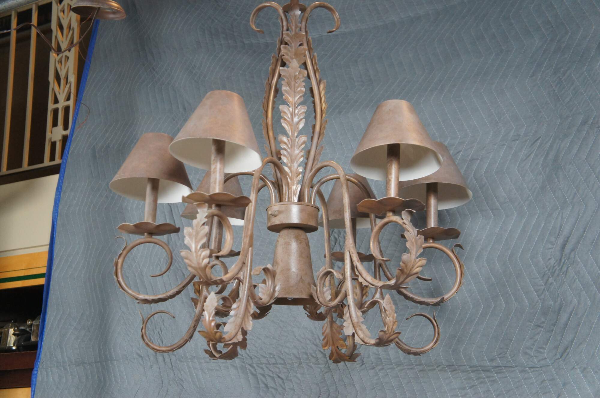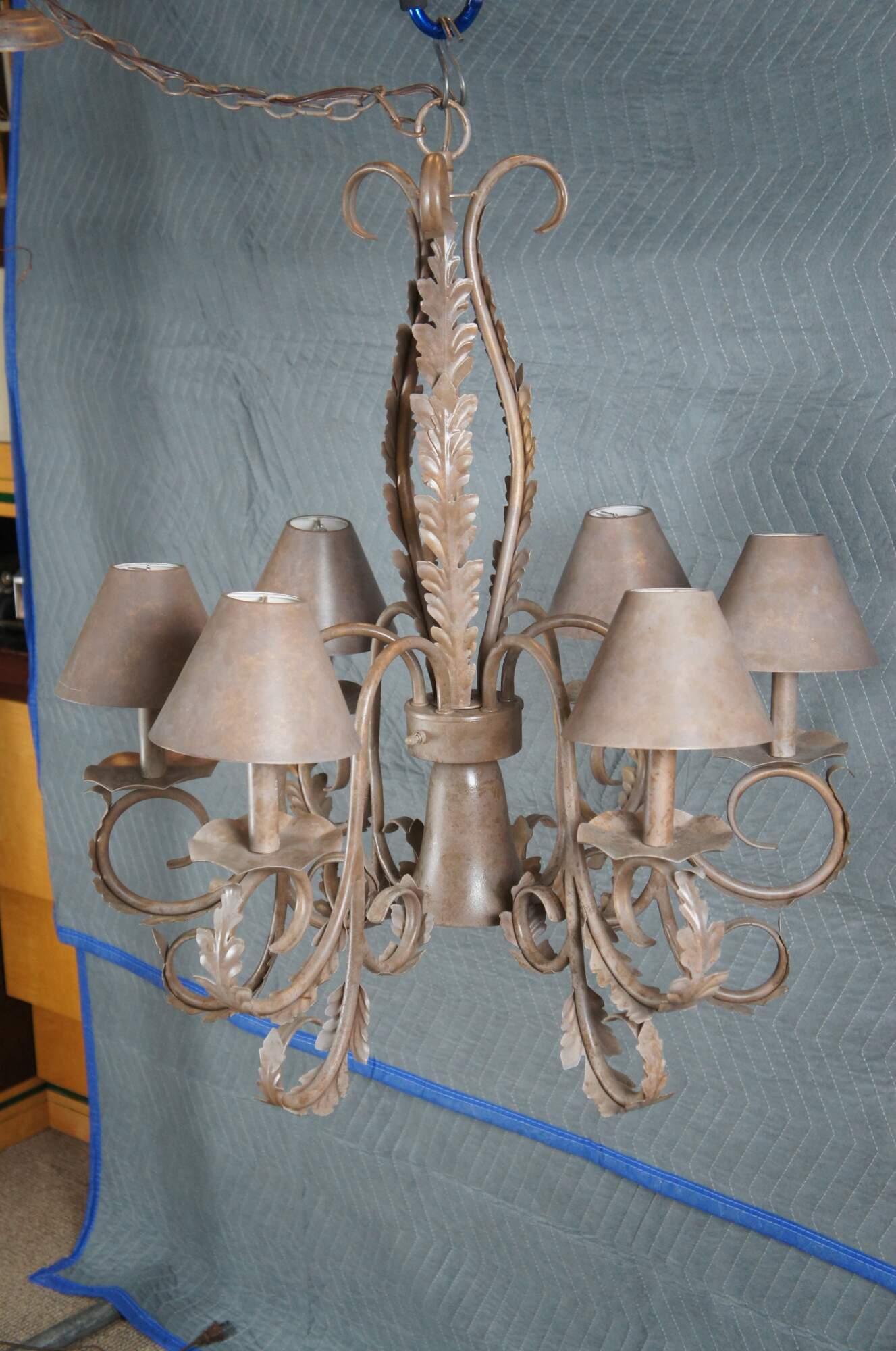 Vintage French Acanthus scrolled iron chandelier featuring 6 arm design with down light. The down light can be operated in conjunction with the other lights or by itself.