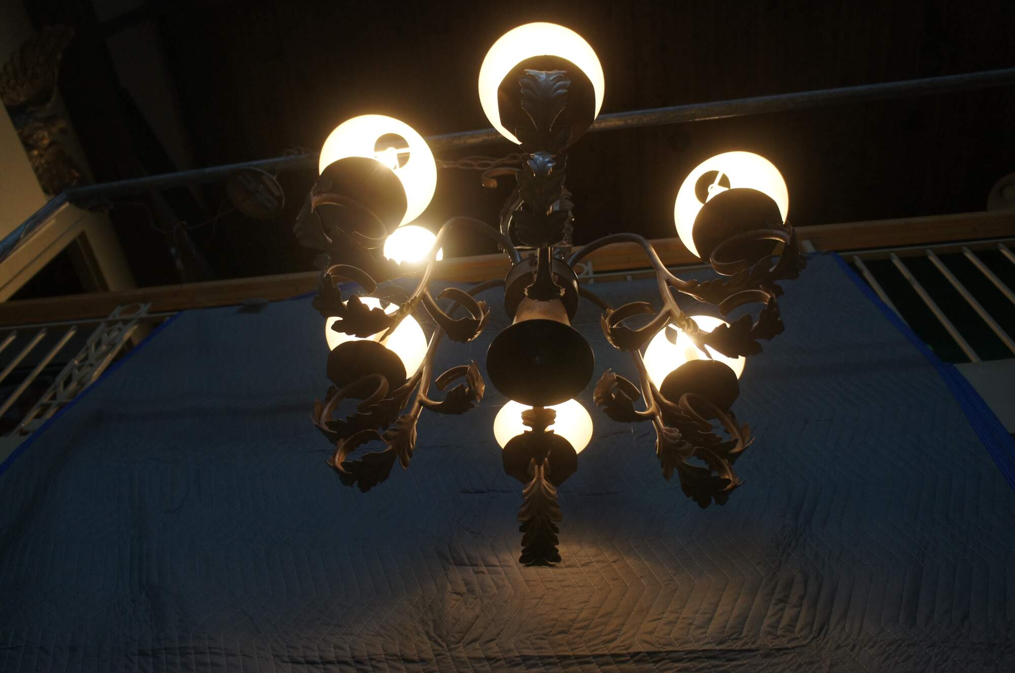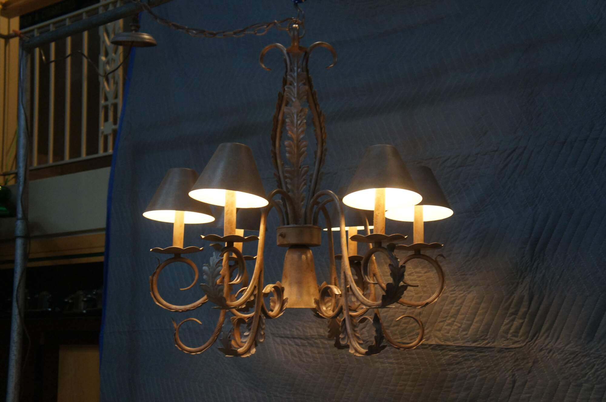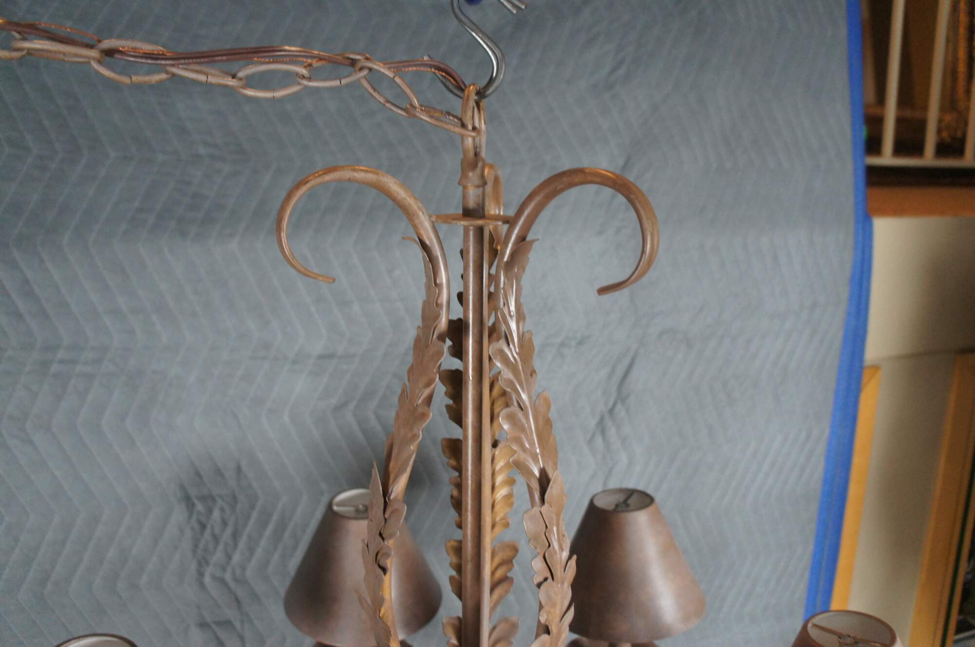 Vintage French Acanthus scrolled iron chandelier featuring 6 arm design with down light. The down light can be operated in conjunction with the other lights or by itself.