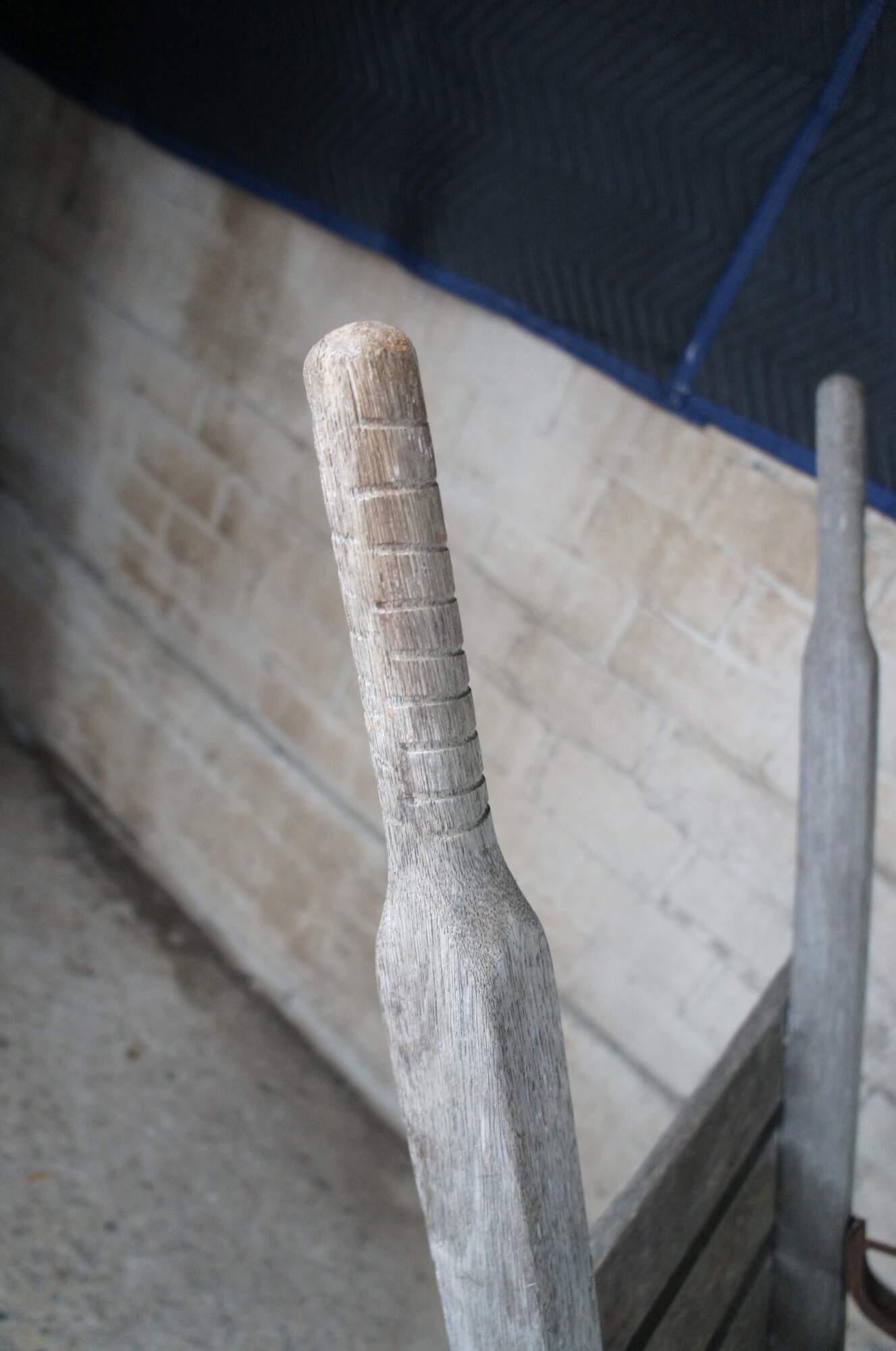 1940s Flat-bed wheel barrow. Intended for bricks or hay. Features a wooden frame on wheel with metal support.