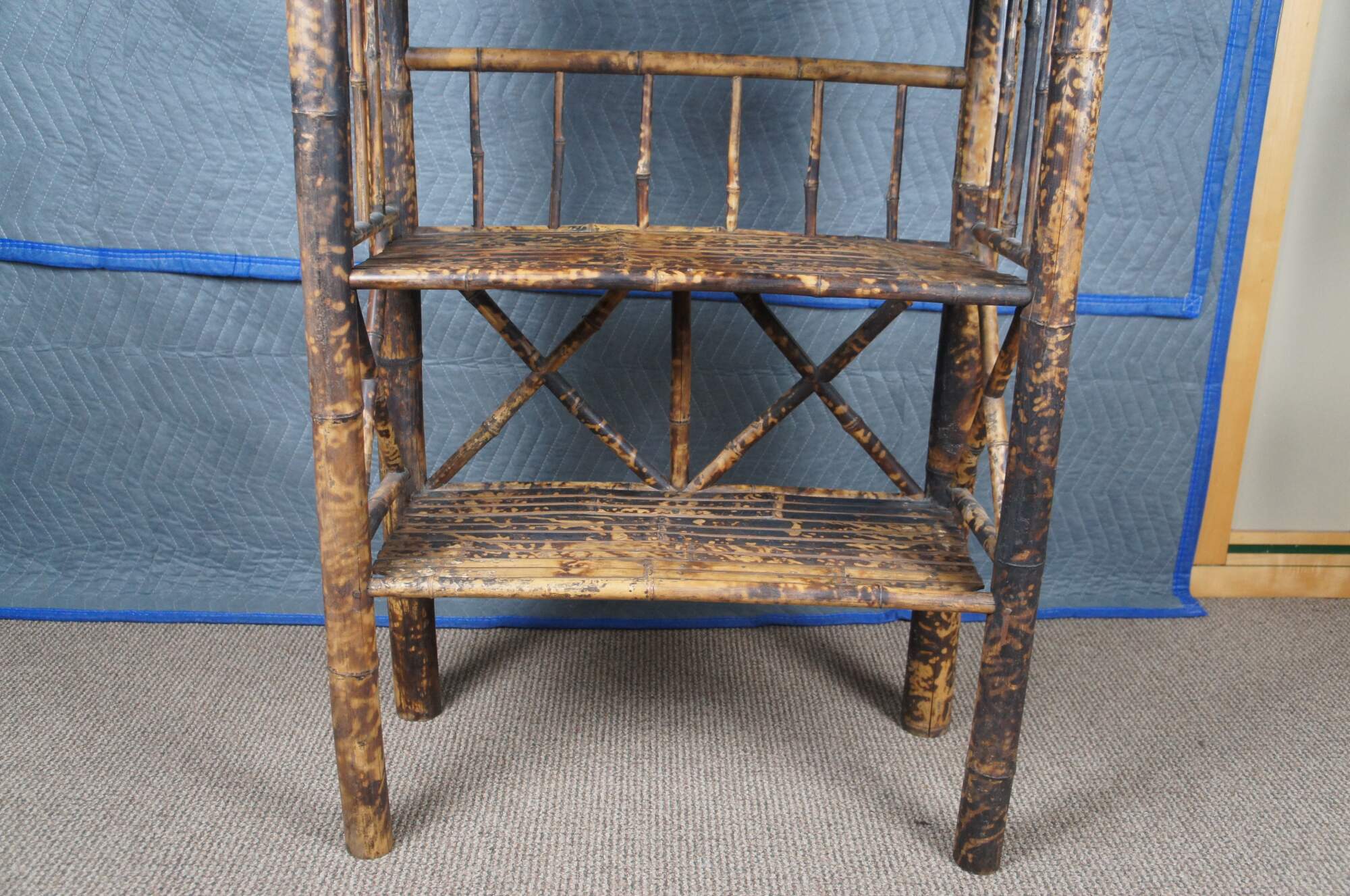 Antique Victorian bamboo library bookcase / etagere stand. Made of bamboo featuring a scorched / tortoise shell finish with four shelves, columns, and geometric pattern slats.