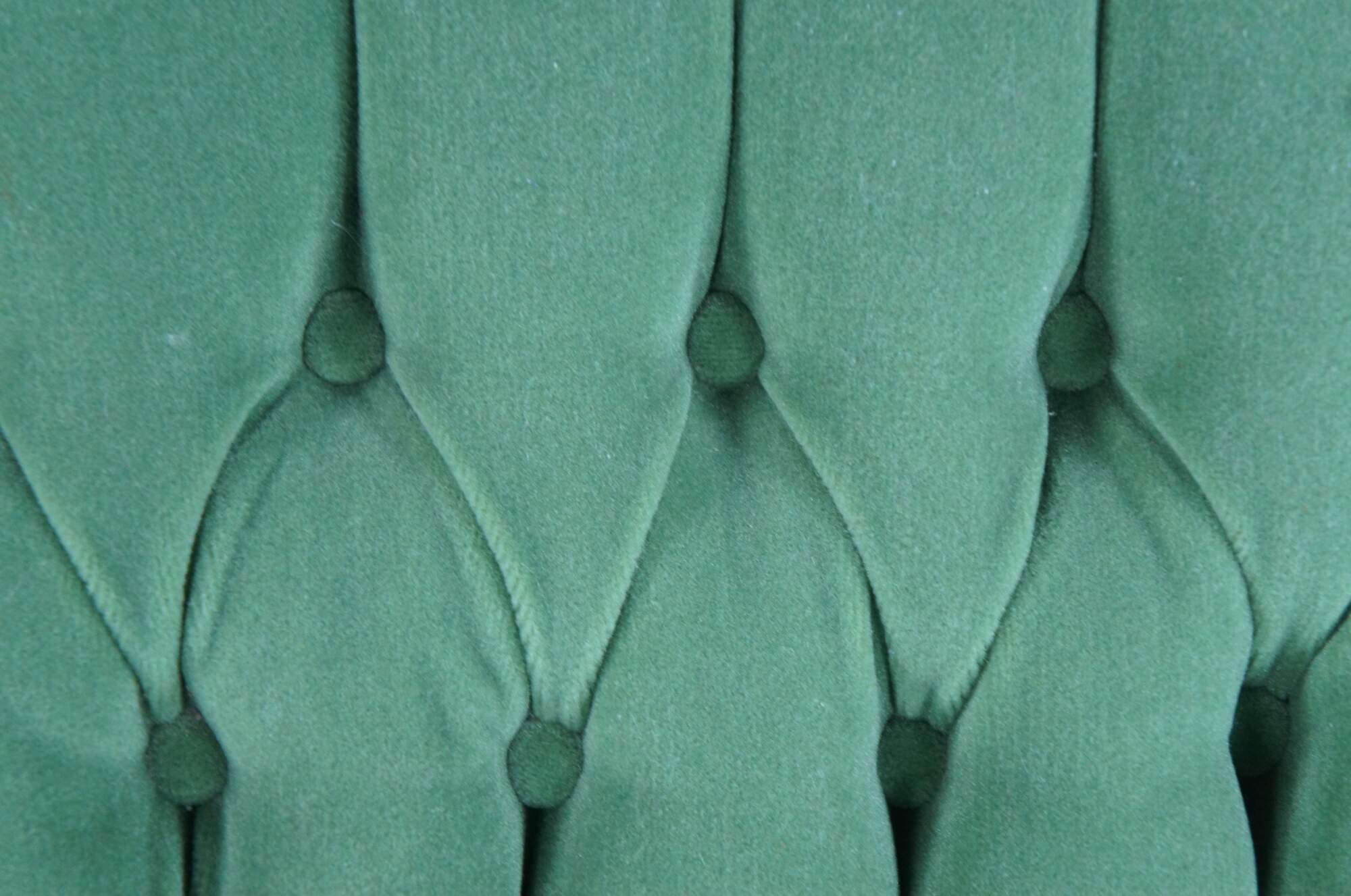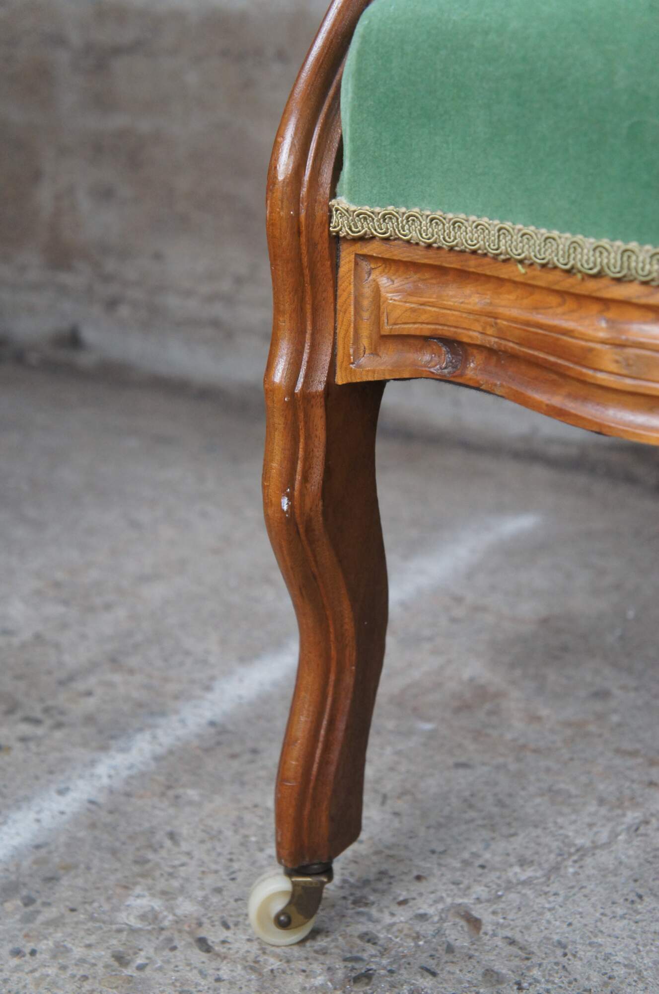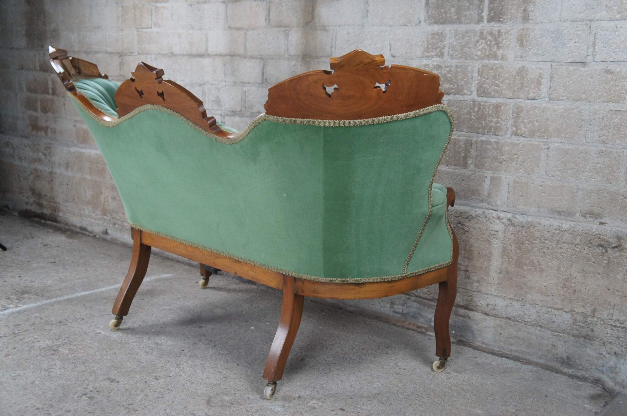 Antique Victorian Renaissance Revival parlor Settee. Made from walnut with a serpentine form featuring a carved camelback with burled panels. Upholstered in a green velvet / velour with a tufted back. The settee is supported by contoured legs with casters.