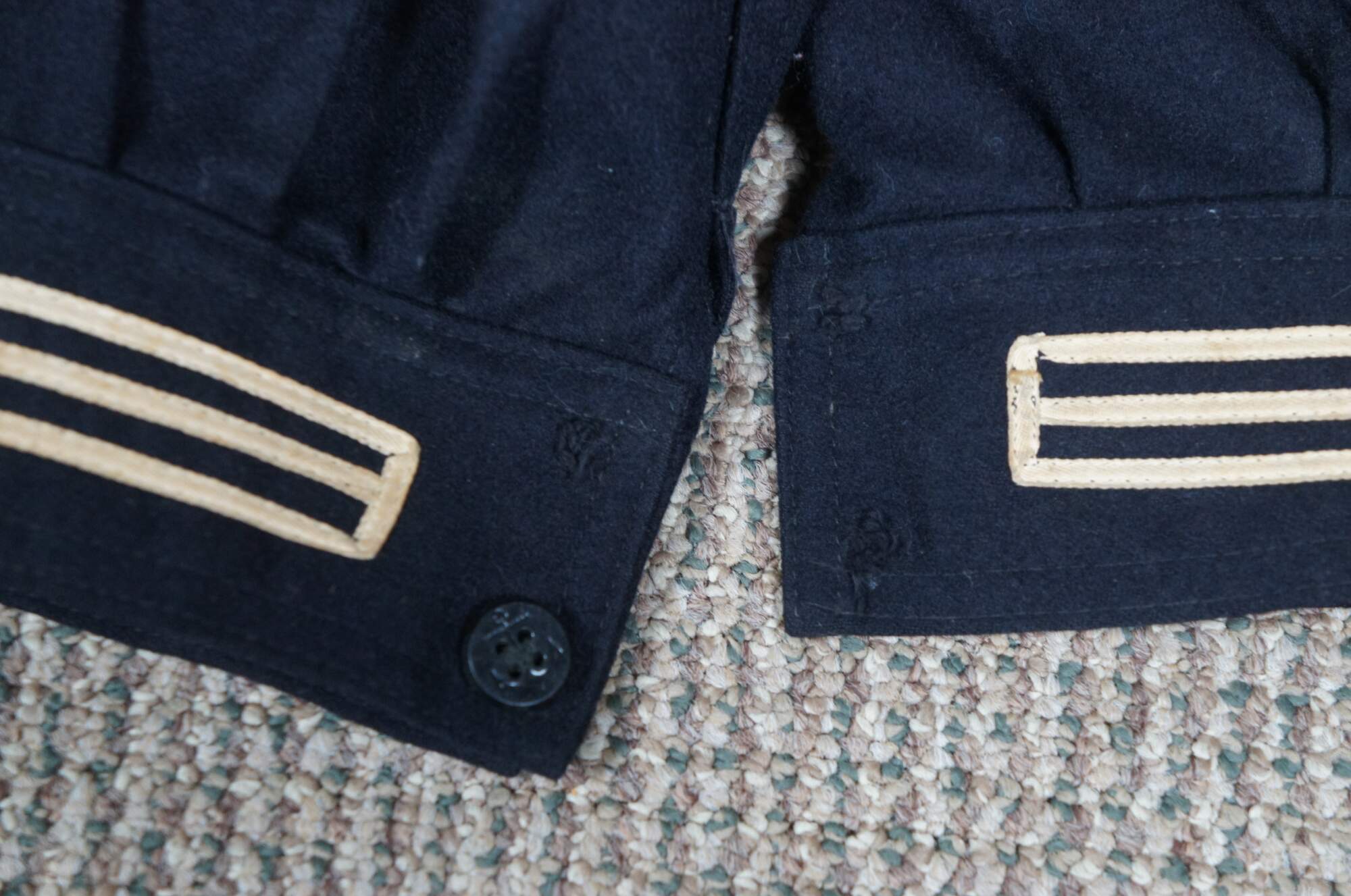 3 piece set of vintage pre-Vietnam "Cracker Jack" style United States Navy blue wool uniform shirts / jumpers and pants. Pants feature straight leg with full button front flap / fly. One jumper with no trim and one jumper with white stripe trim and stars at cuffs and collar. Both with insignia patches on left arm. Maufactured by the Naval Clothing Factory.