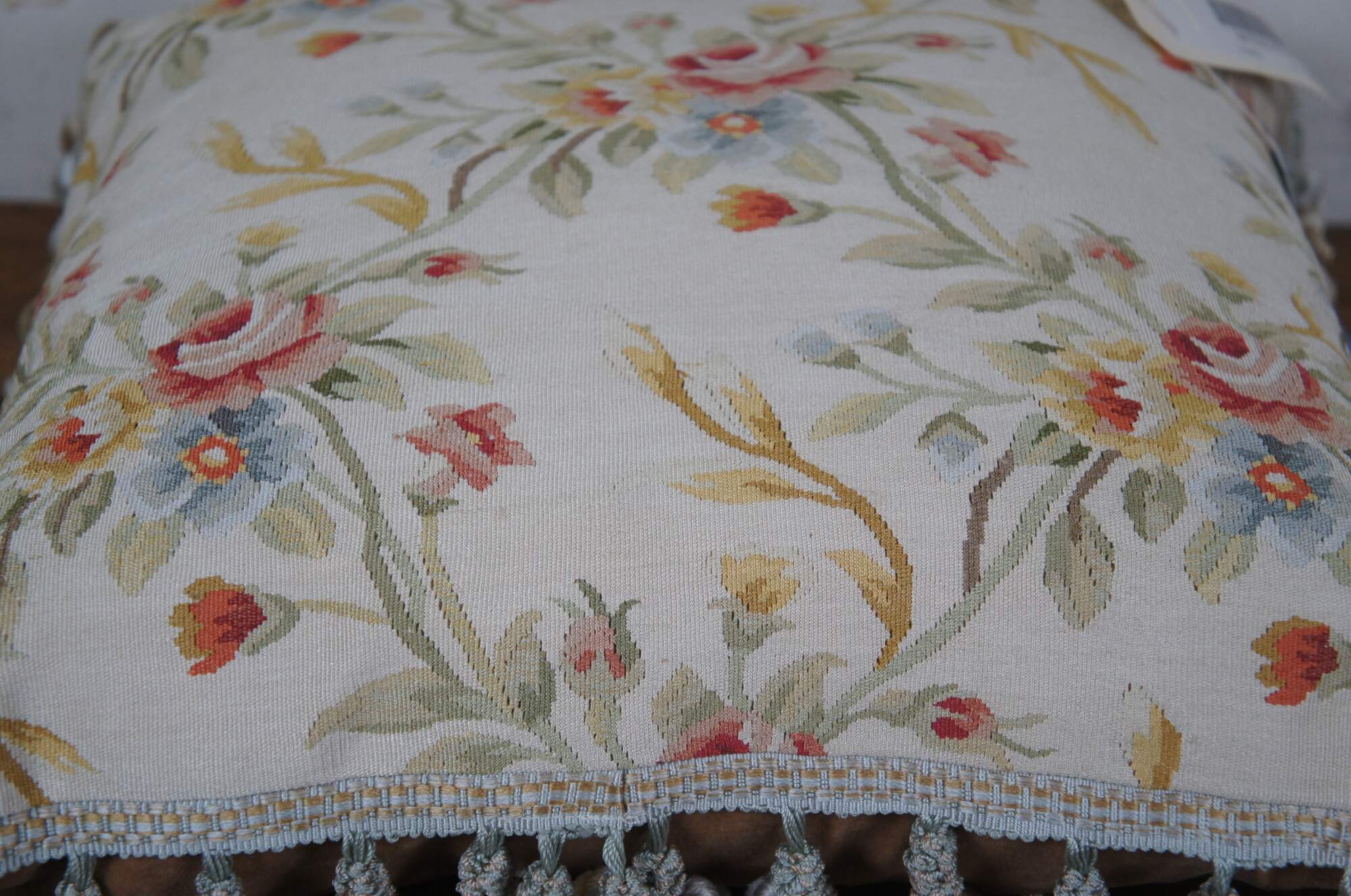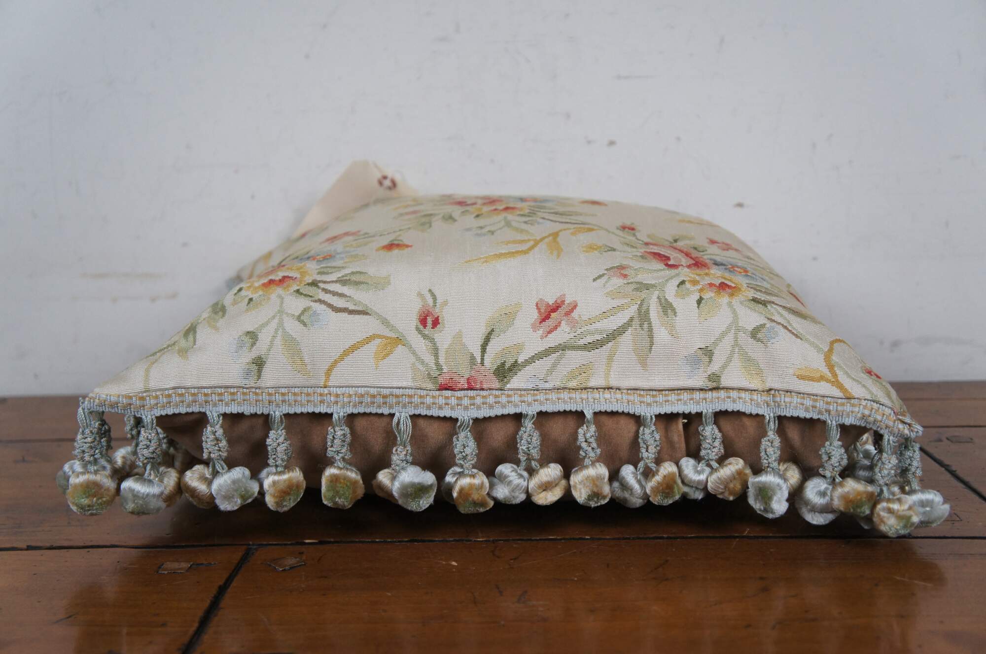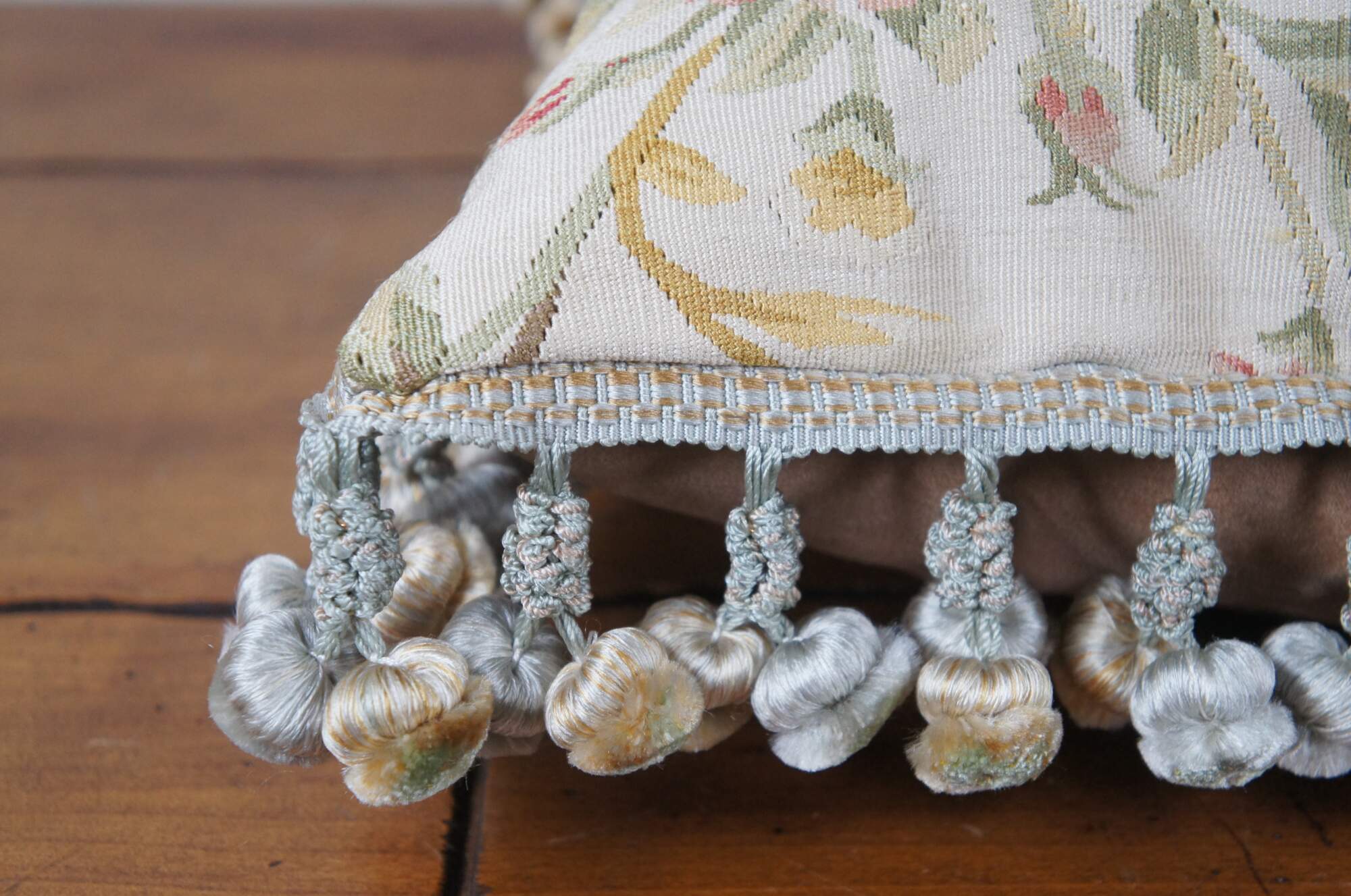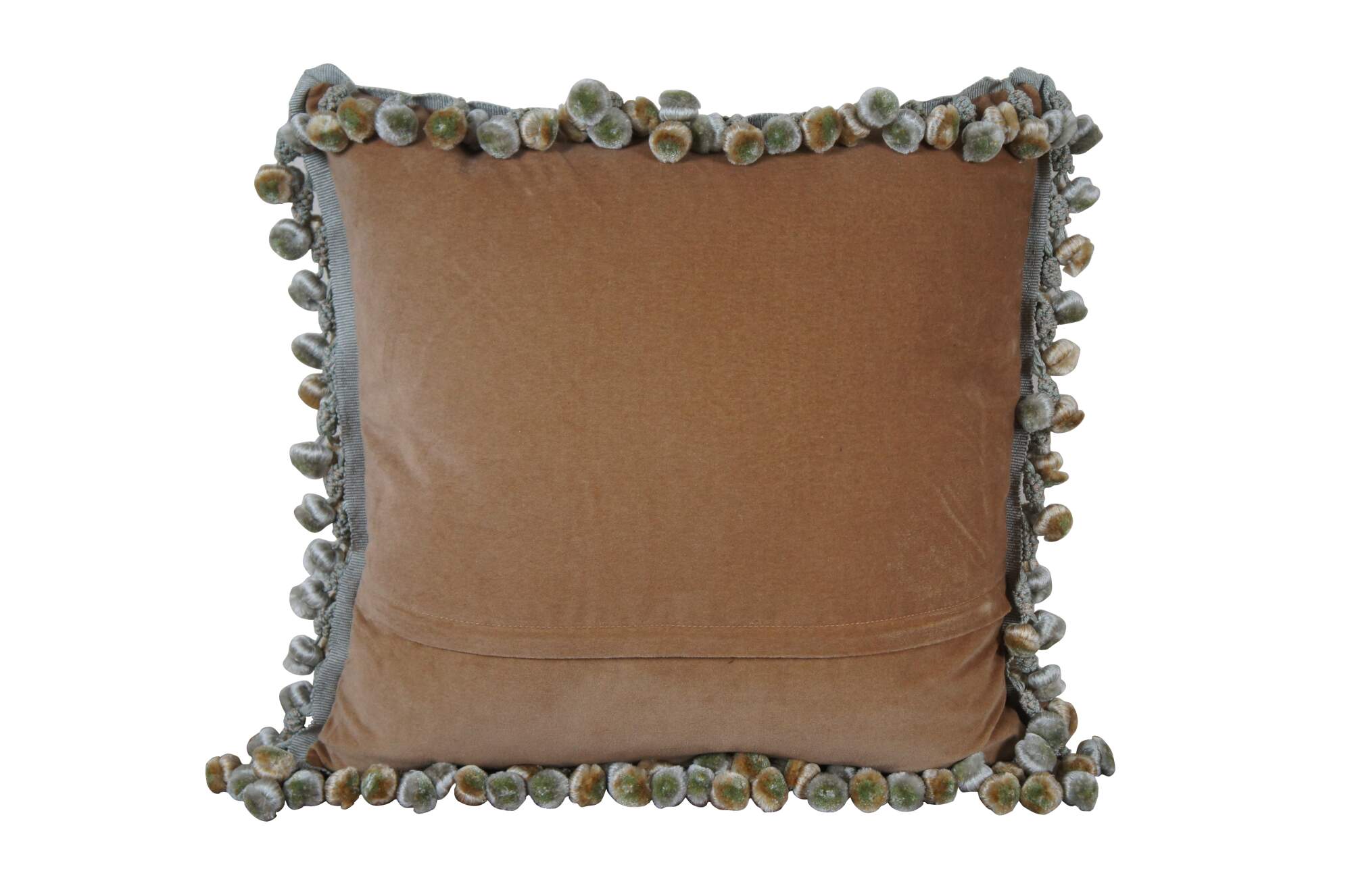 20th century square throw pillow, embroidered in silk with bouquets of pink, yellow, blue and orange flowers, connected with green and yellow stems. Down filled. Light brown velour / velvet back with zipper closure. Blue and gold ball tassel trim.