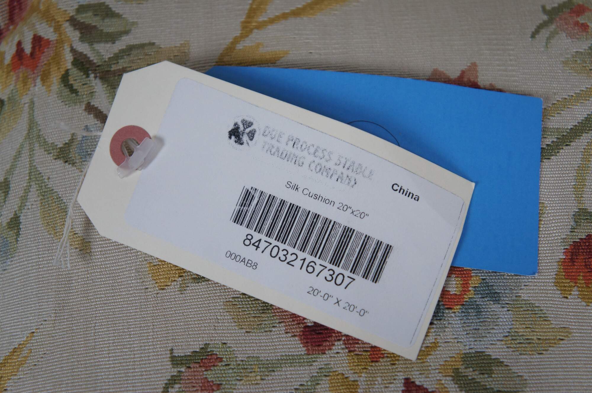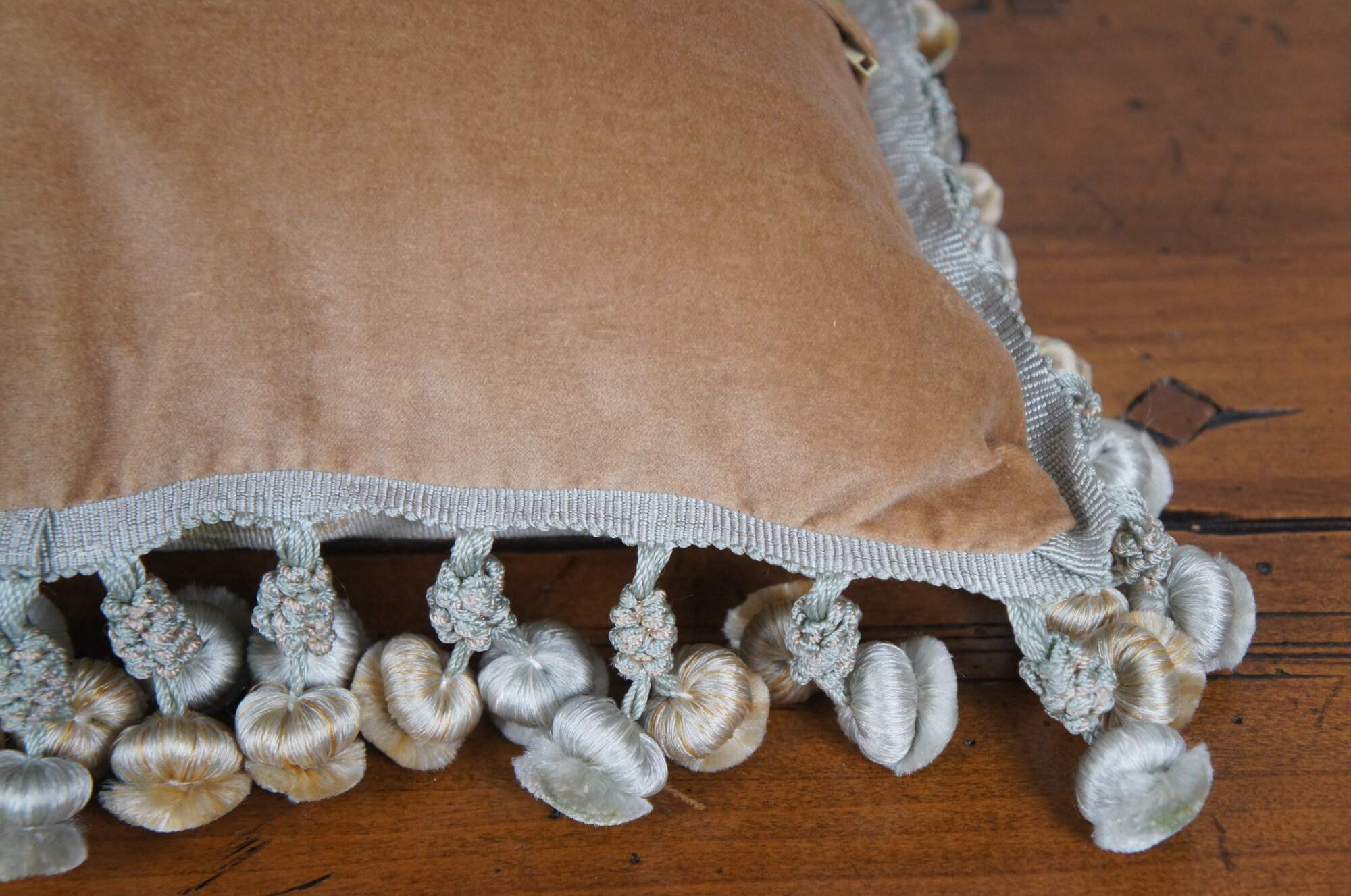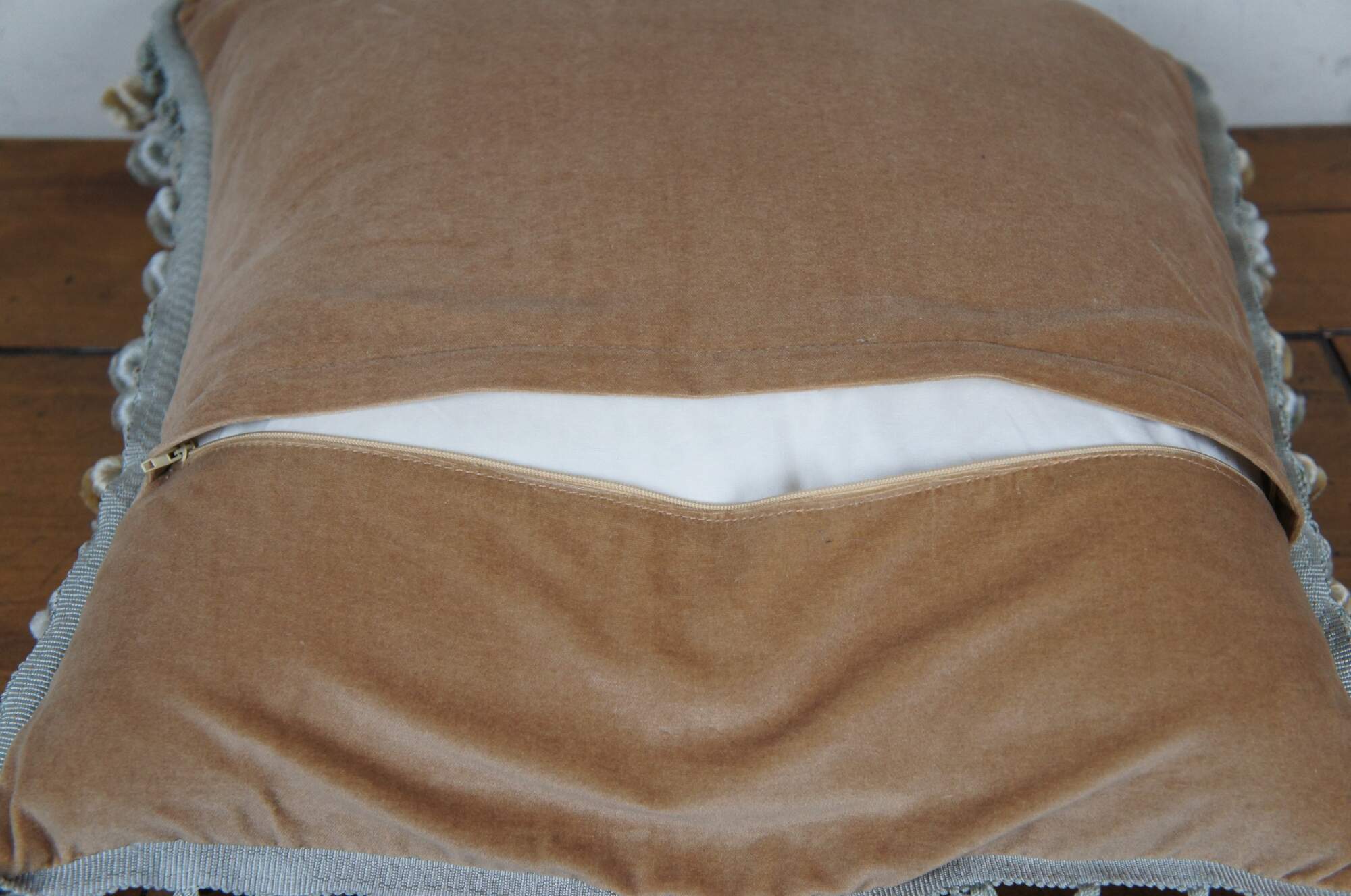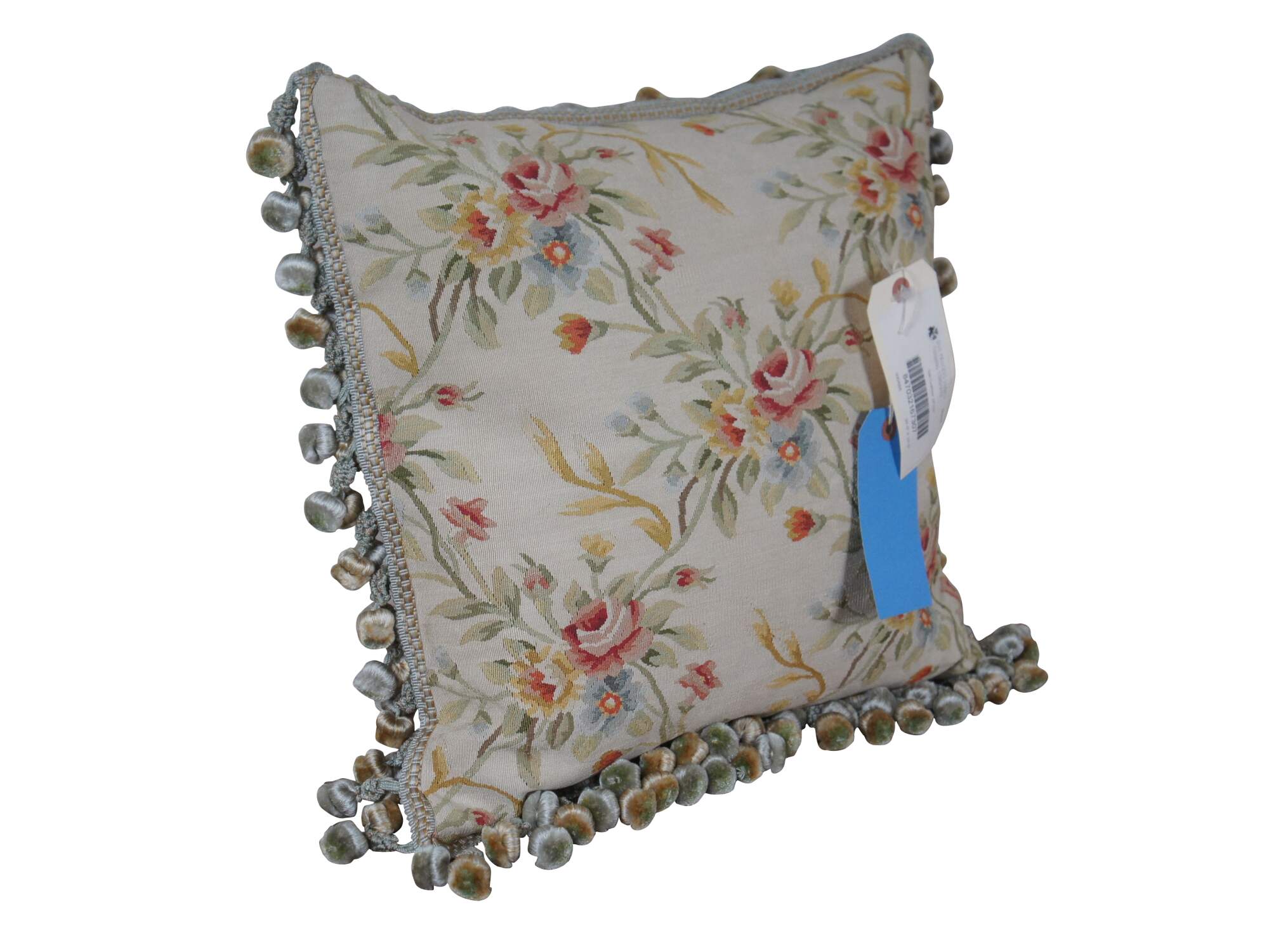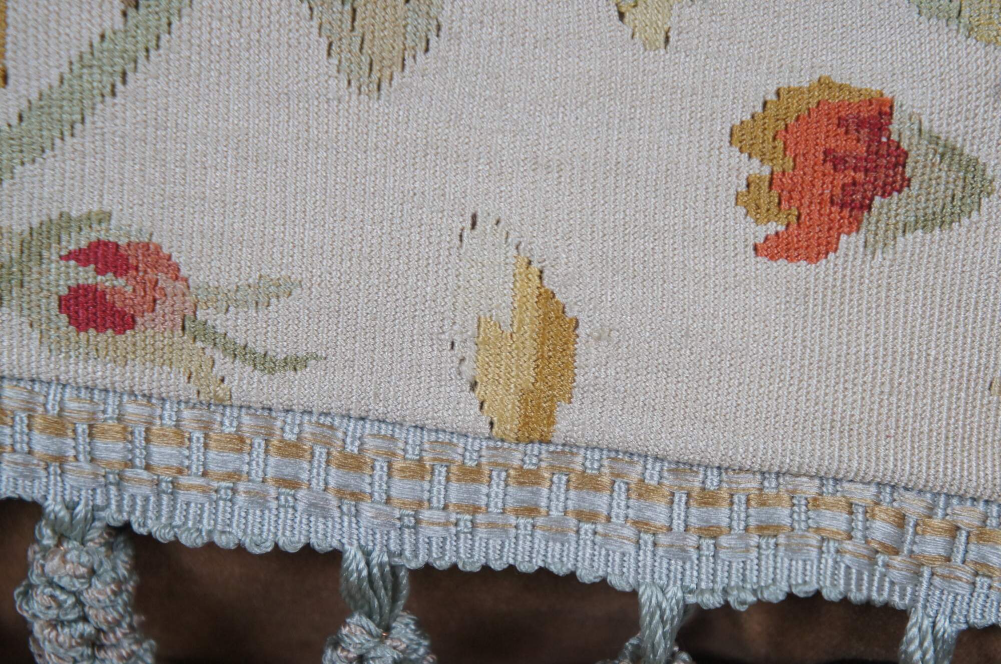 20th century square throw pillow, embroidered in silk with bouquets of pink, yellow, blue and orange flowers, connected with green and yellow stems. Down filled. Light brown velour / velvet back with zipper closure. Blue and gold ball tassel trim.