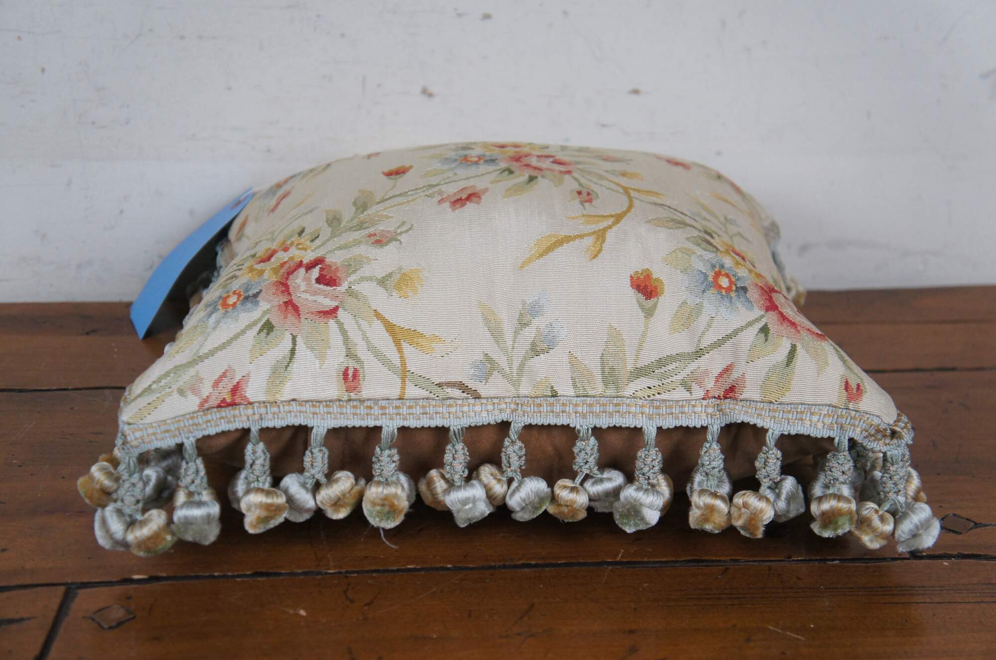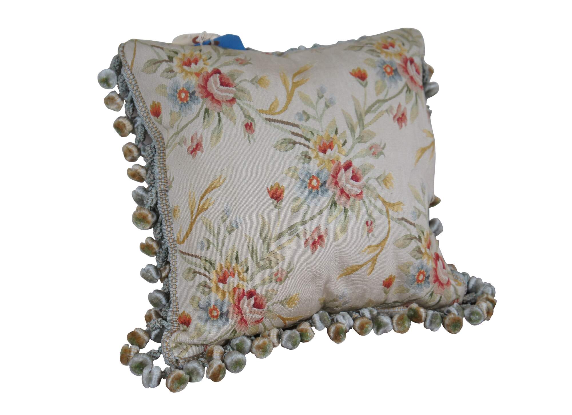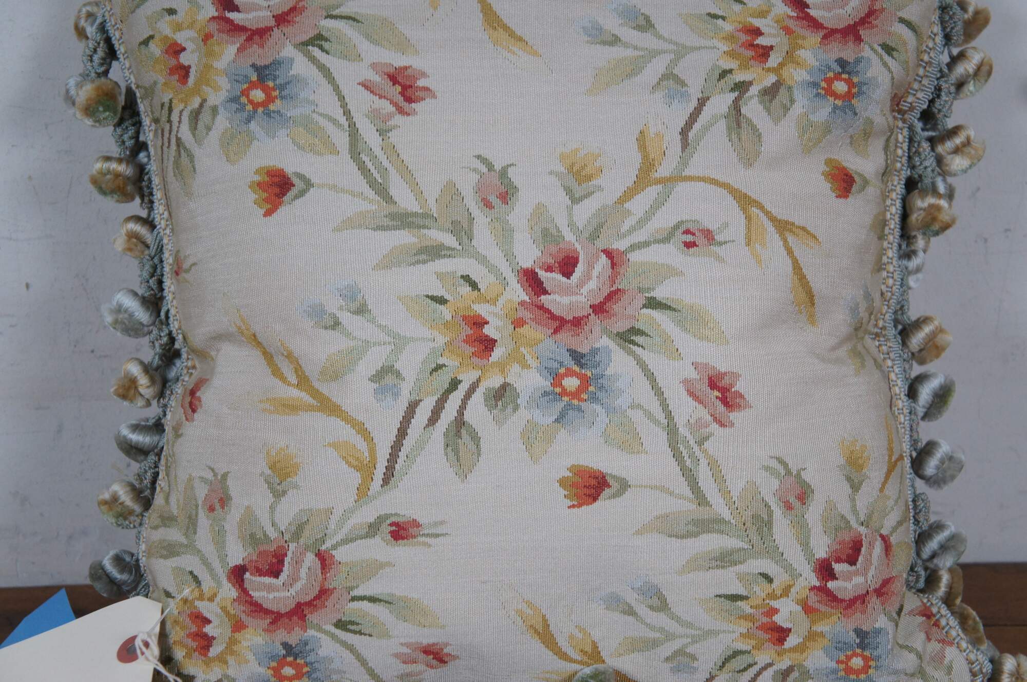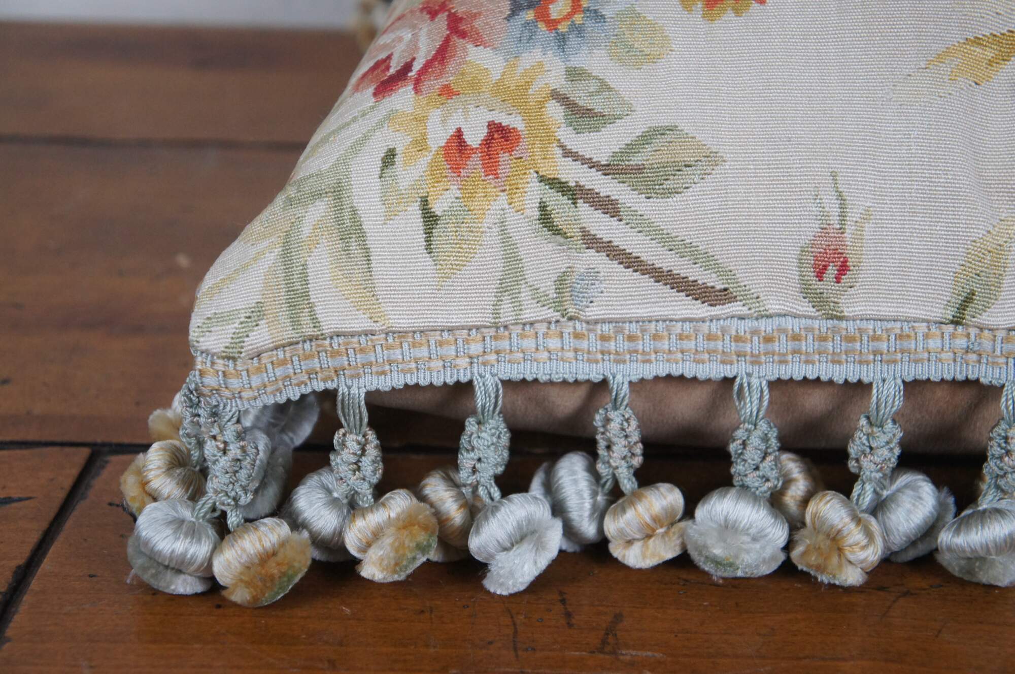 20th century square throw pillow, embroidered in silk with bouquets of pink, yellow, blue and orange flowers, connected with green and yellow stems. Down filled. Light brown velour / velvet back with zipper closure. Blue and gold ball tassel trim.