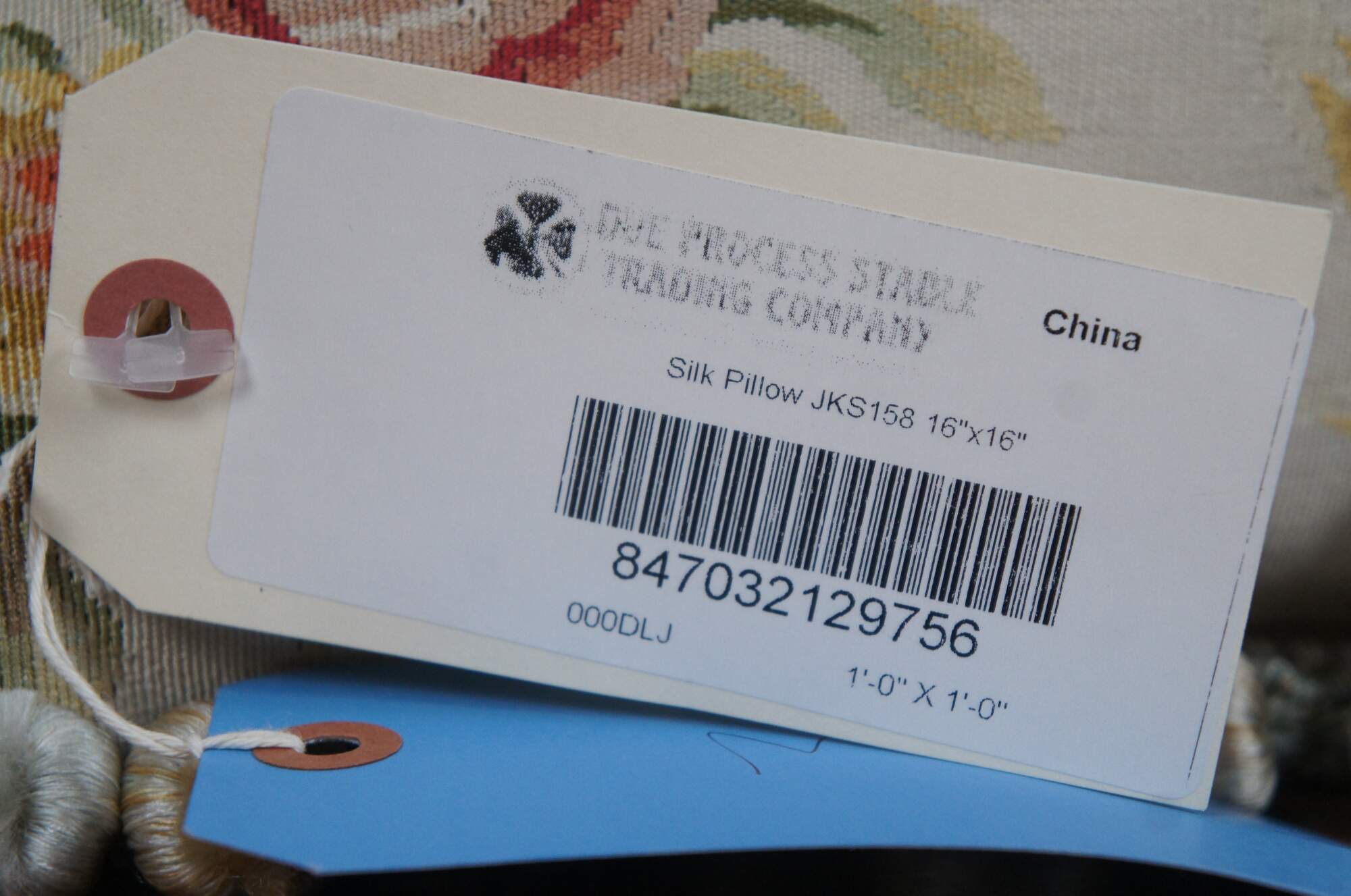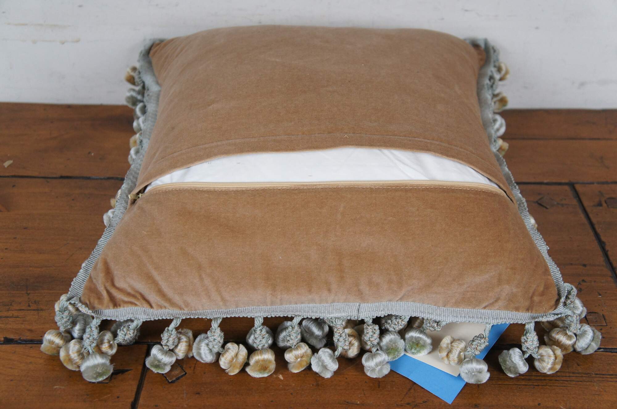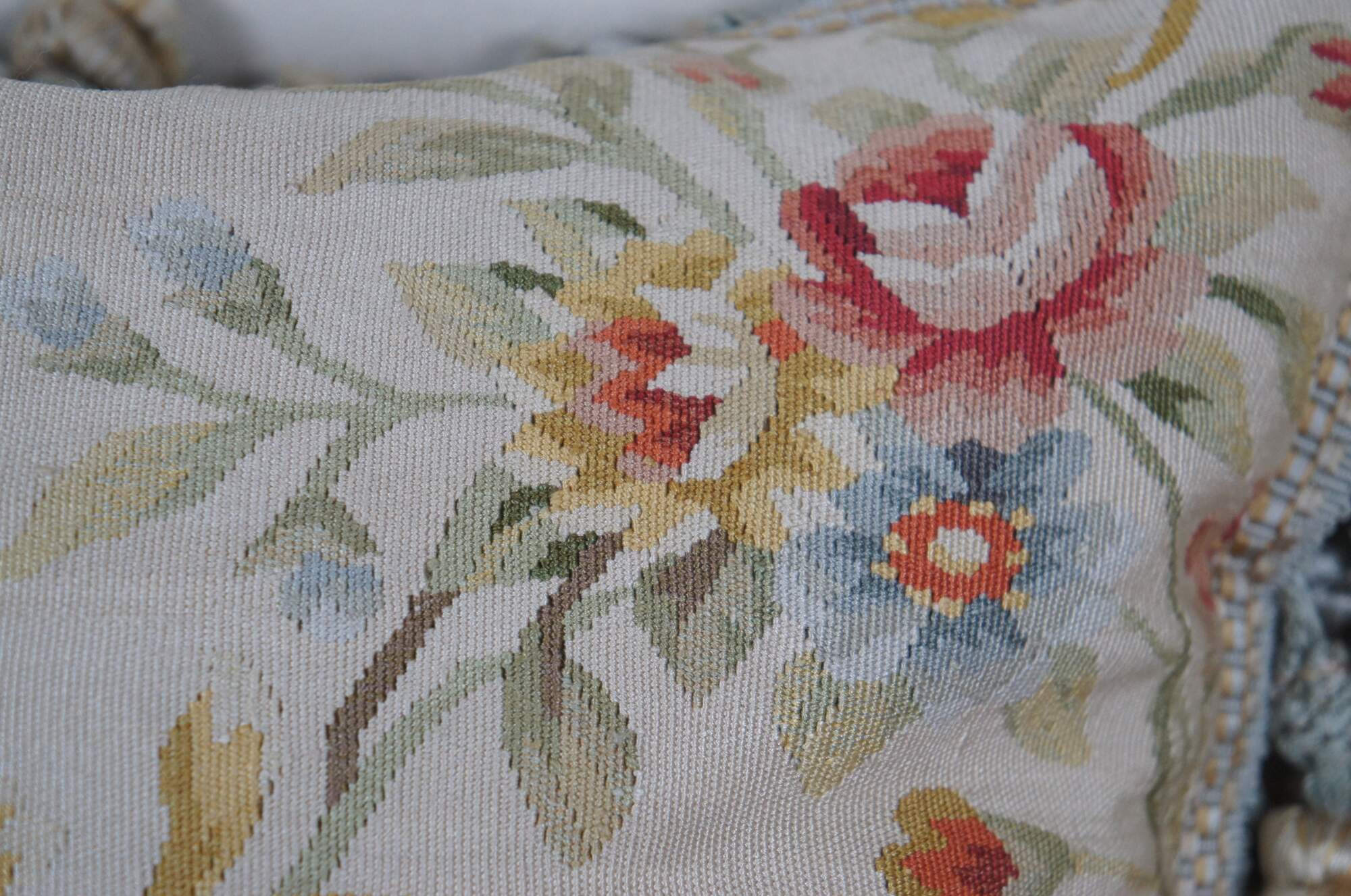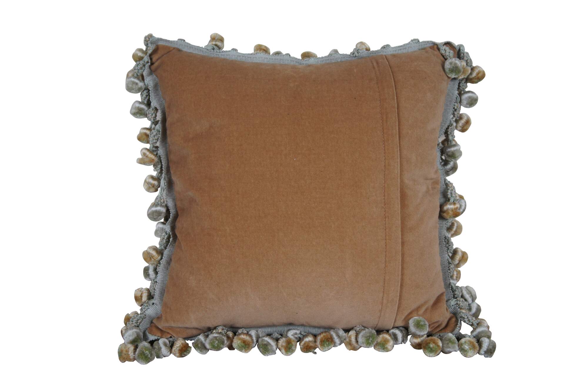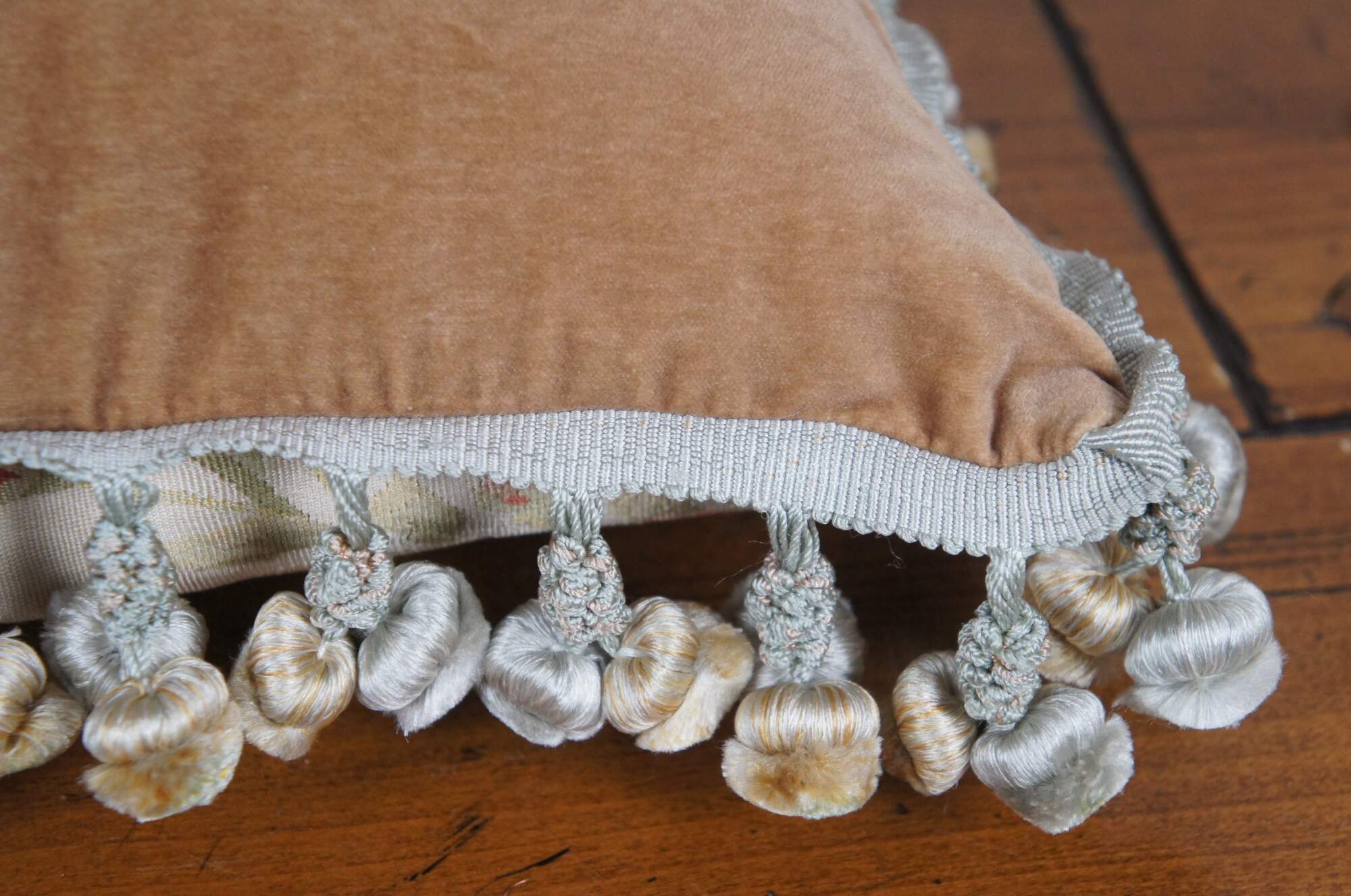 20th century square throw pillow, embroidered in silk with bouquets of pink, yellow, blue and orange flowers, connected with green and yellow stems. Down filled. Light brown velour / velvet back with zipper closure. Blue and gold ball tassel trim.