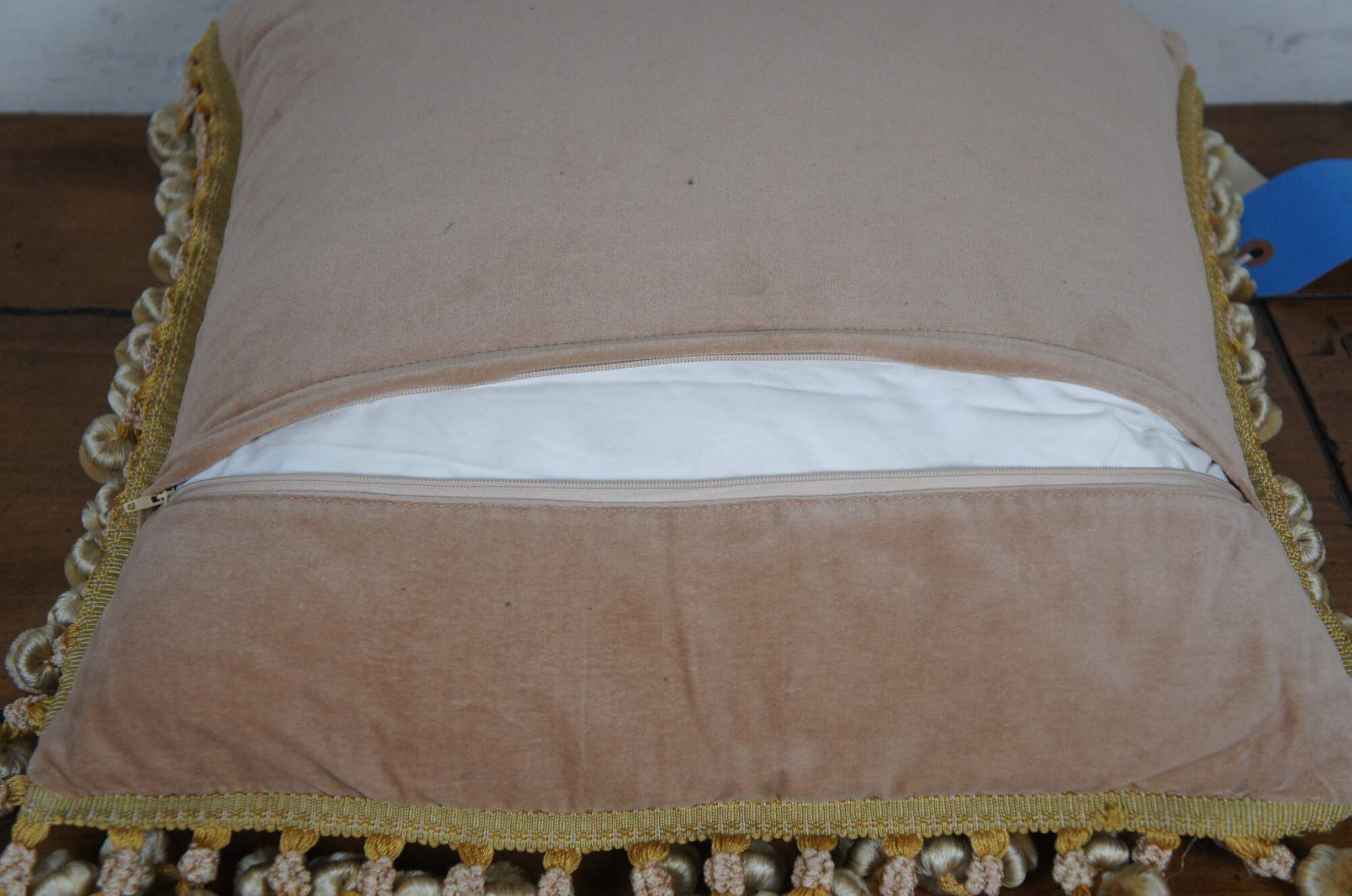 2 Available - 20th century square throw pillow, embroidered in silk with leafy stems of large yellow and pink roses. Cream and gold ball tassel trim. Light brown velour back with zipper closure.