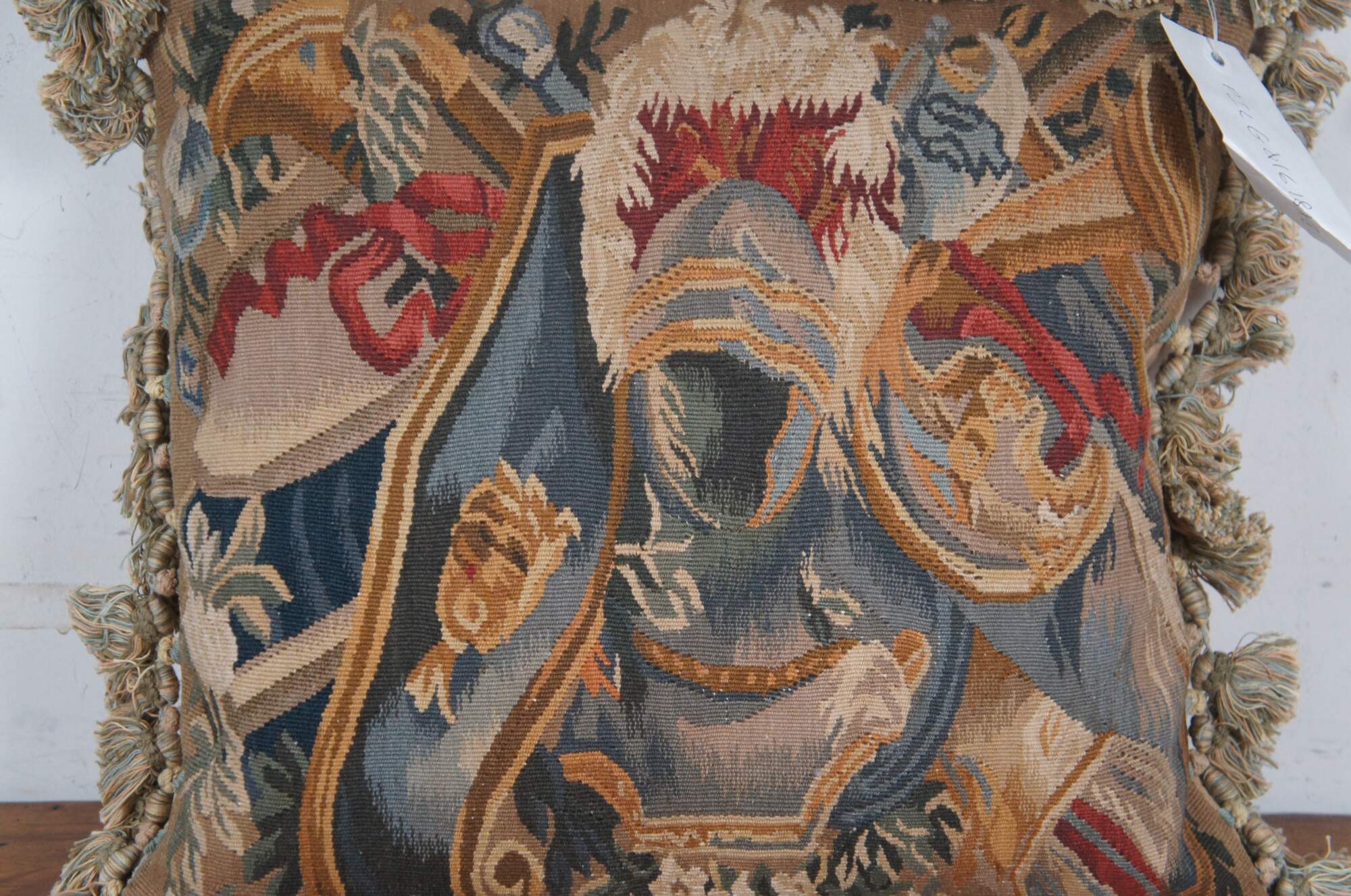 2 Available - 20th century square throw pillow, embroidered with the image of a knight in armor, flanked with trumpets and ribbons. Brown and green tassel trim. Light brown velour back with zipper closure. Down filled.