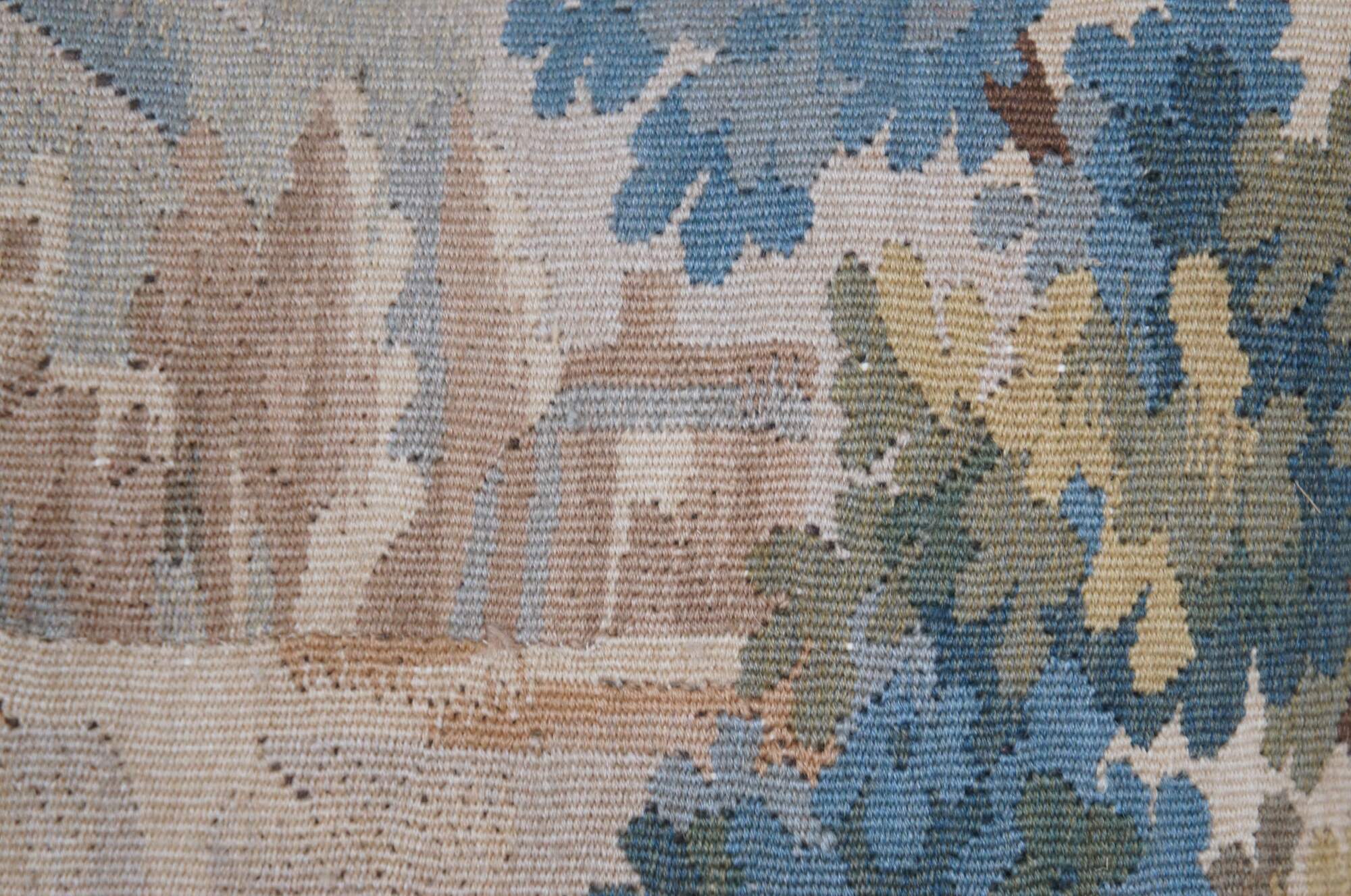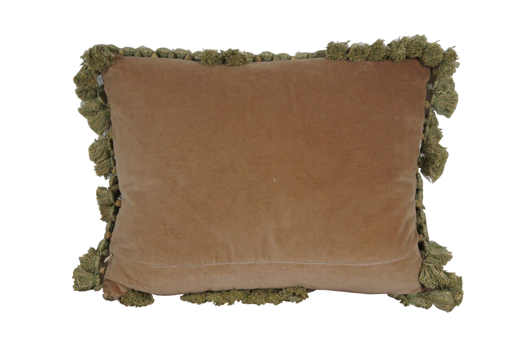 20th century French Aubusson style rectangular lumbar / throw pillow, embroidered with a cottage in a forested landscape, with a castle in the background. Cream and green tassel trim. Light brown velour back with zipper closure. Down filled.