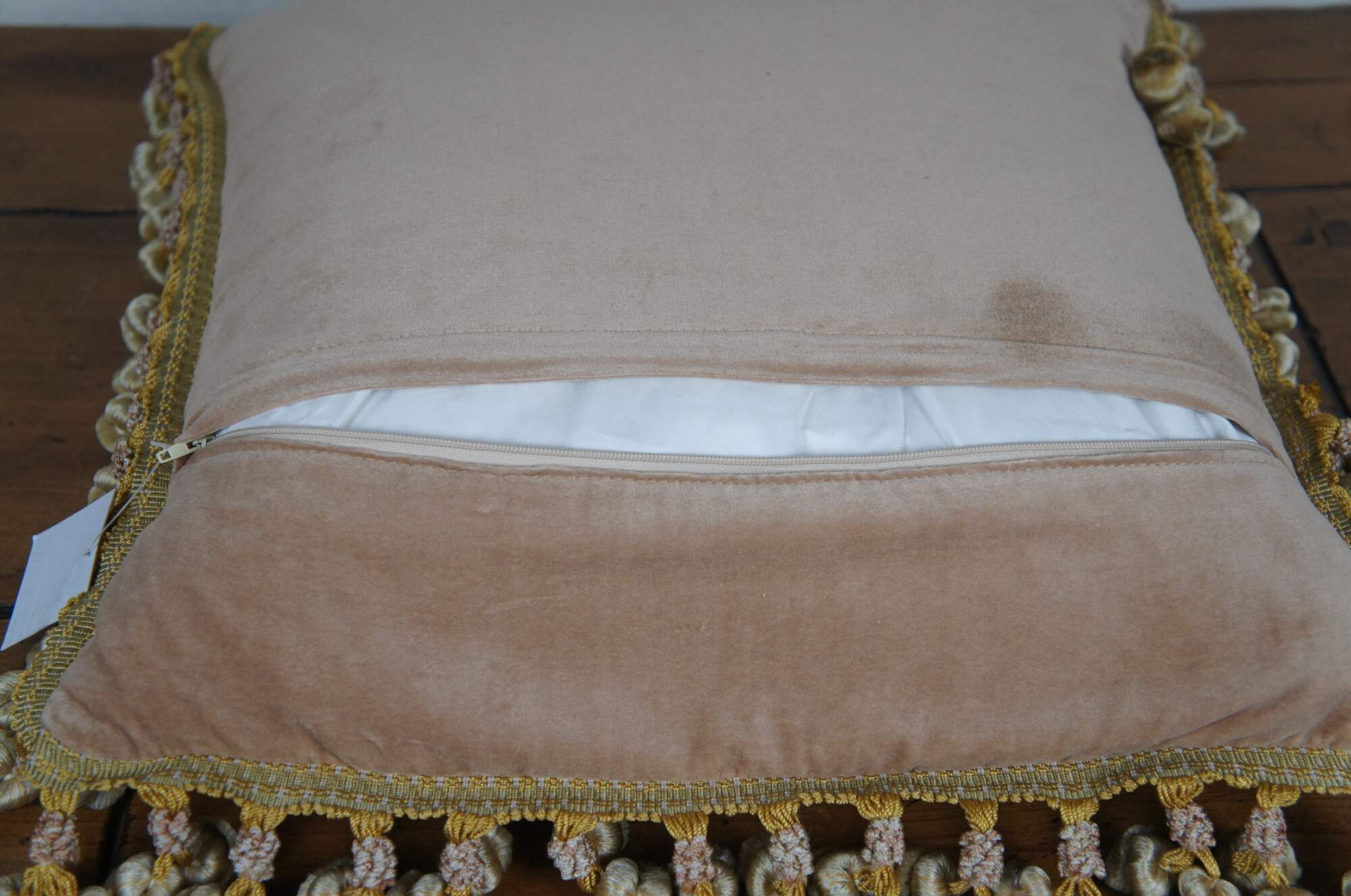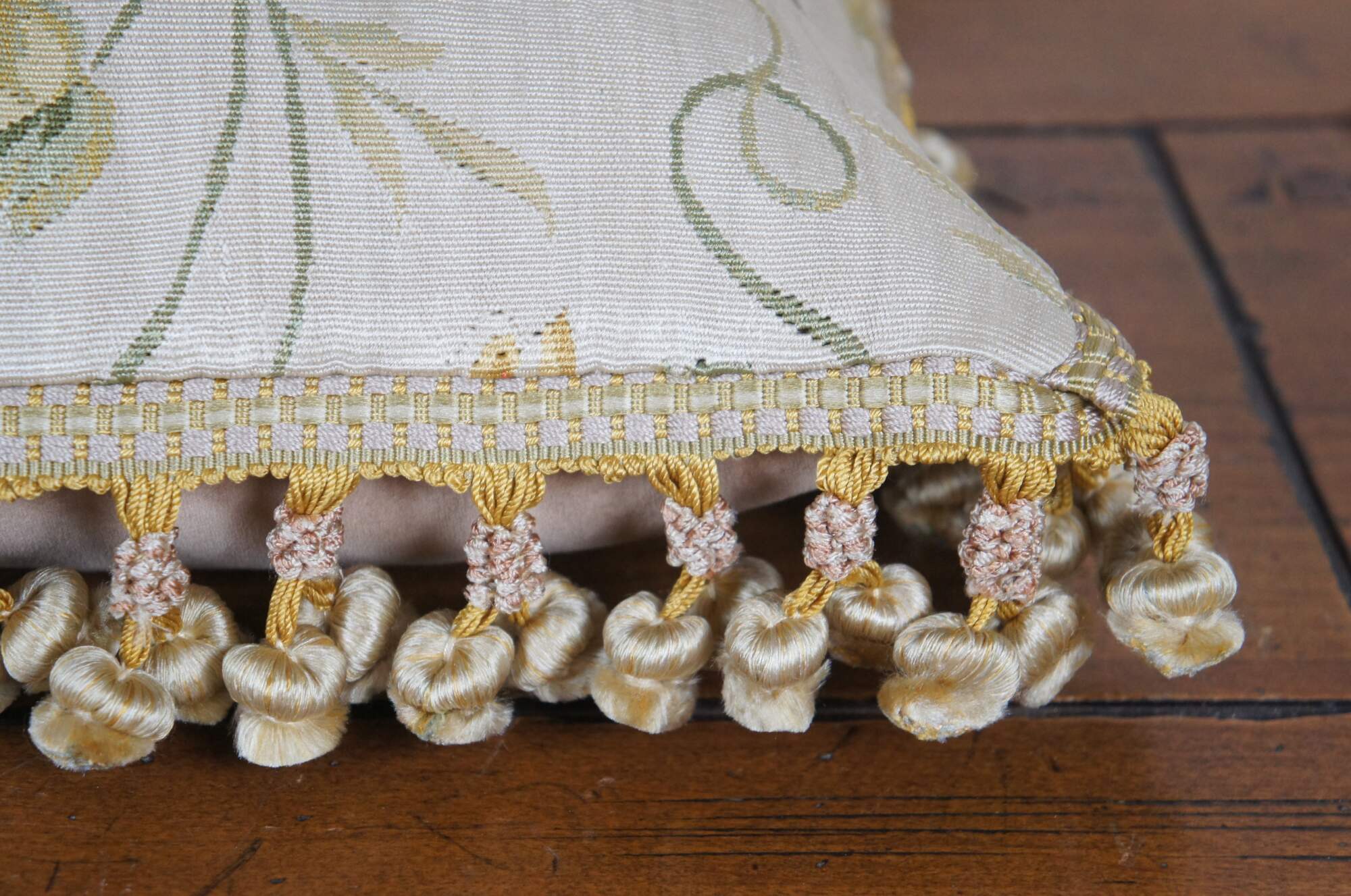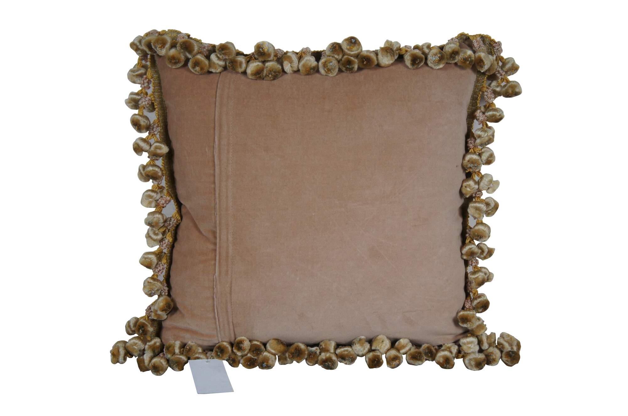 2 Available - 20th century square throw pillow, embroidered in silk with twisting green leafy stems sporting pink, blue, and orange morning glories. Cream and gold ball tassel trim. Beige velour back with zipper closure. Down filled.