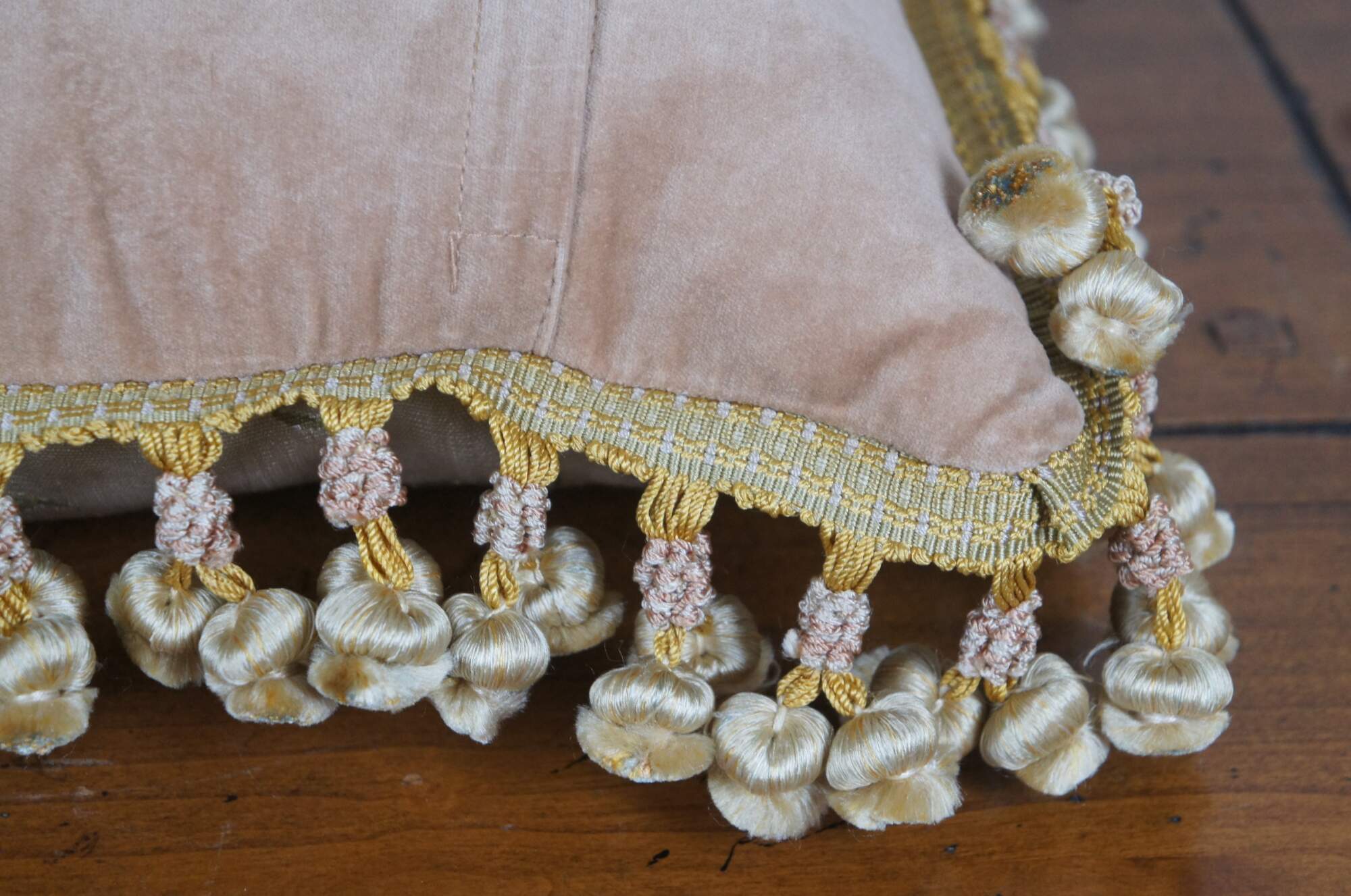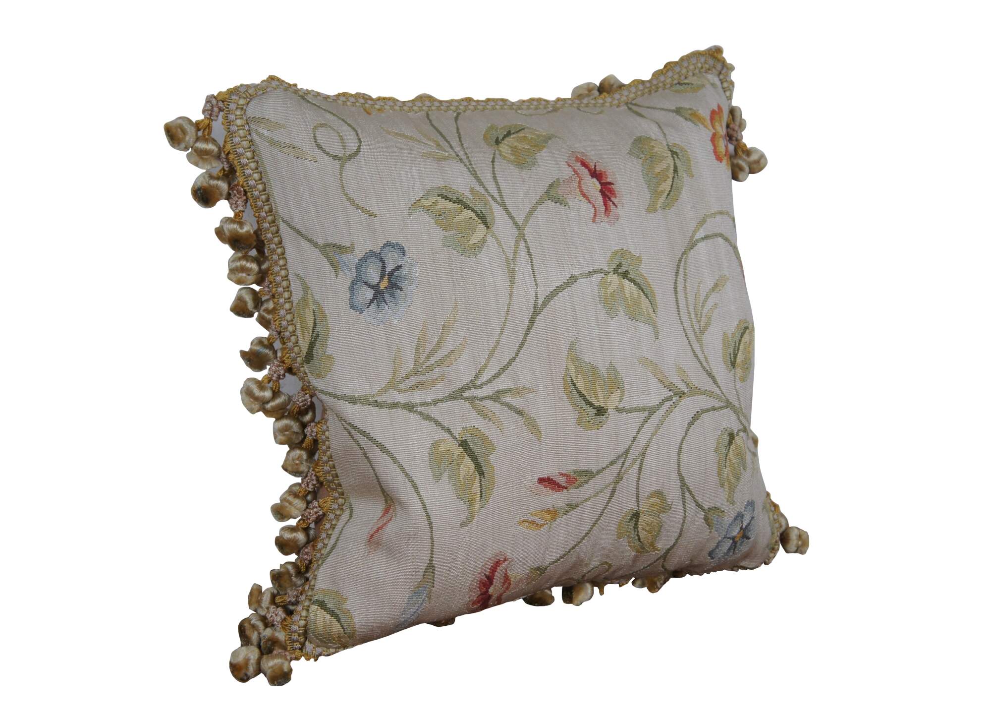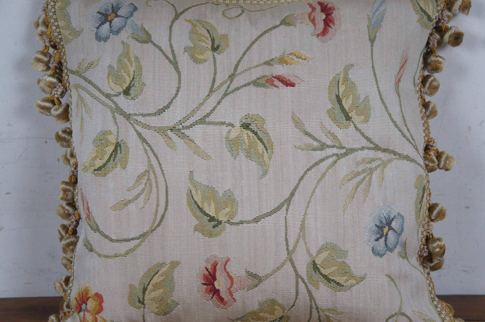 2 Available - 20th century square throw pillow, embroidered in silk with twisting green leafy stems sporting pink, blue, and orange morning glories. Cream and gold ball tassel trim. Beige velour back with zipper closure. Down filled.