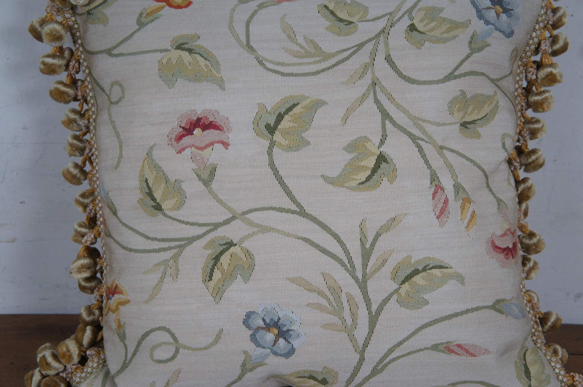 2 Available - 20th century square throw pillow, embroidered in silk with twisting green leafy stems sporting pink, blue, and orange morning glories. Cream and gold ball tassel trim. Beige velour back with zipper closure. Down filled.