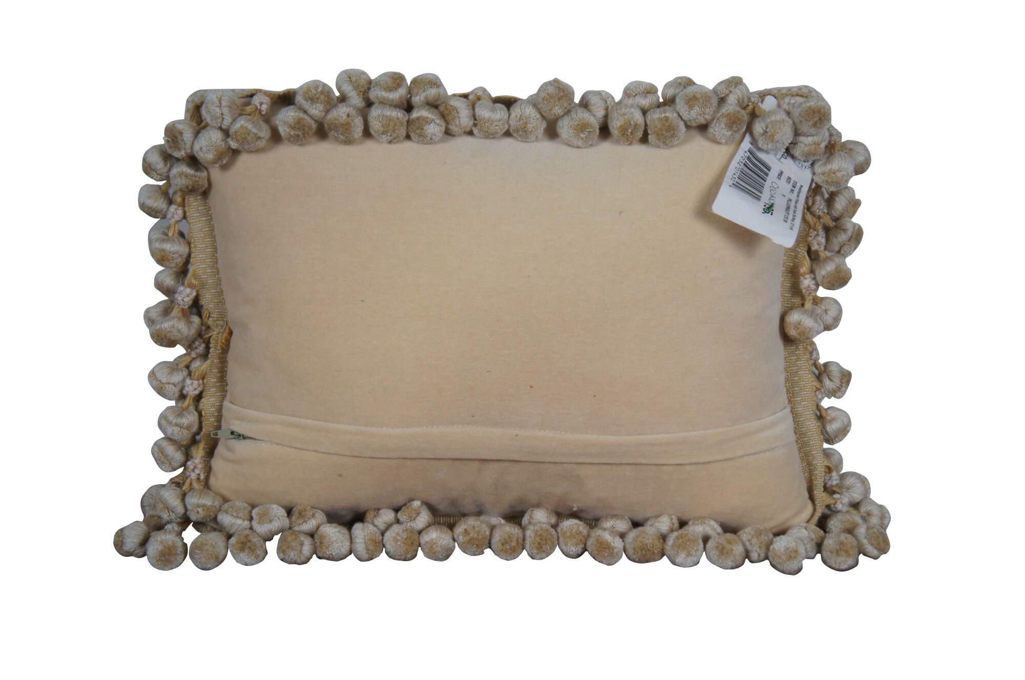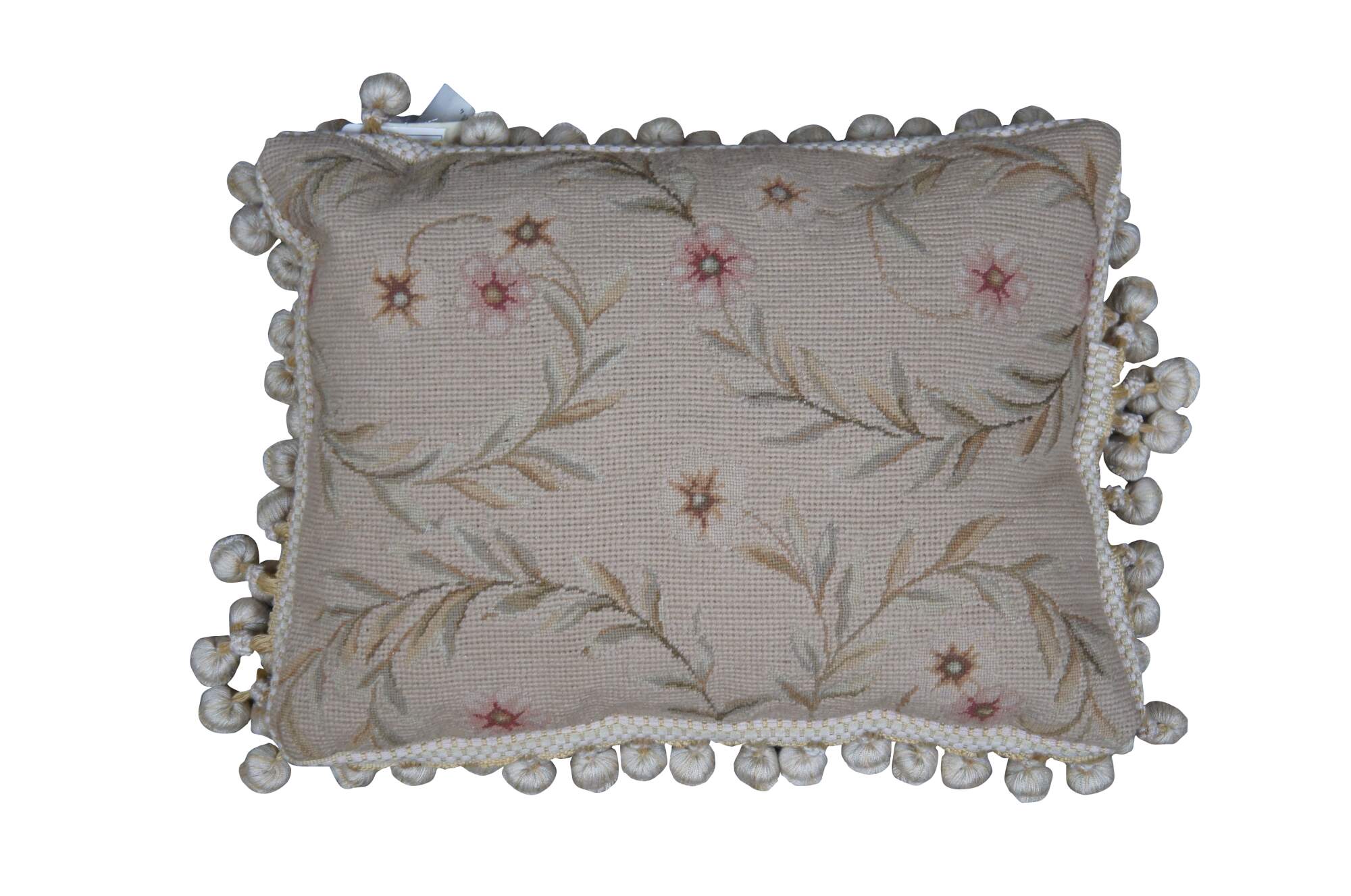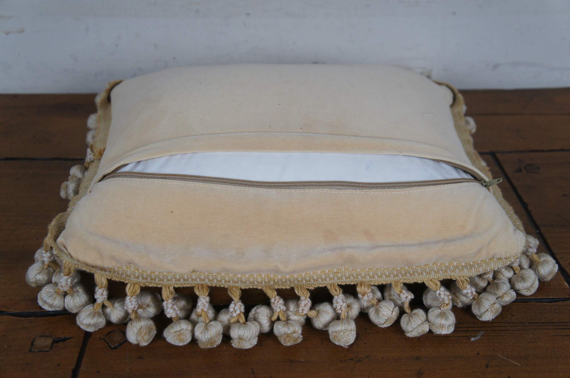 20th century rectangular lumbar / throw pillow, hand embroidered with pink and cream flowers on spiraling leafy stems, over a beige background. Cream and gold ball tassel trim. Cream velour back with zipper closure. Down filled.