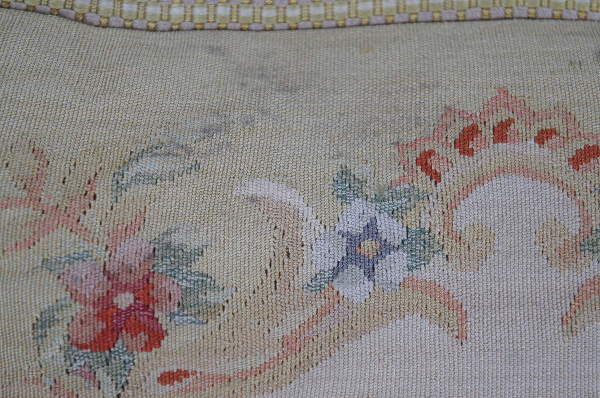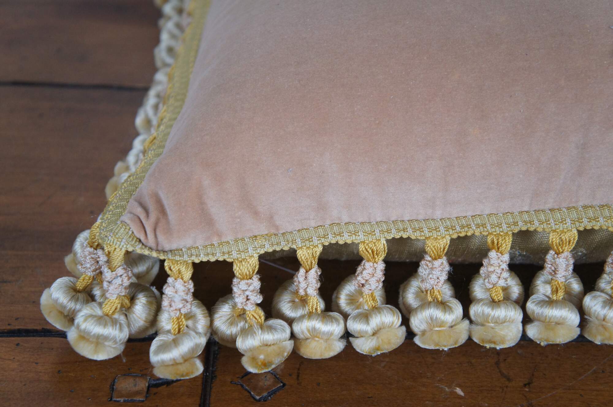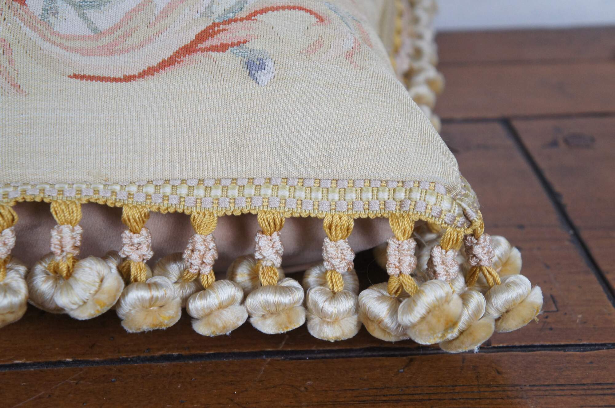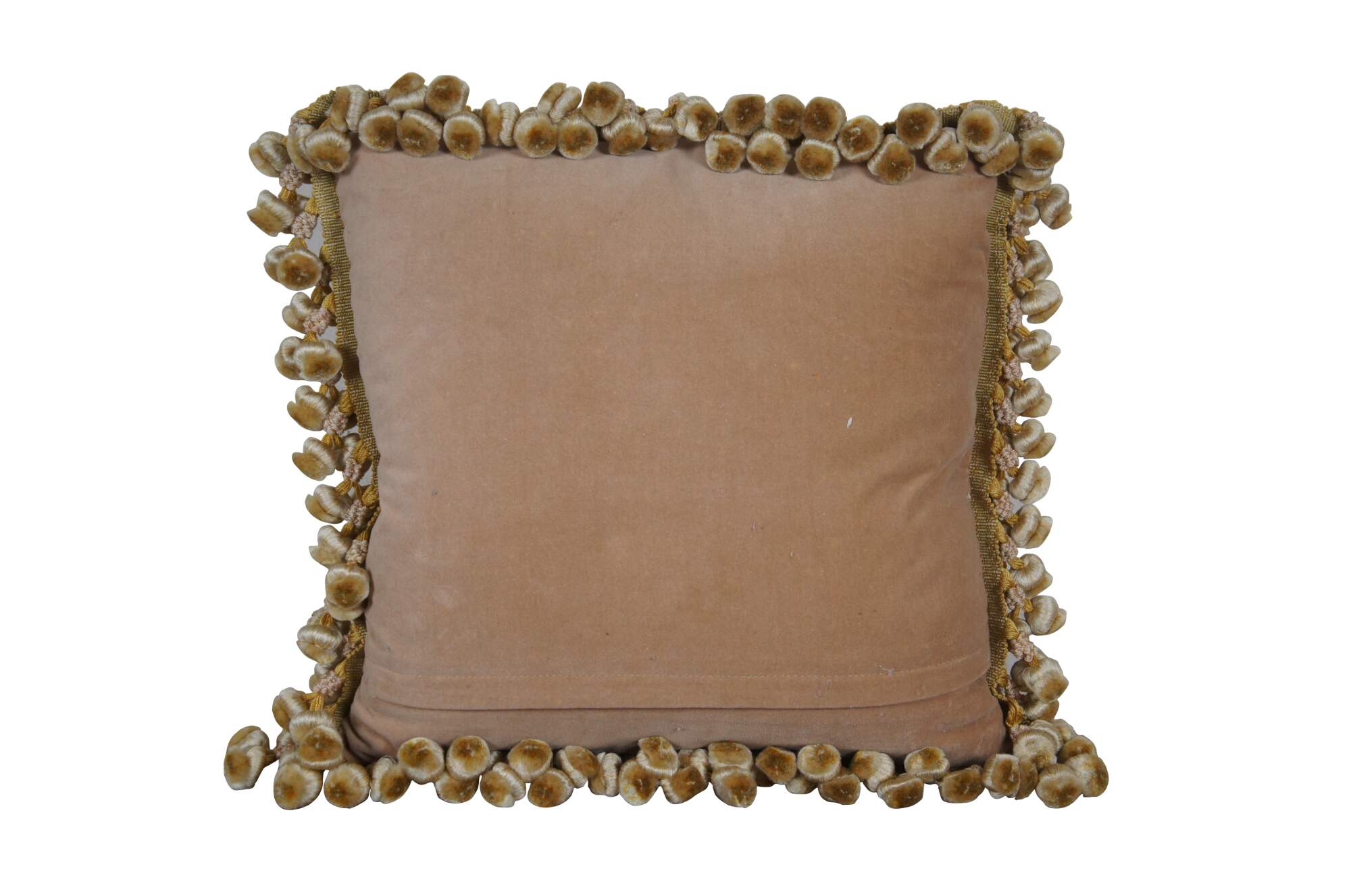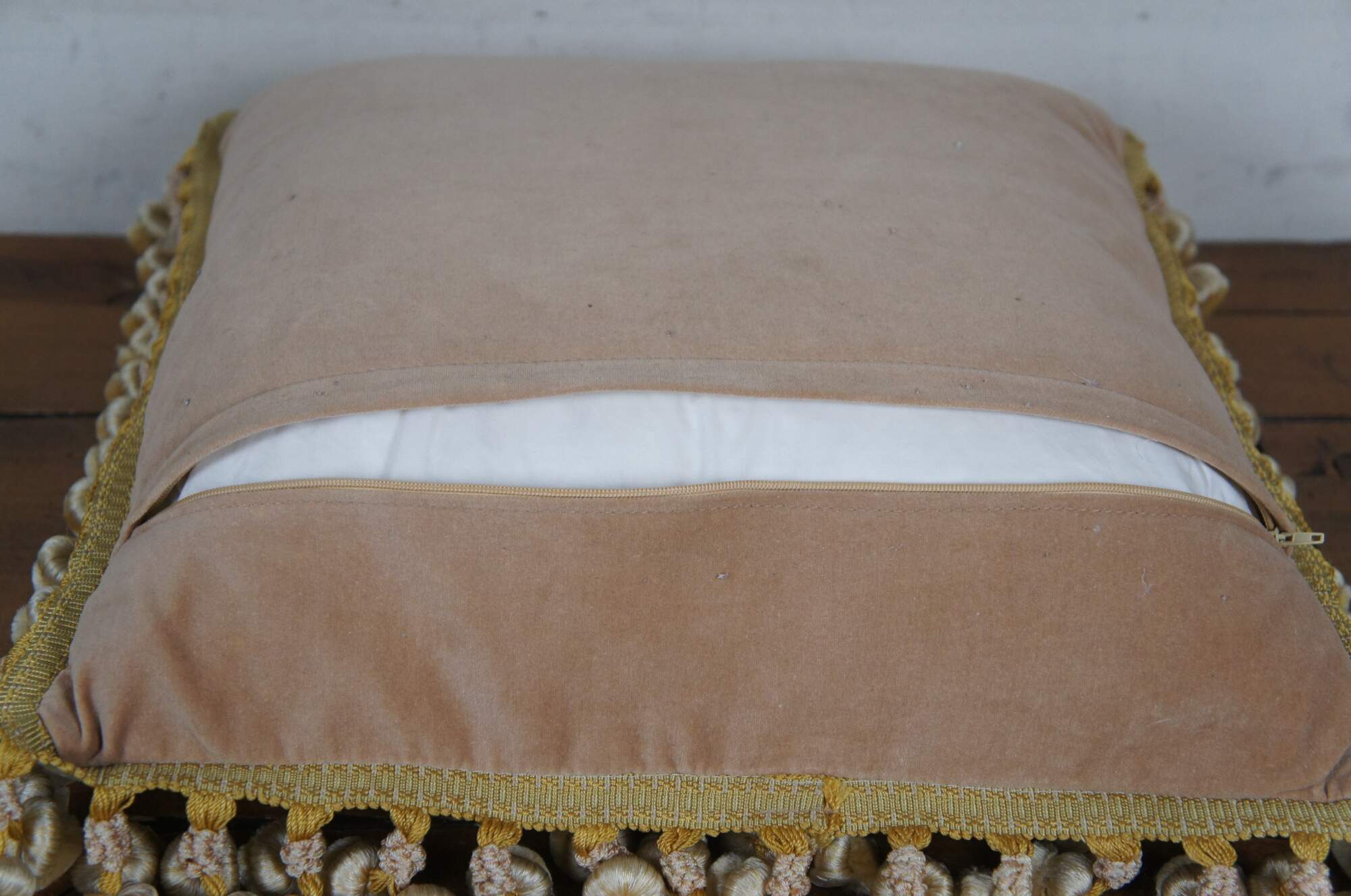 20th century square throw pillow, embroidered in silk with a bouquet of pink and blue flowers, surrounded by a swirling, peach, foliate frame. Gold and cream ball tassel trim. Beige velour back with zipper closure. Down filled.