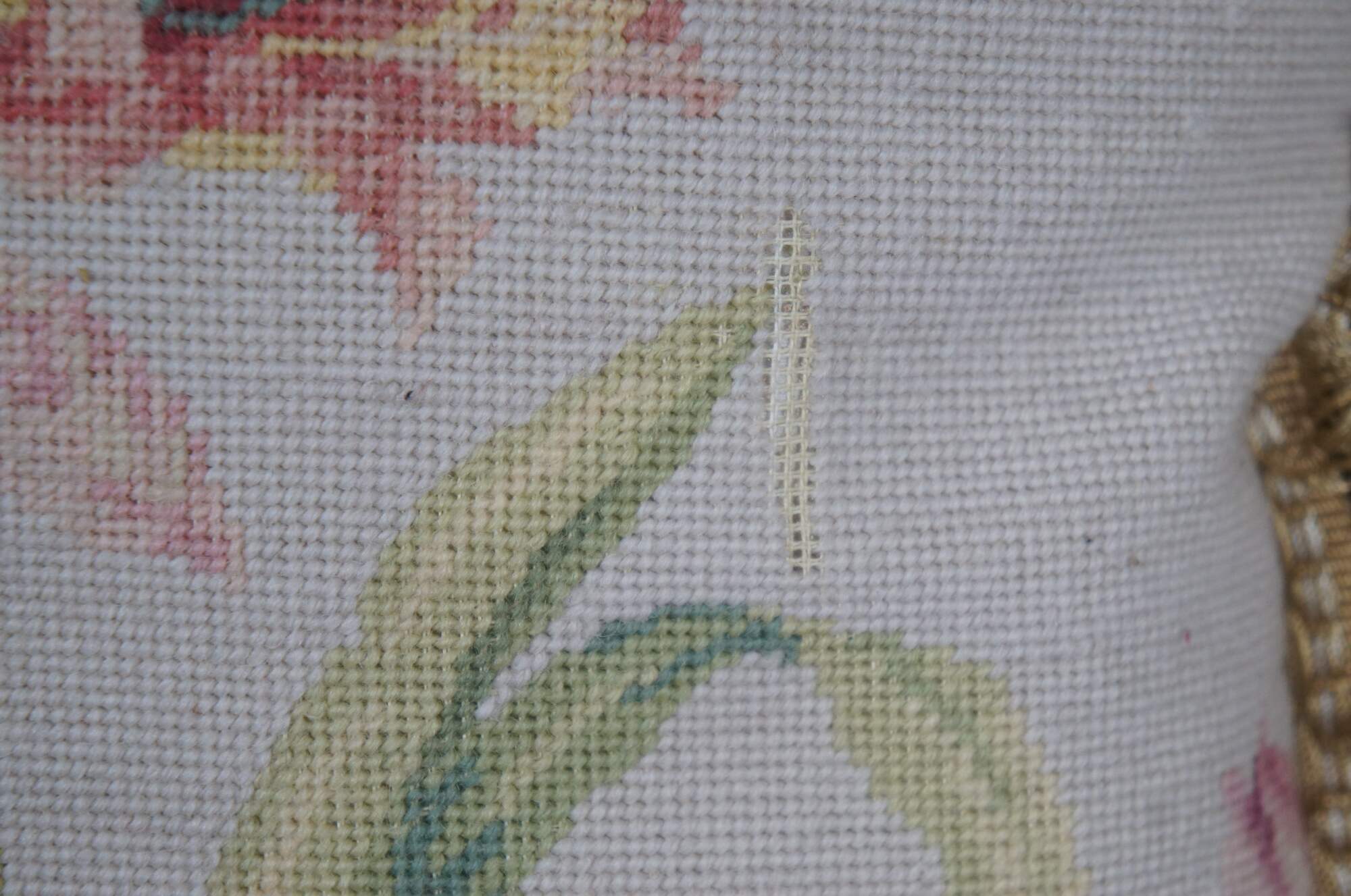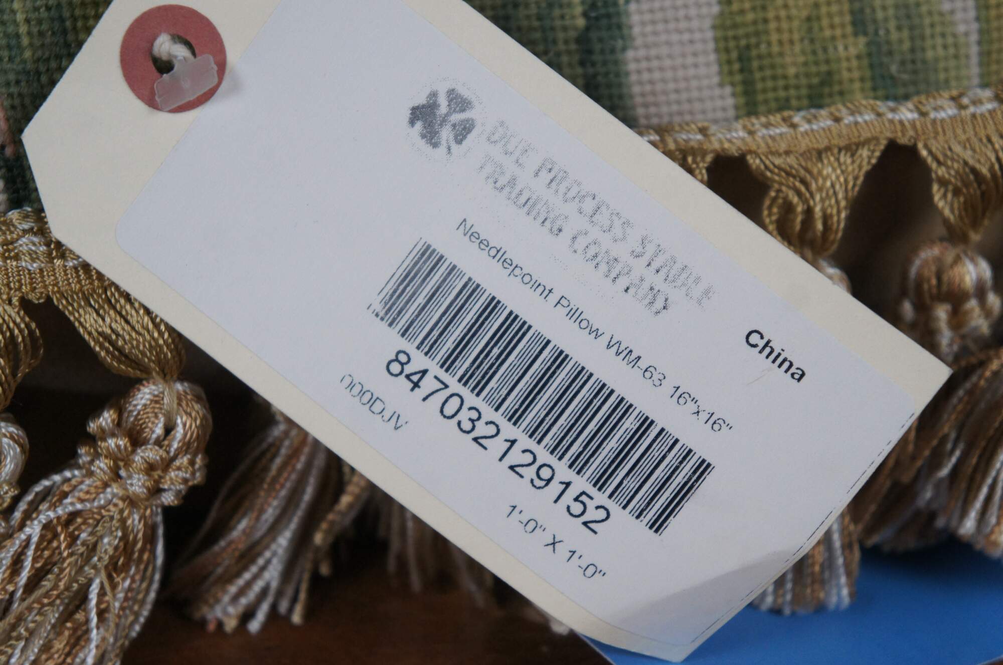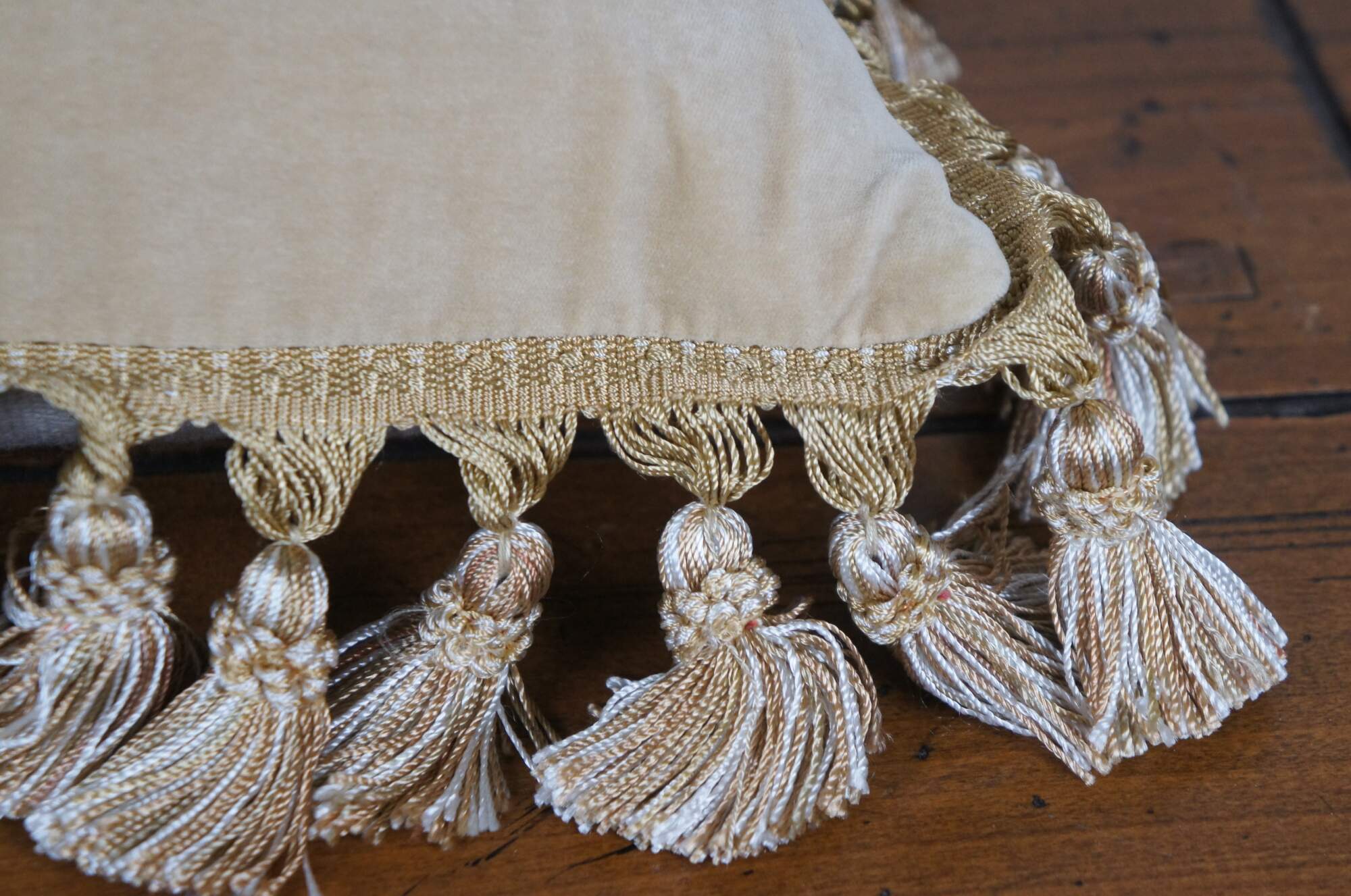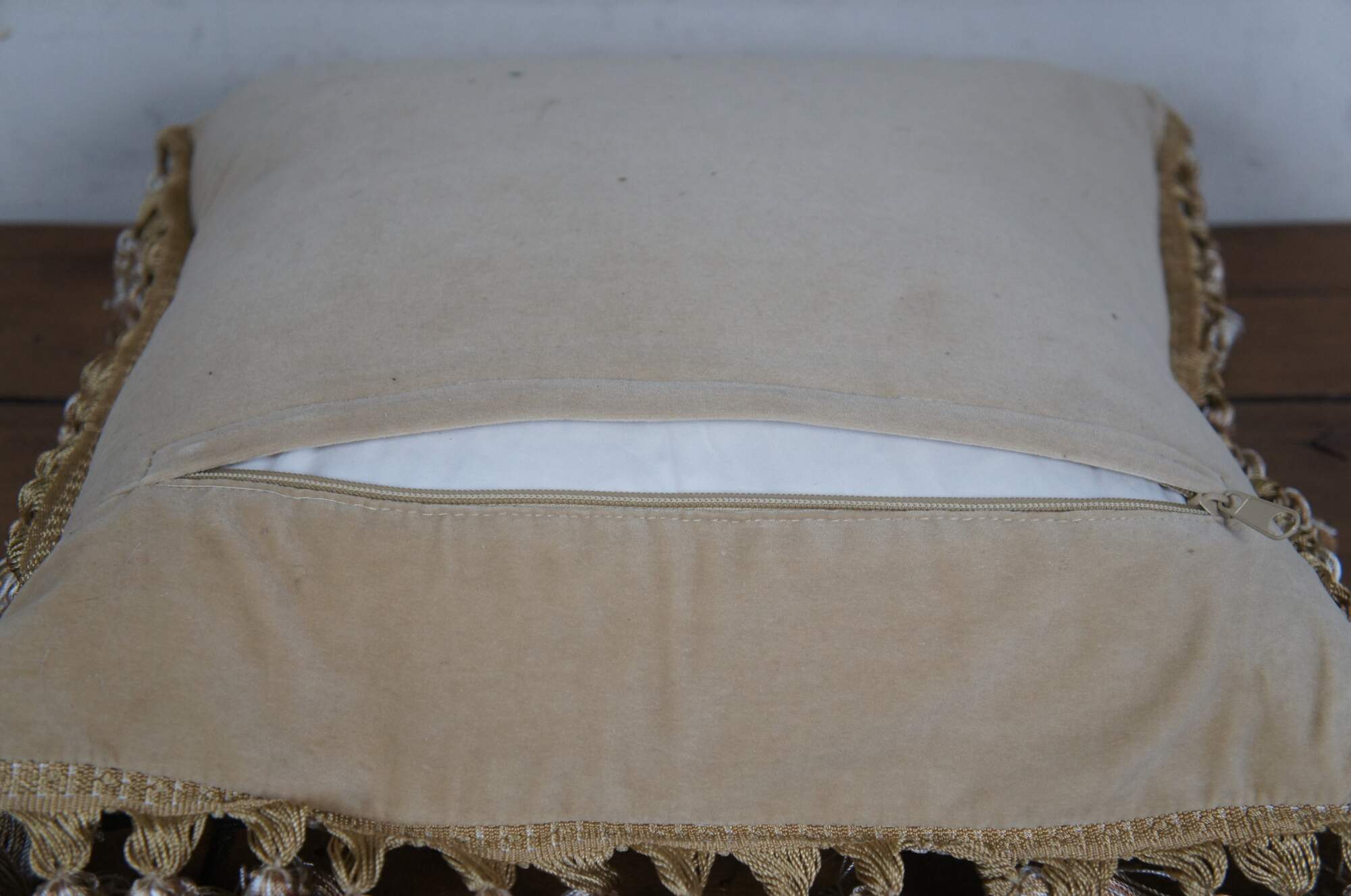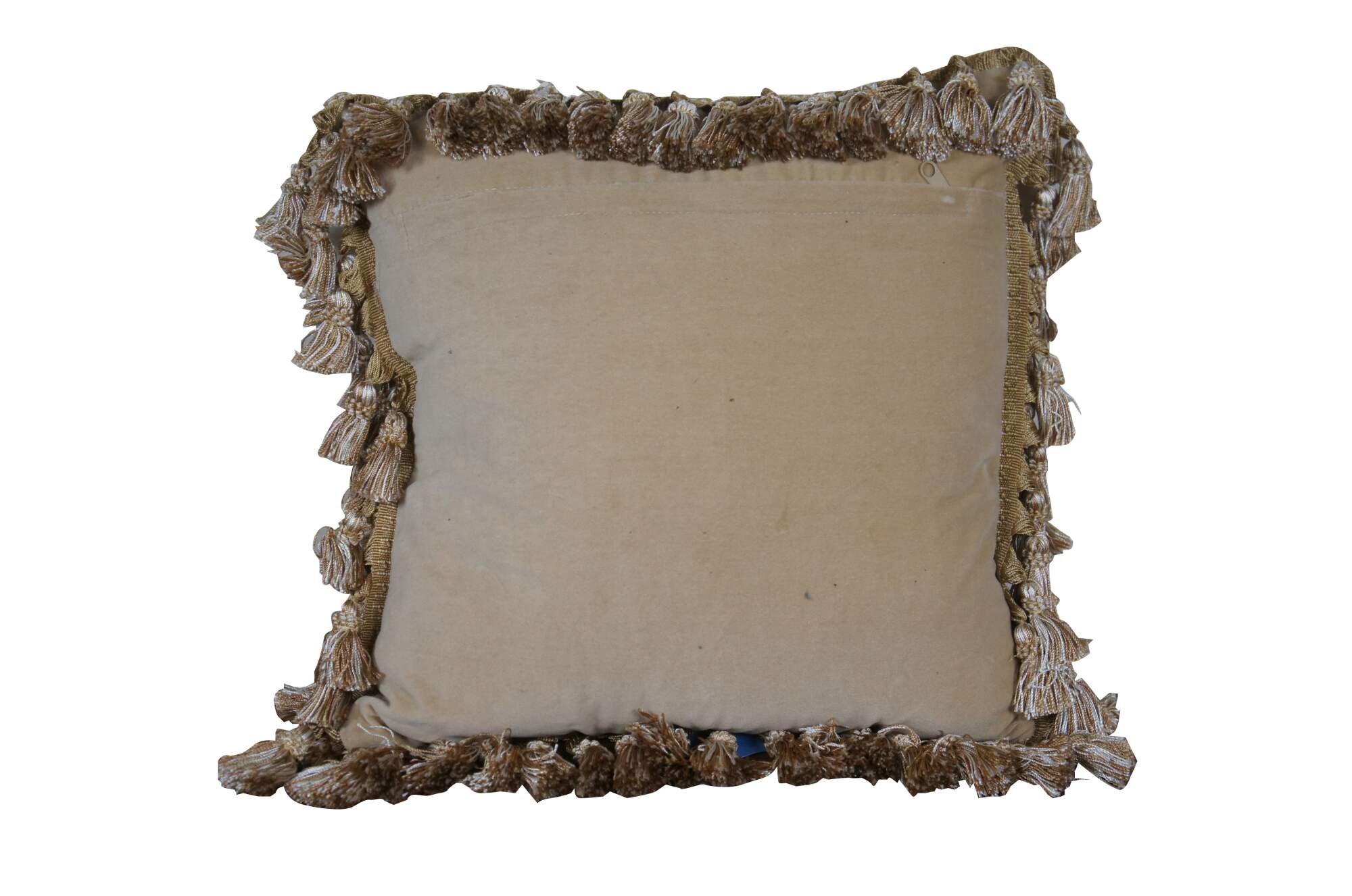 20th century square throw pillow, hand embroidered with a floral garden view of pink, yellow, and blue lilies, tulips, and irises. Beige and white tassel trim. Beige velour back with zipper closure. Down filled.