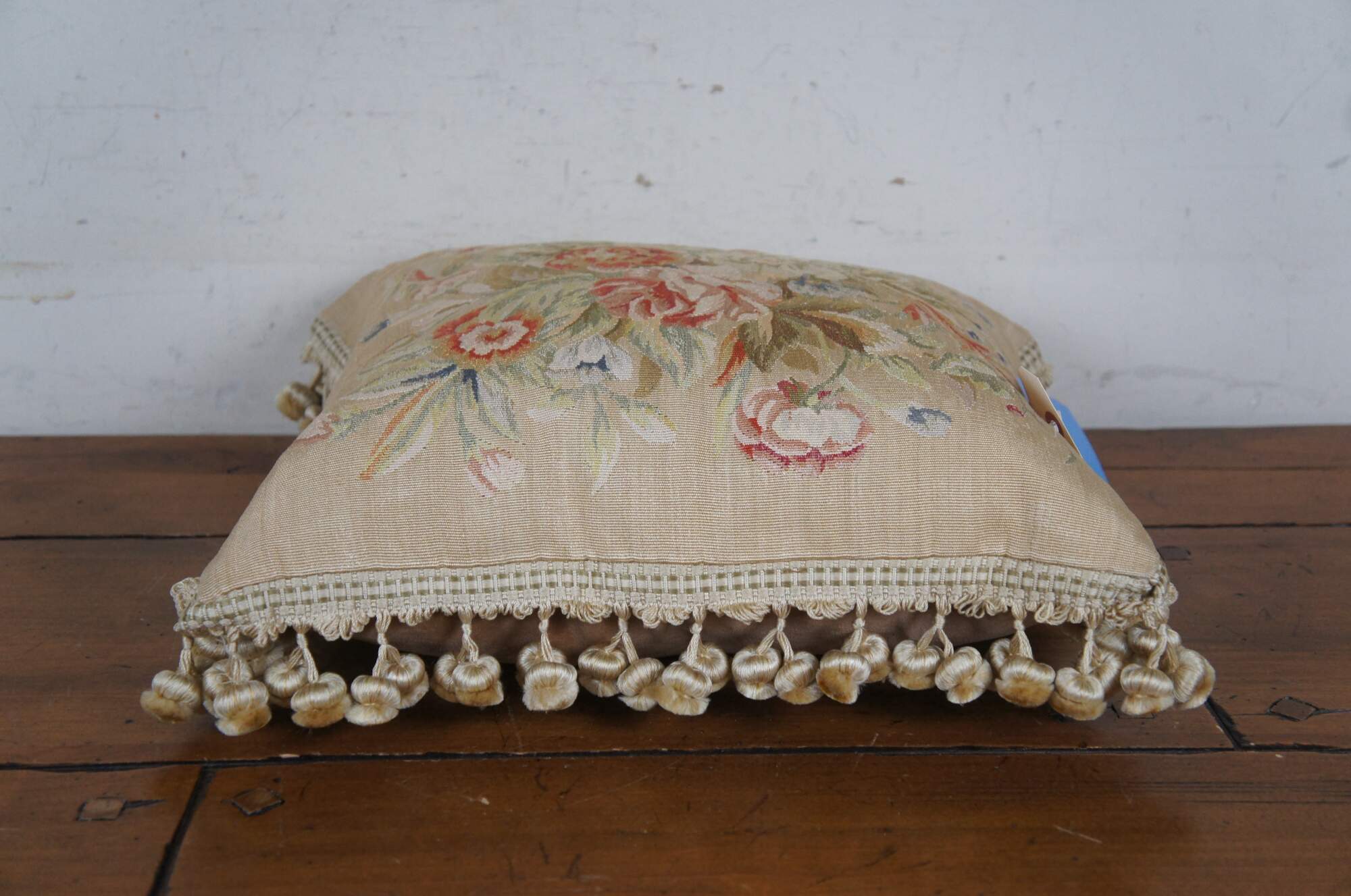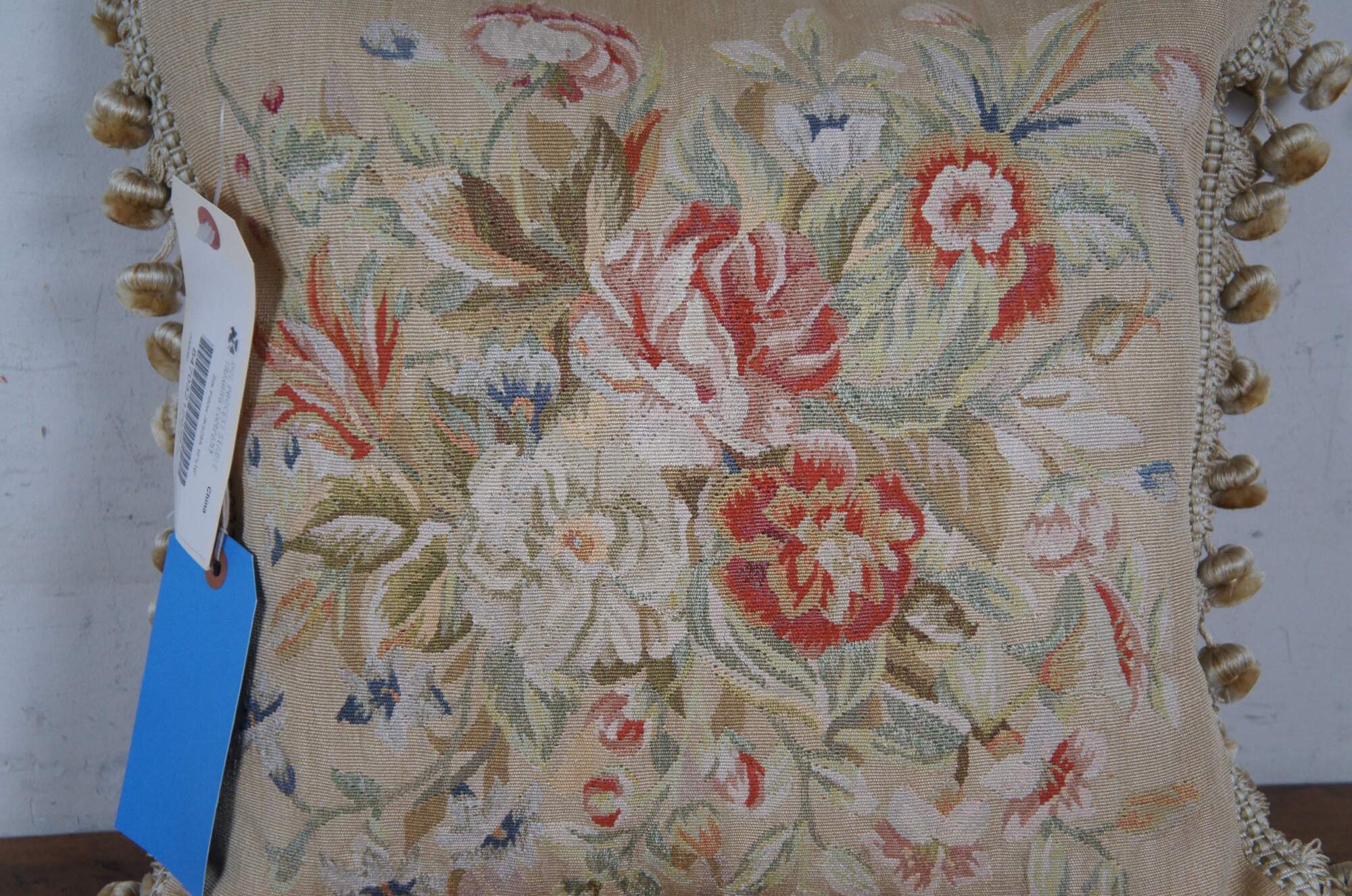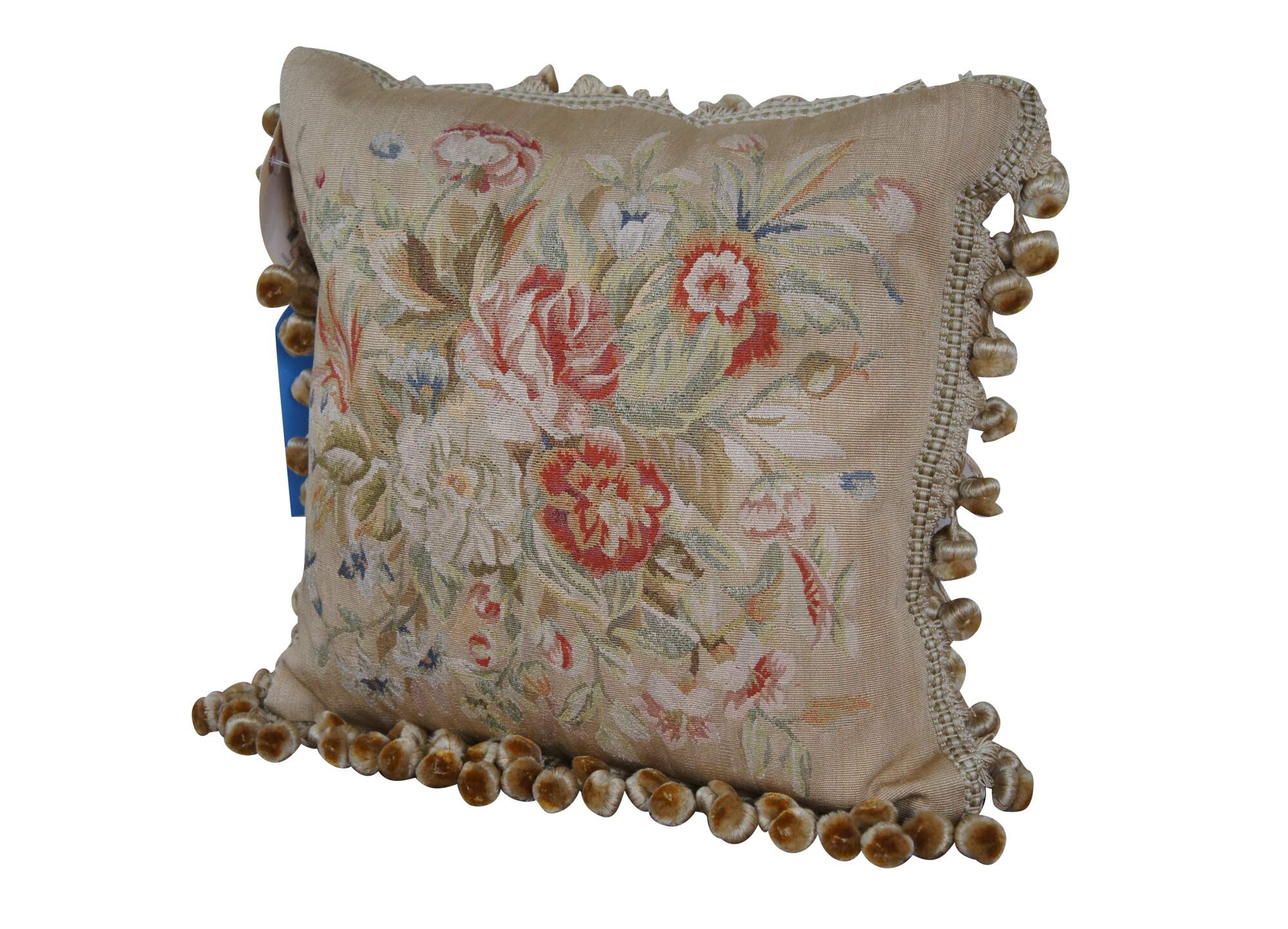 20th century square throw pillow, embroidered in silk with a leafy bouquet of red, pink, orange, and blue flowers. Light beige ball tassel trim. Light brown velour back with zipper closure. Down filled.