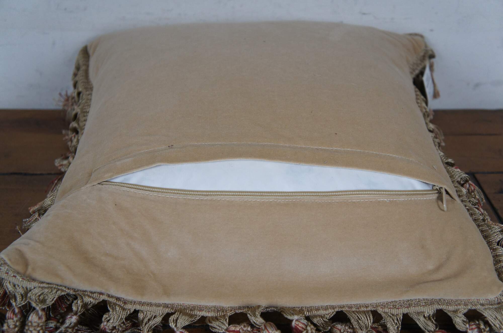 2 Available - 20th century square needlepoint throw pillow, hand embroidered in wool with a bouquet of pink, rust, yellow, and blue roses / flowers on a backdrop of beige leaves. Beige and red tassel trim. Beige velour back with zipper closure. Down filled. Made in China.