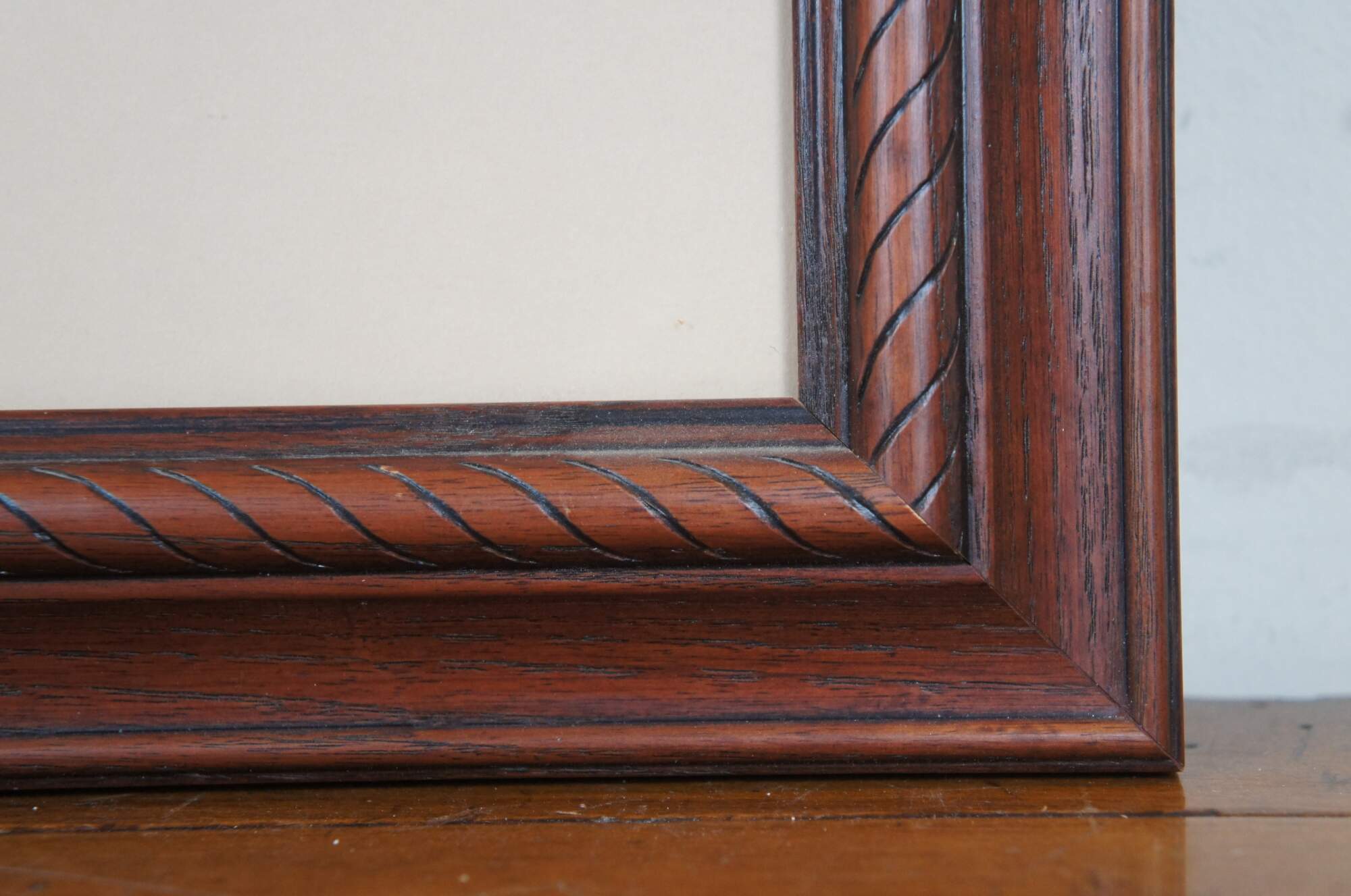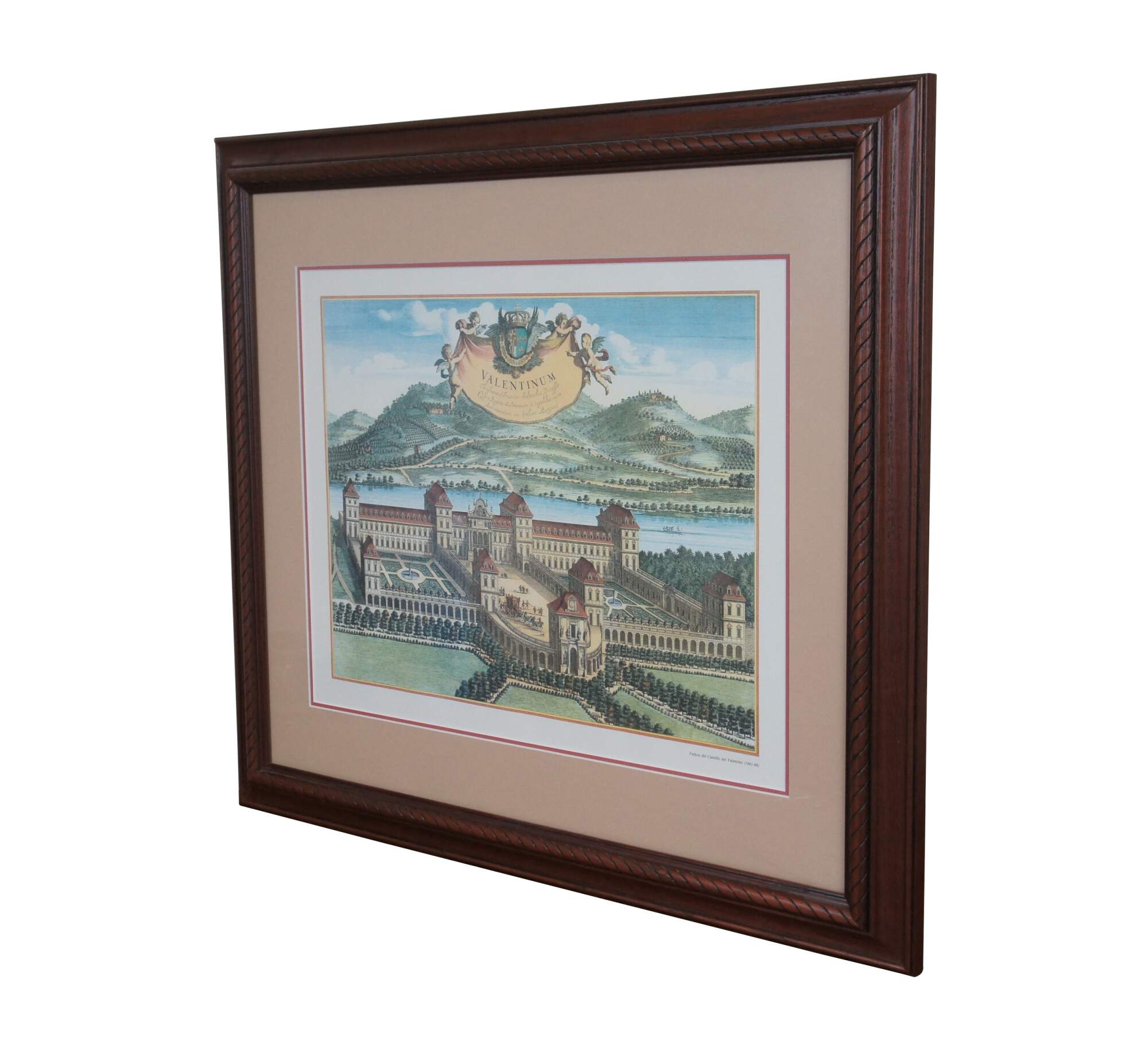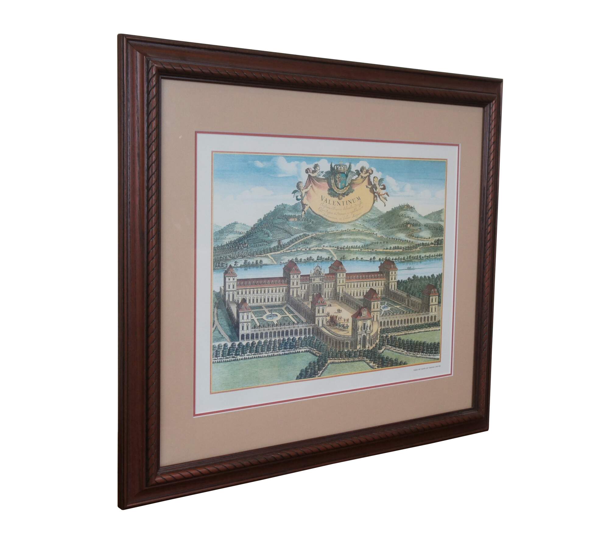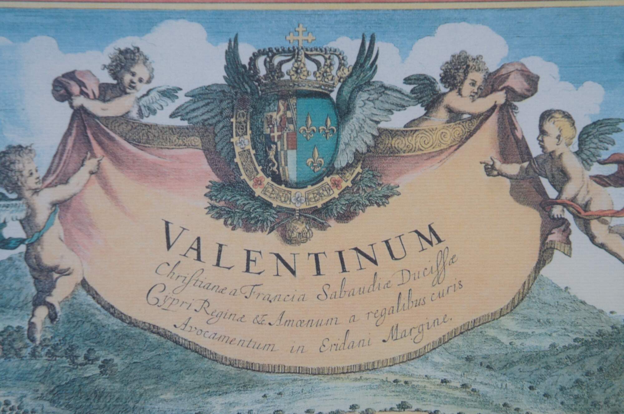 20th century color print of Valentinum / Veduta del Castello del Valentino (1661-68) aka View of the Valentino Castle by Joan Blaeu, showing a bird's eye view of the Italian castle, river and countryside, with identifying banner held aloft by a group of cherubs. Beige and red layered mat; wood frame with bevel edge and rounded rope twist detail.