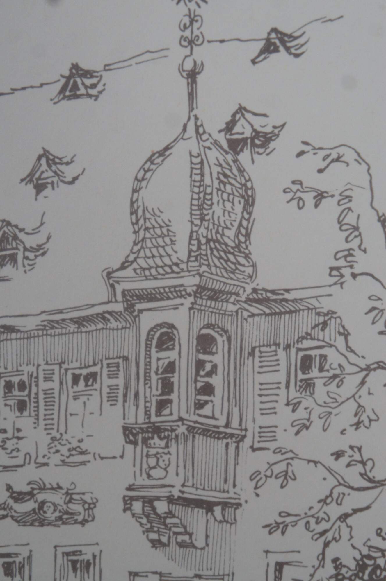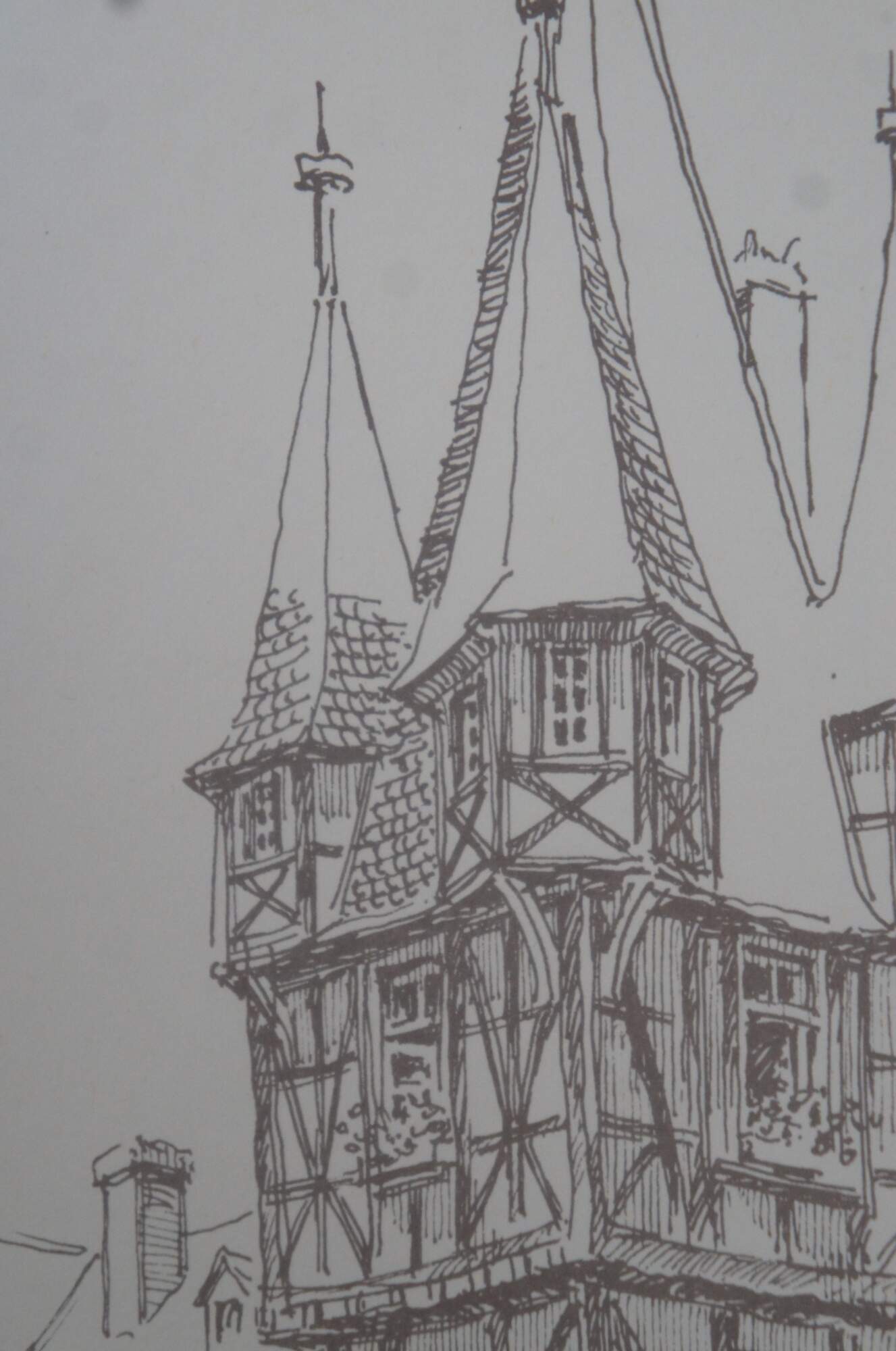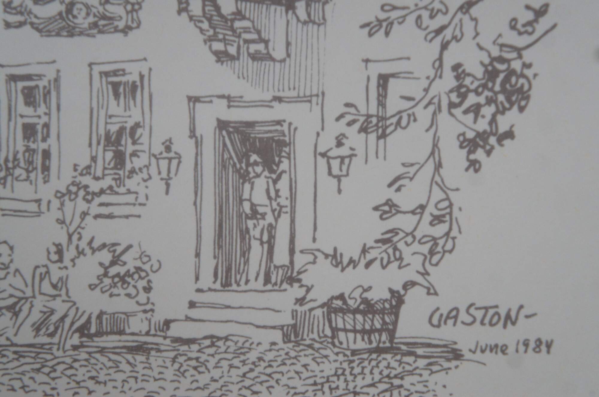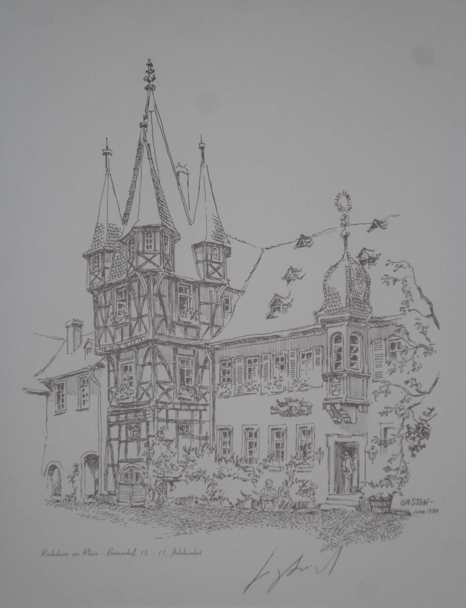 Vintage print by Gaston, June 1984, titled "Rudesheim am Rhein - Bromserhof, 15 - 17 Jahrhundert," showing the Tudor / Black Forest style facade of the Bromserhof manor house. Light and dark gray layered mat; beveled wood frame with black outer edge.