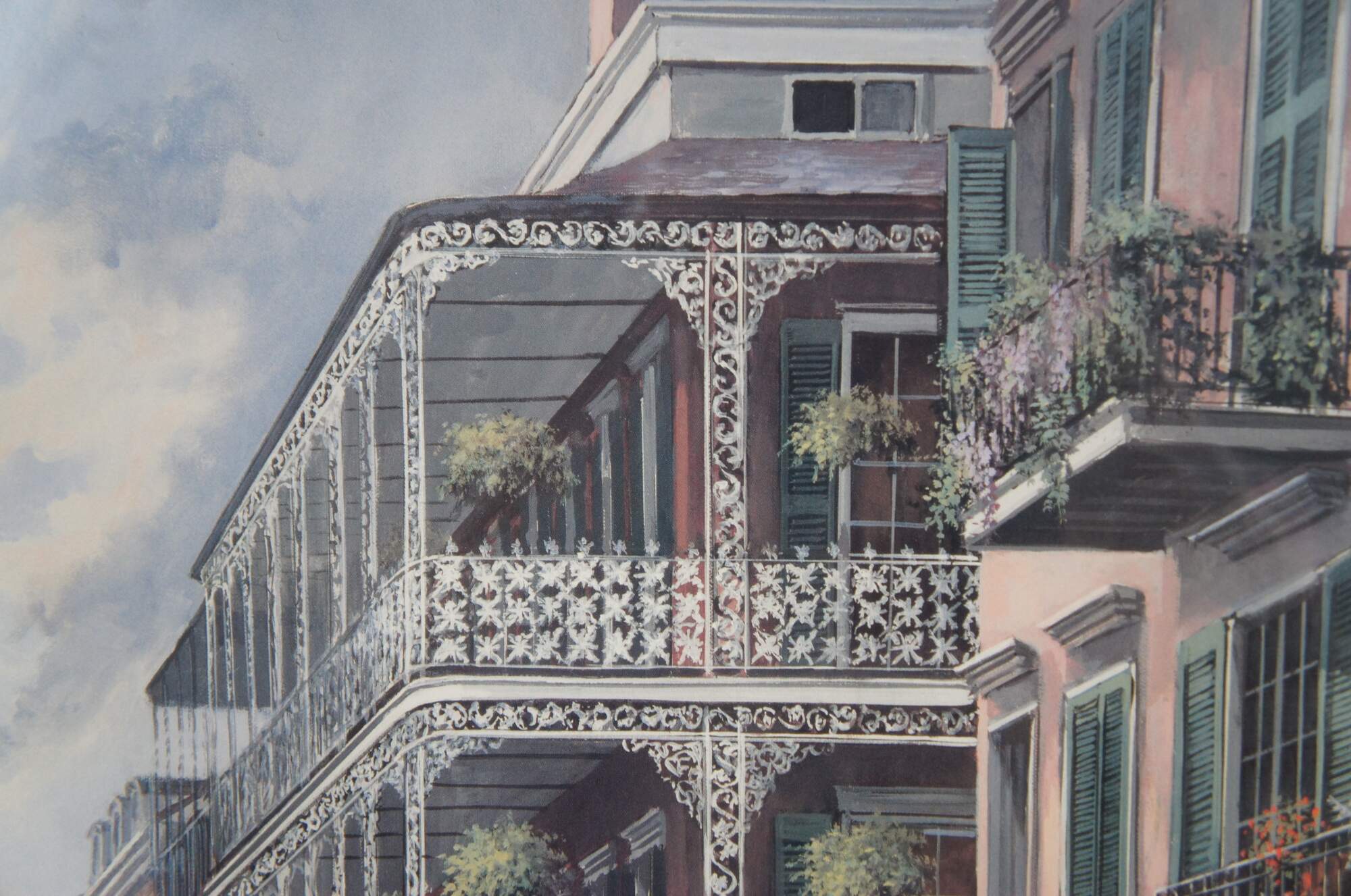 Vintage late 1990s print by Al Federico titled "Royal Street - 1890," showing the titular street in New Orleans' French Quarter, imagined as it would have been in the late Victorian era. Marker signed and numbered 56/1950 in lower left. Dark green and pale pink multi-layered mat; gilded frame with swirling foliate carved details.