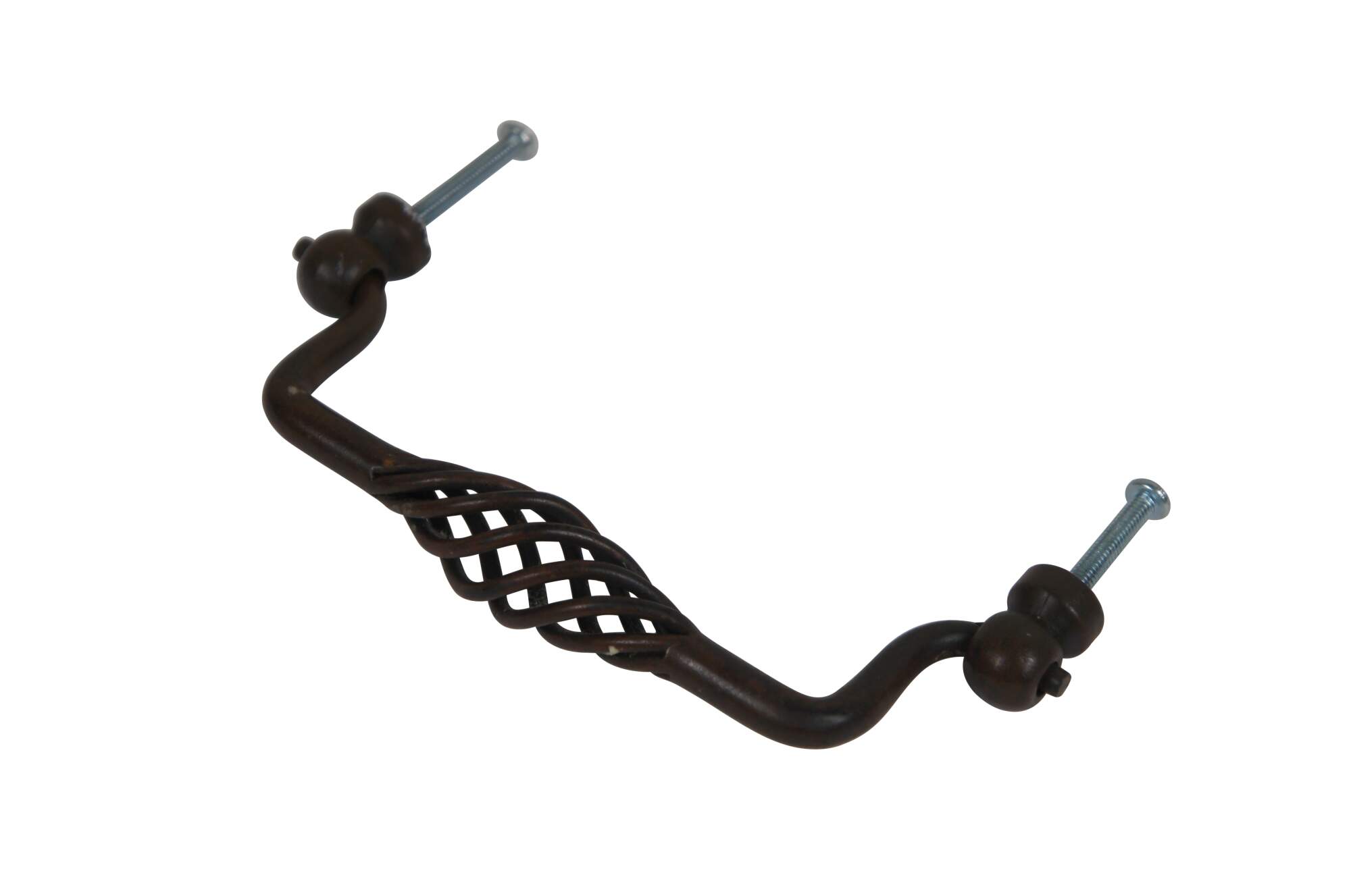 8 Available - Hole Centers 5" - Twisted metal birdcage / swiveling bail style drawer pull, finished in deep brown / dark bronze.
