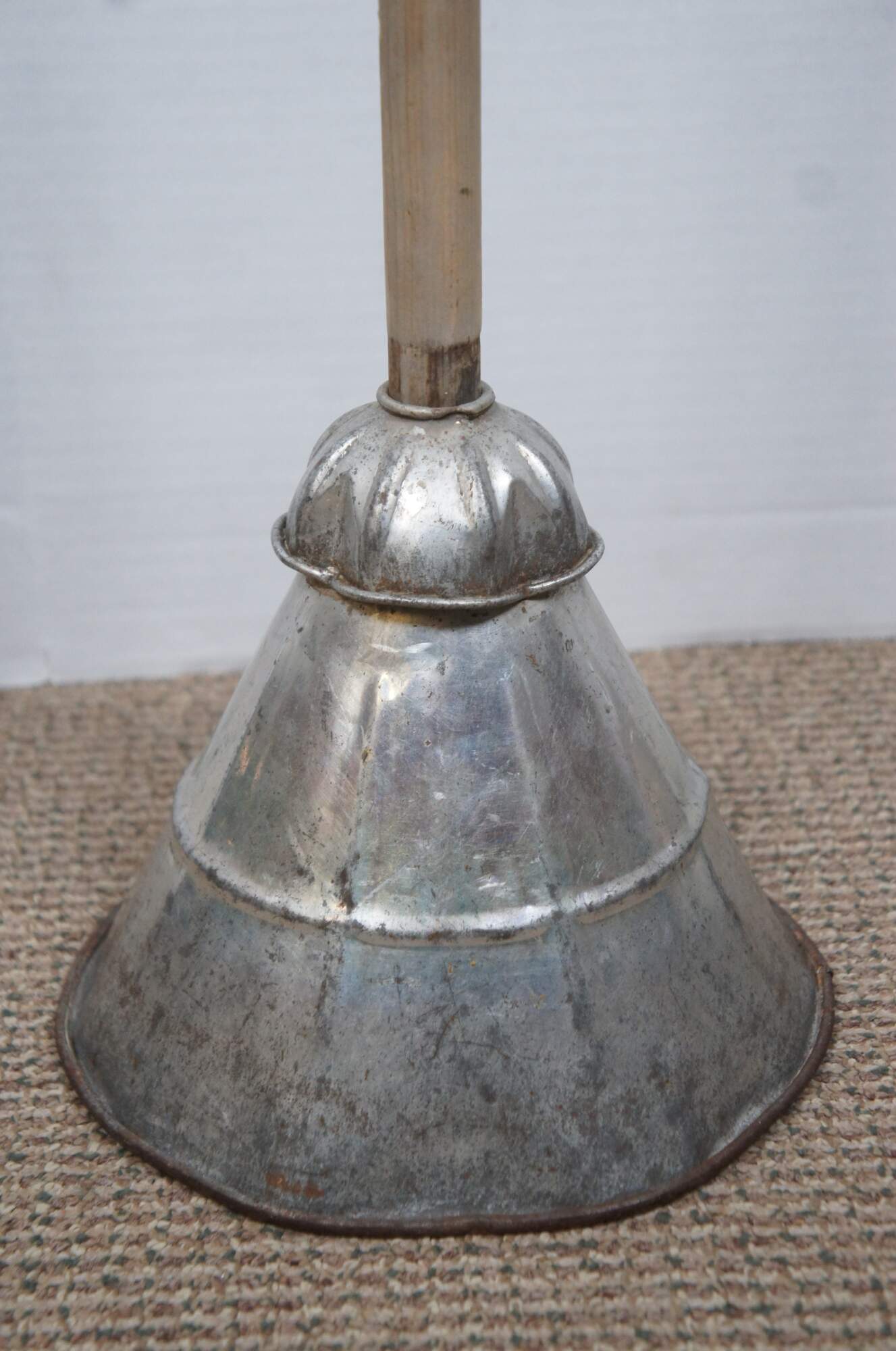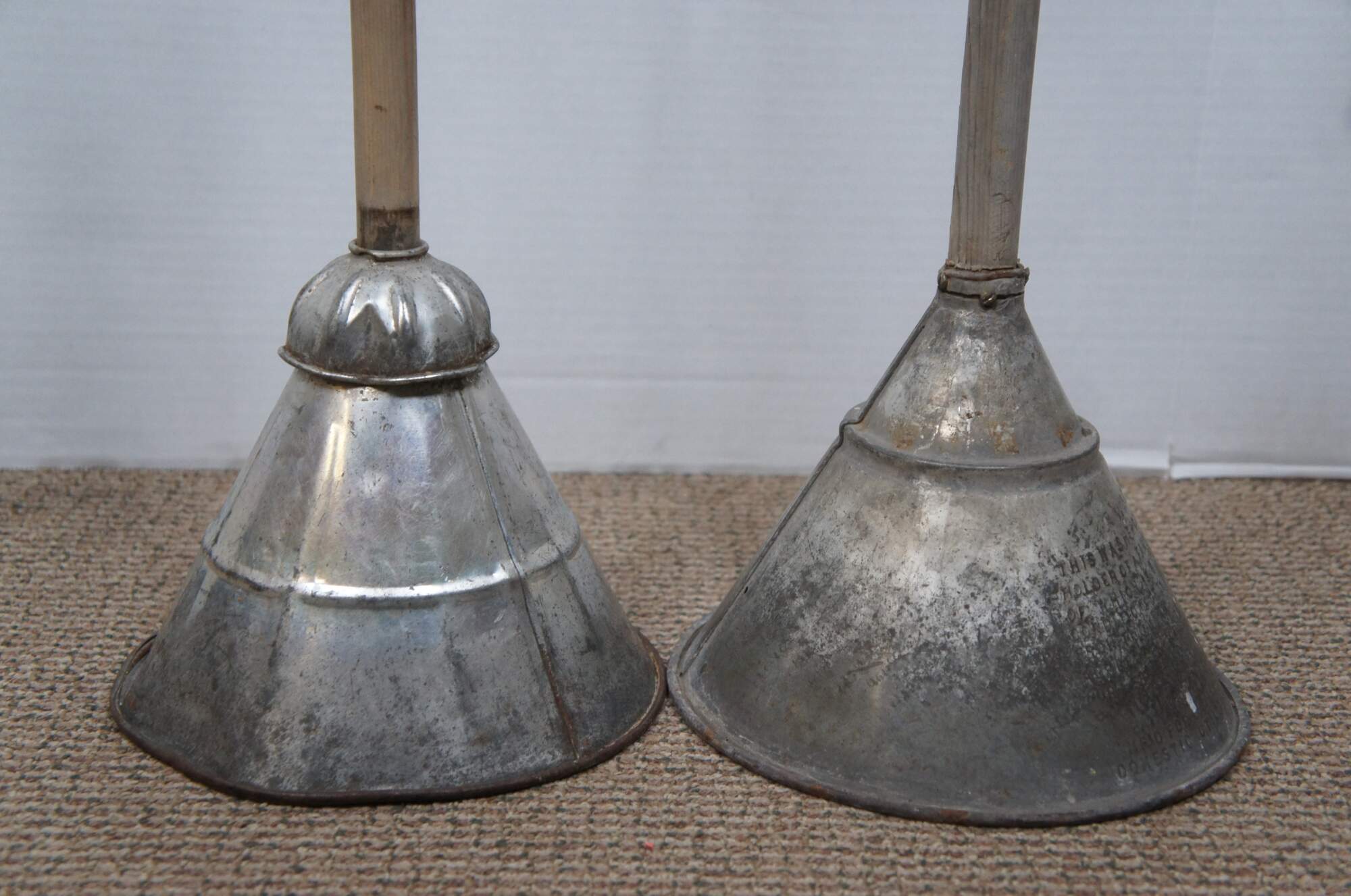 Pair of early 20th century metal laundry plungers / agitators for hand washing clothing in a wash tub. Feature cone shaped galvanized tin bases with molded interiors and long wooden handles. One manufactured by Domestic Utilities Mfg, Co.