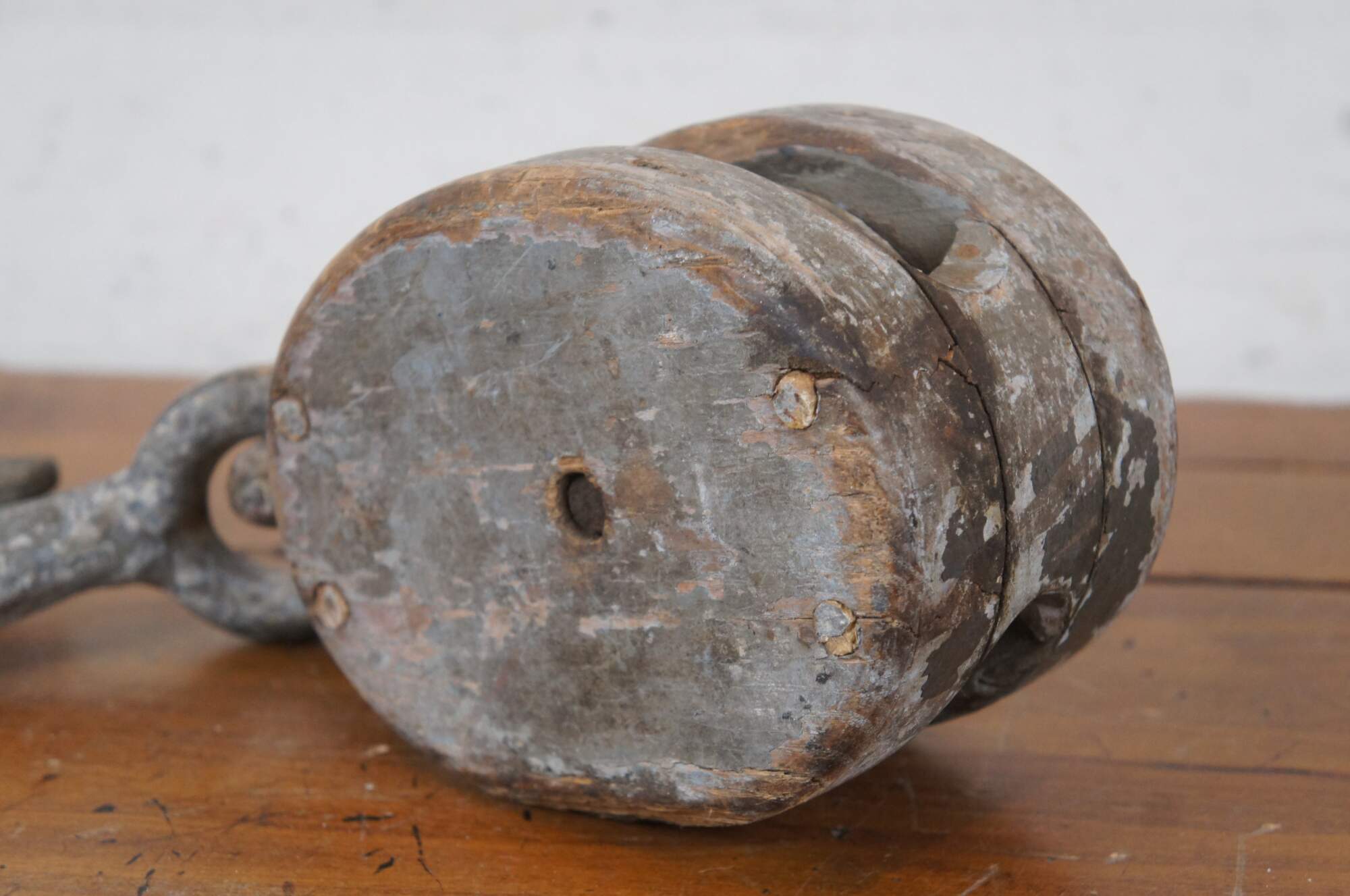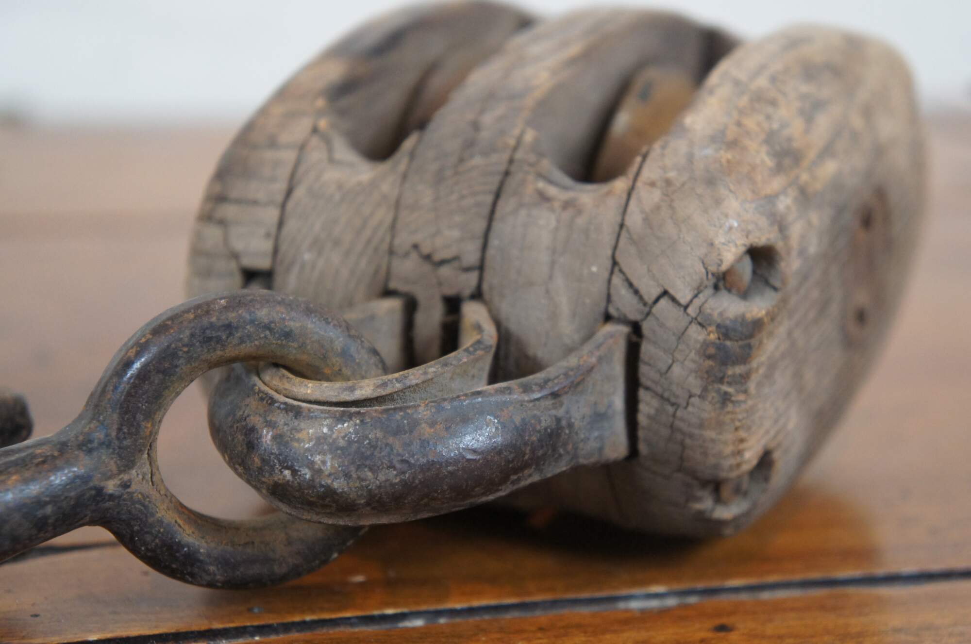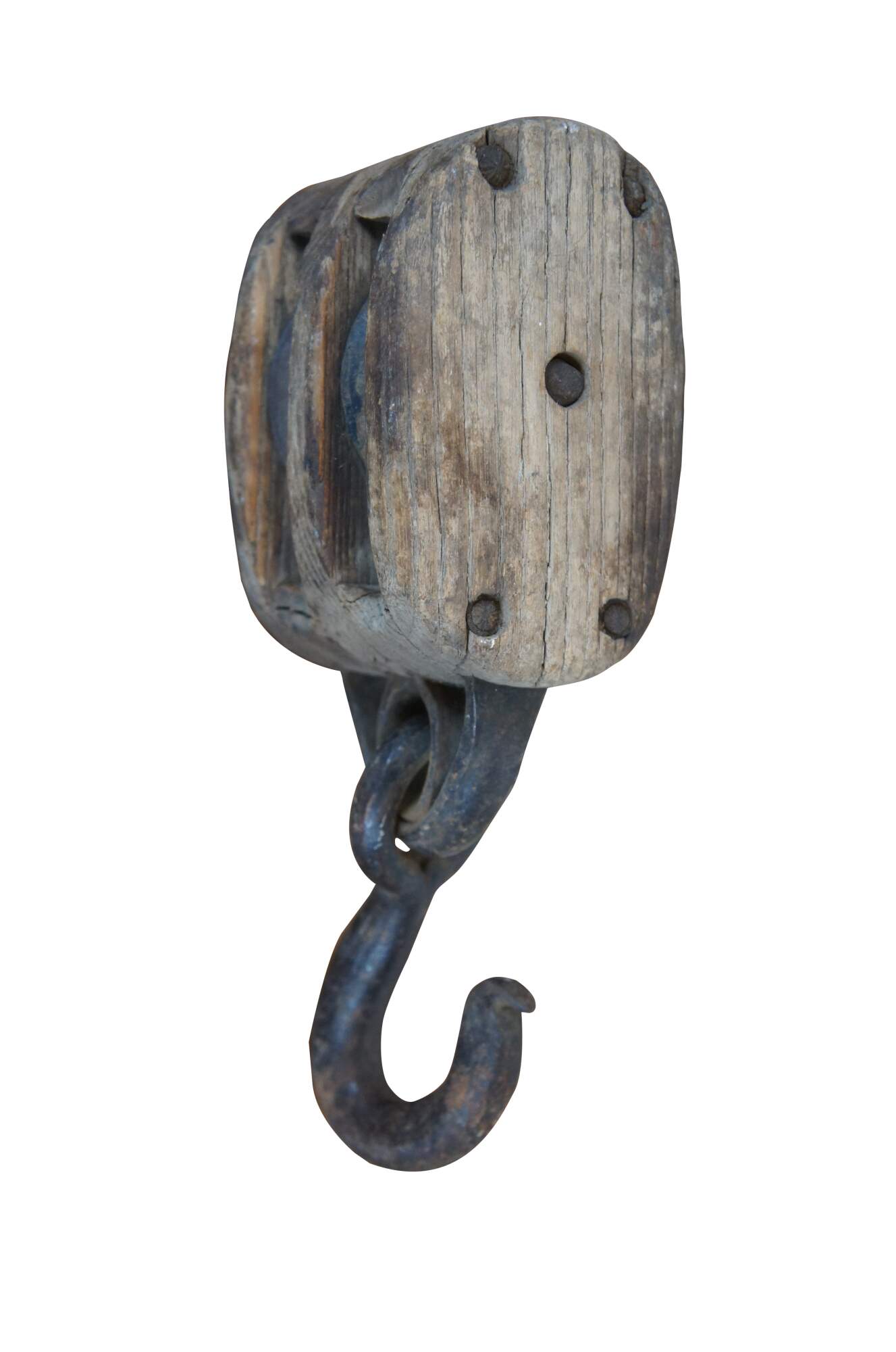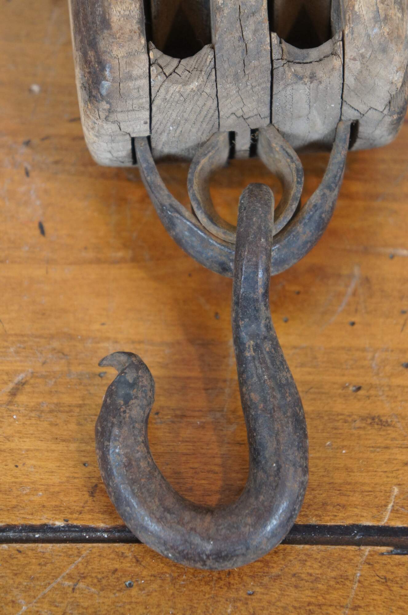 Pair of antique wood block and iron industrial pulley hooks. Larger has one pulley wheel, smaller contains two pulley wheels.