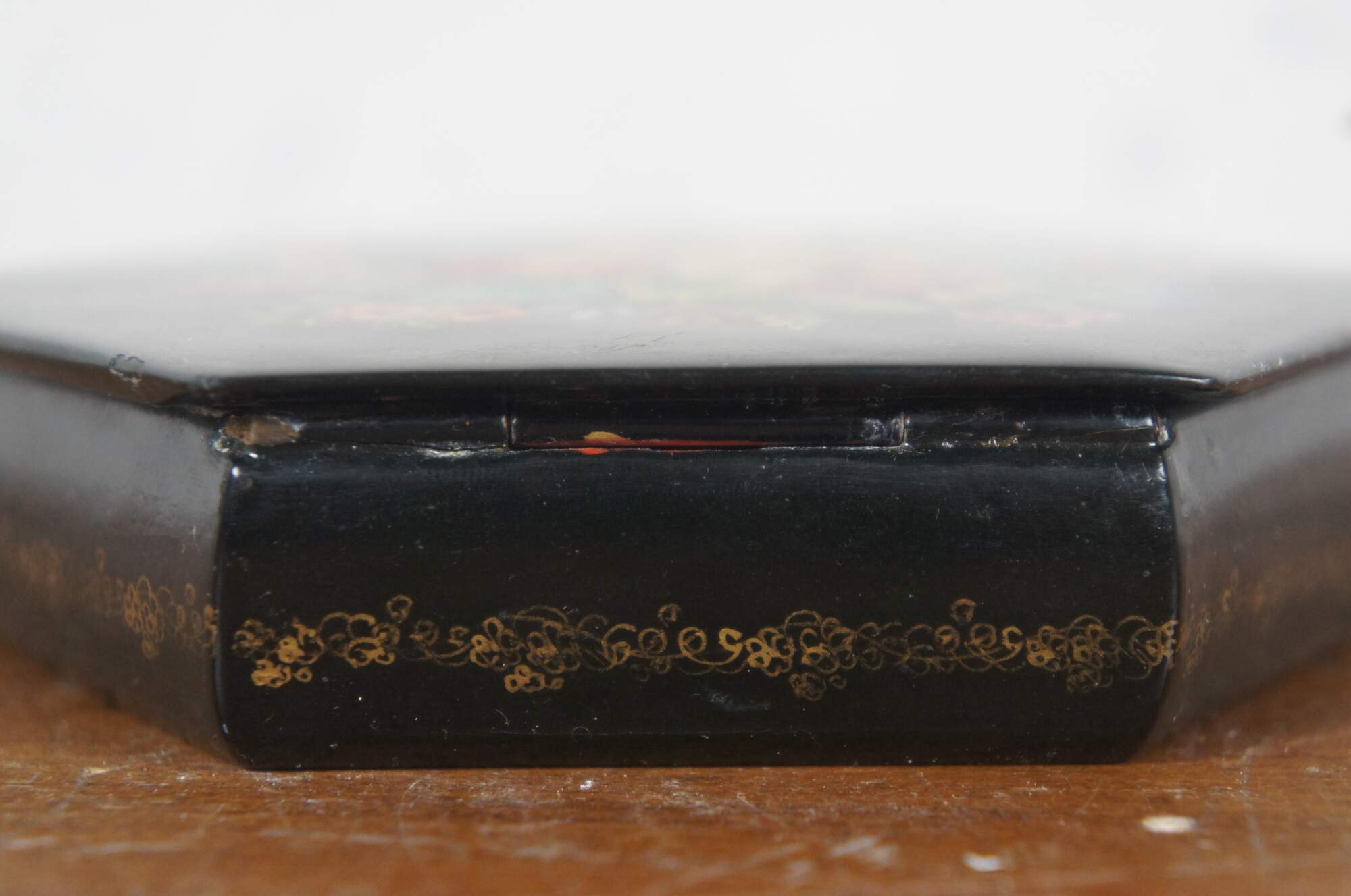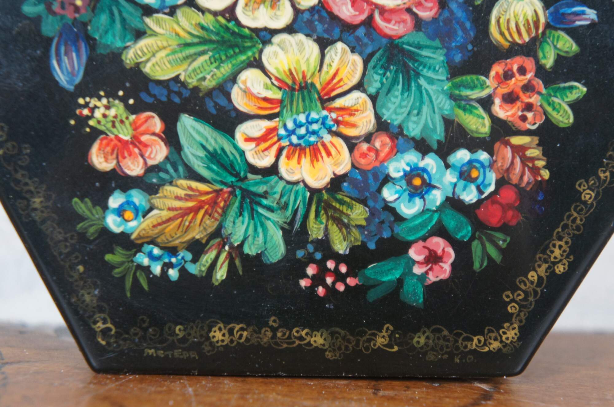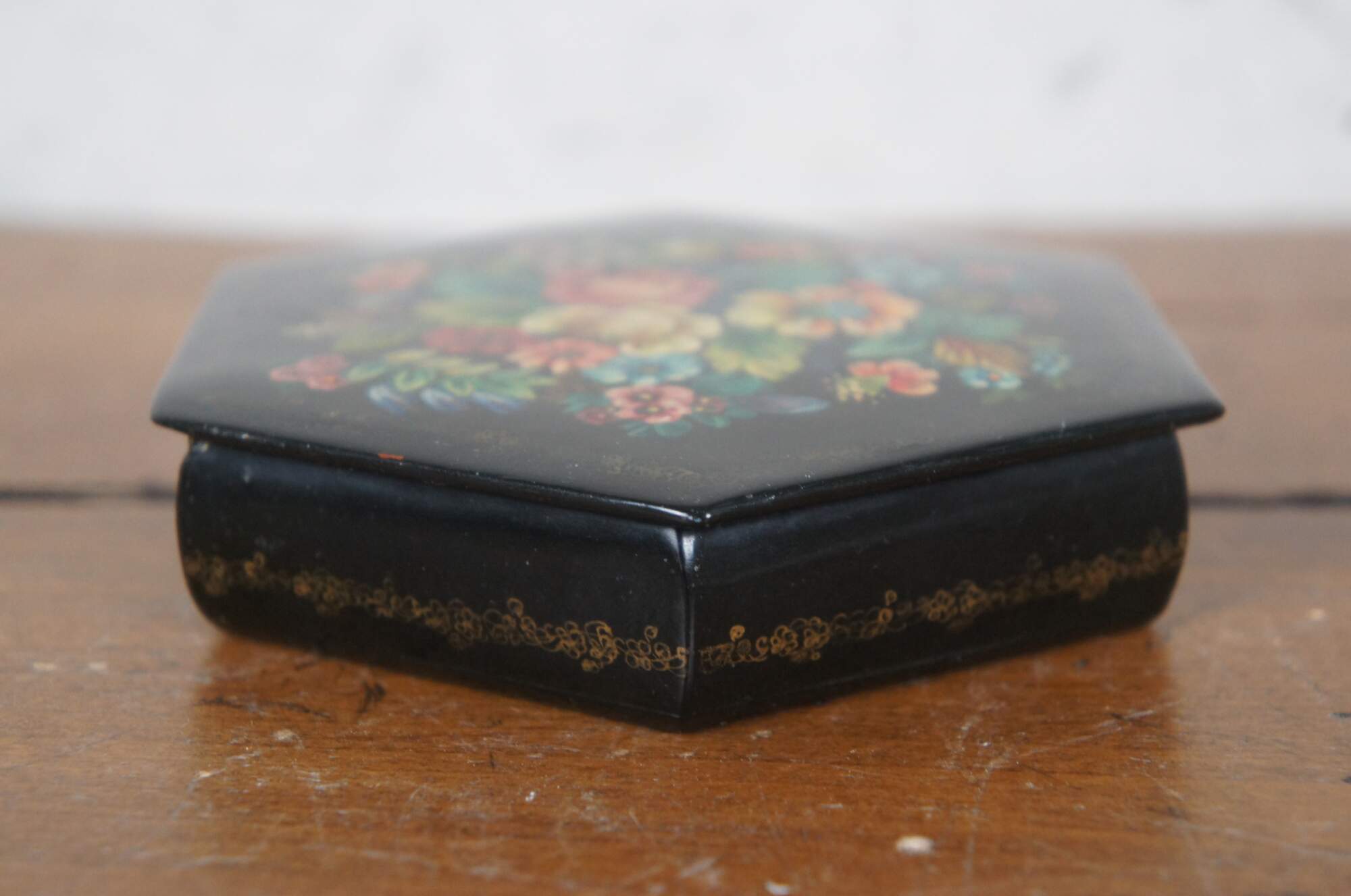 Vintage hexagonal black lacquer trinket box, hand painted with Eastern eurpoean / Russian folk art flowers. Red interior. No signature.
