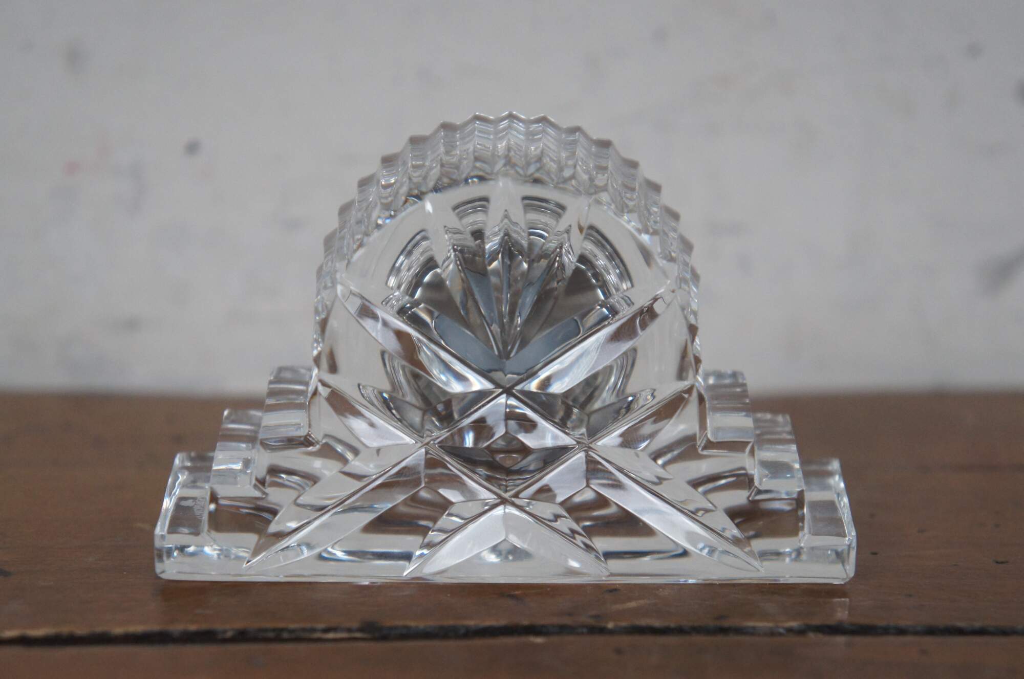 Vintage Waterford Crystal minaiture desk clock featuring an art deco inspired form decorated with a rising sunburst at the base. JBattery operated, Japan. Brass edge around white face with Roman numerals.