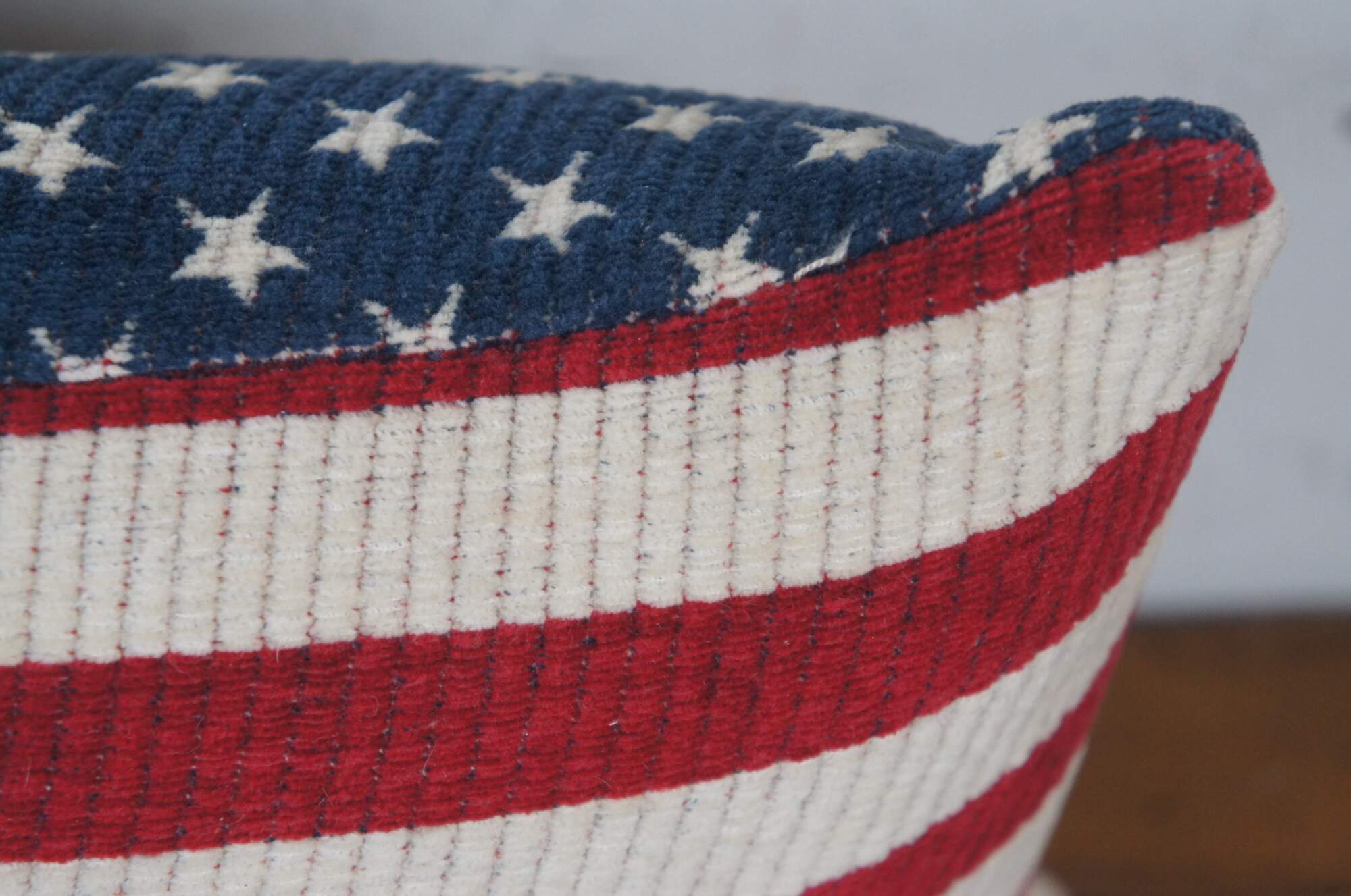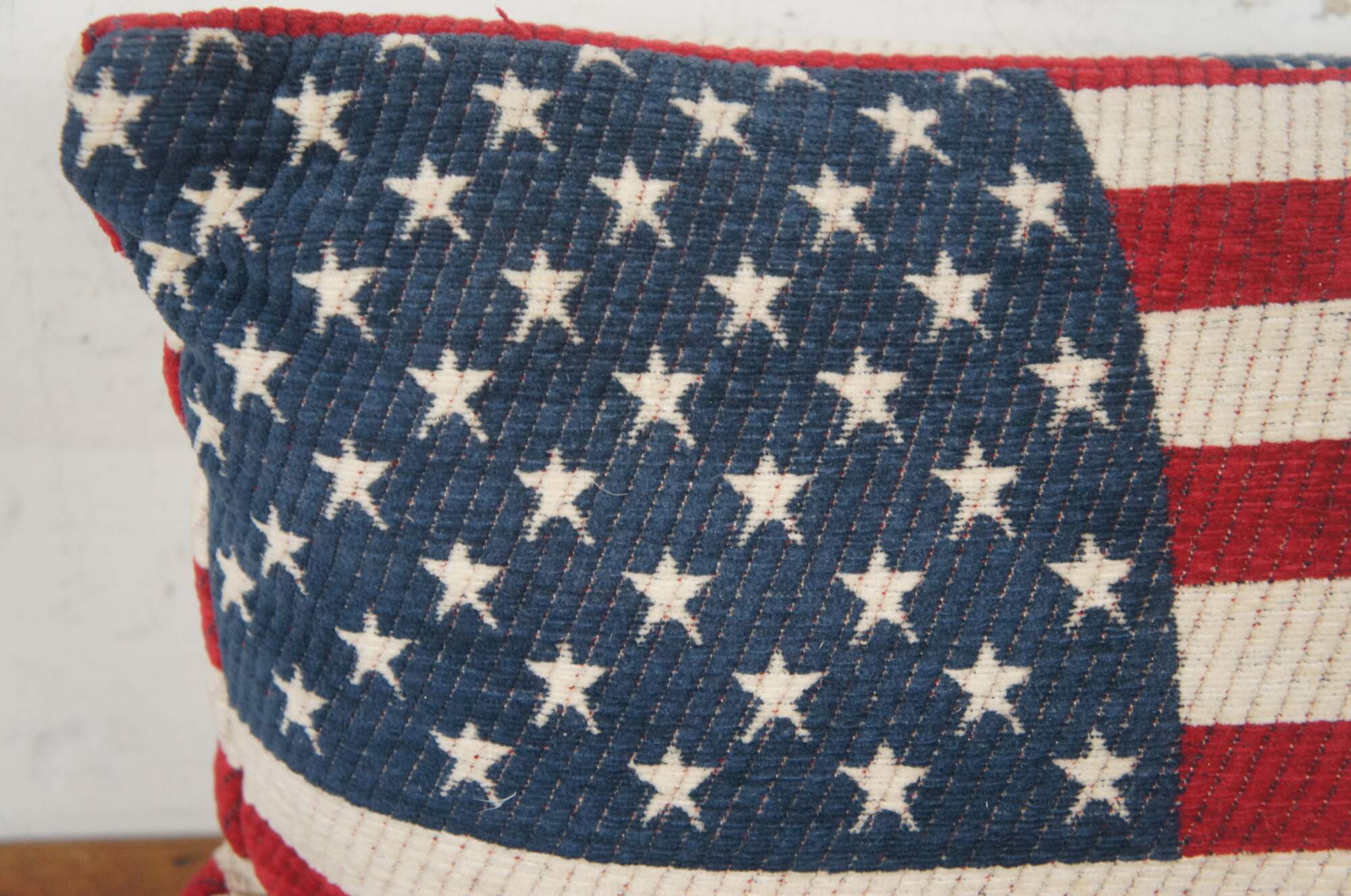 20th century rectangular lumbar / throw pillow in thick ribbed corduroy, printed with the pattern of the American flag. Zipper closure. Fiber filled.