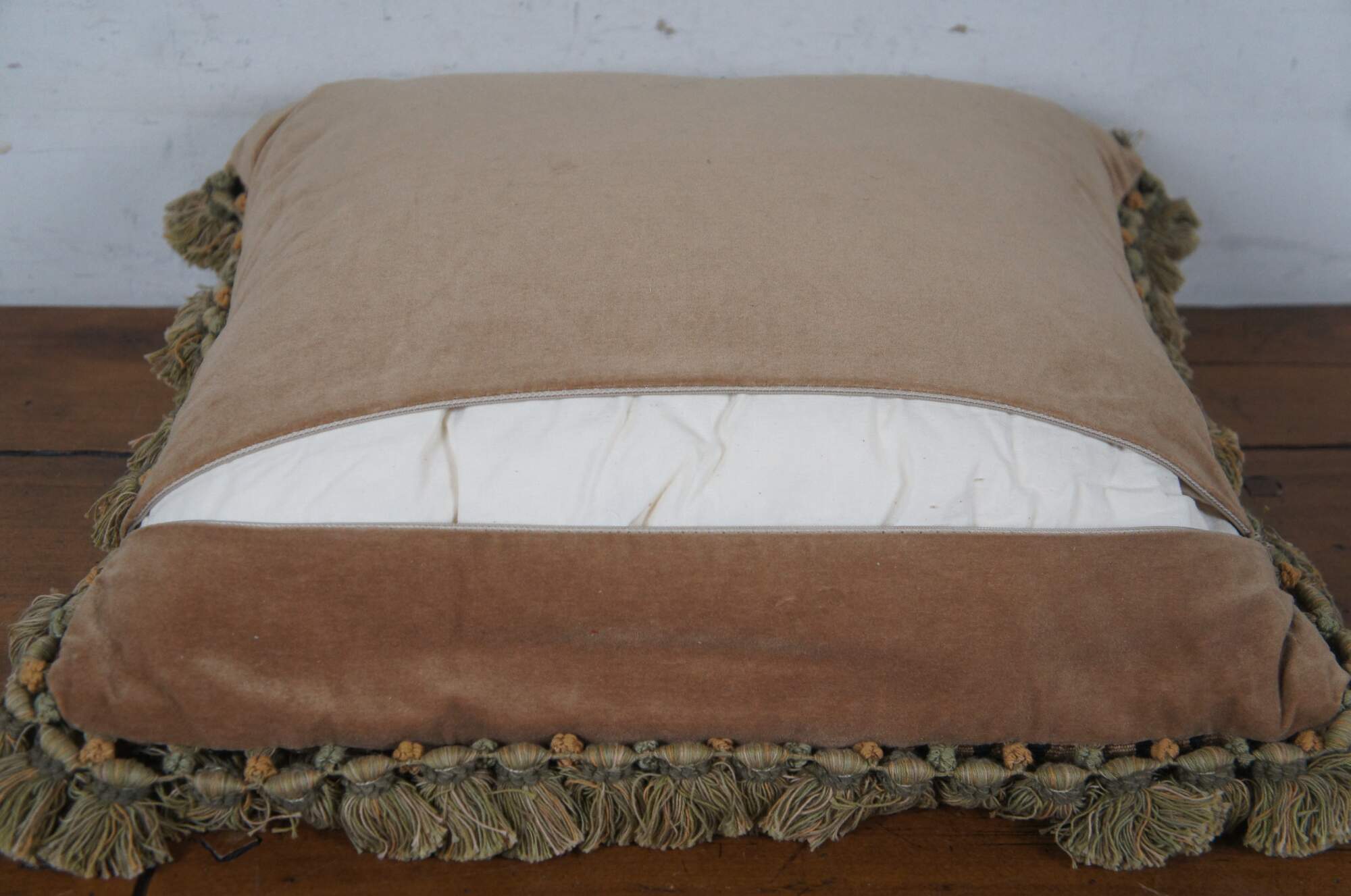 20th century square throw pillow, embroidered with blue flowers and pink roses on leafy stems, surrounding a golden bar tied with a blue ribbon / bow, all on a deep navy blue background. Olive green and gold tassel trim. Brown velour back with zipper closure. Down filled.