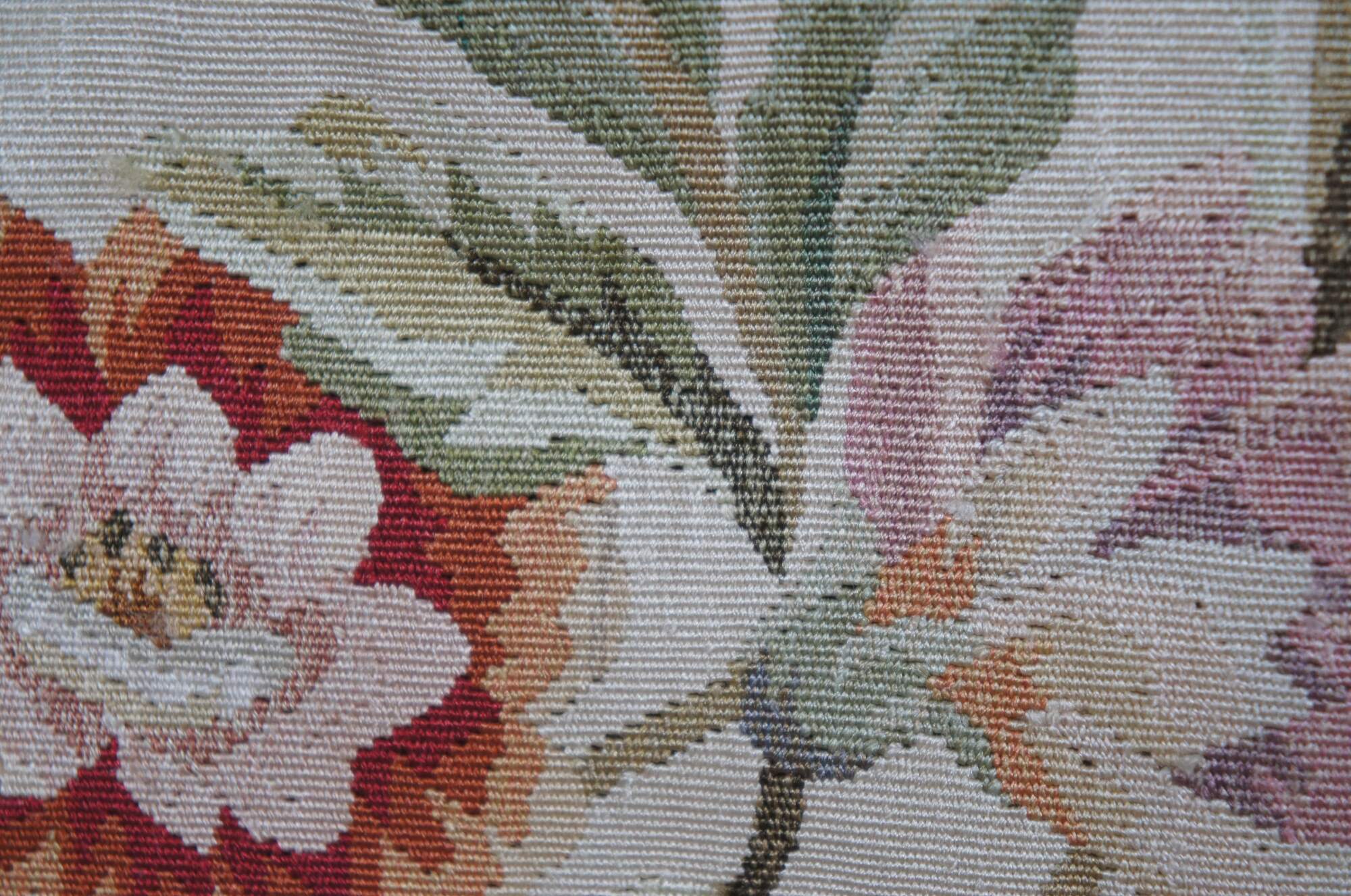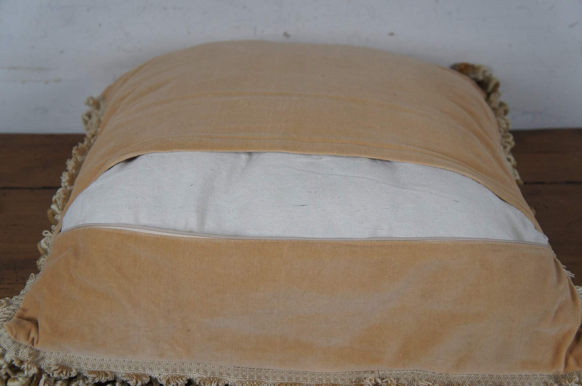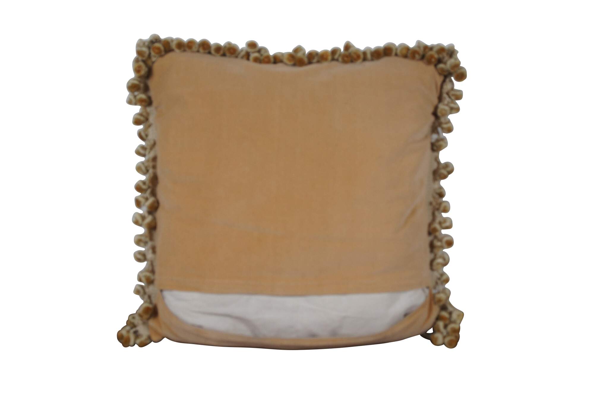 20th century French Aubusson style square throw pillow, embroidered in silk with and array of rust, cream, pink and purple flowers on leafy stems. Light beige ball tassel trim. Light brown velour back with zipper closure. Fiber filled.