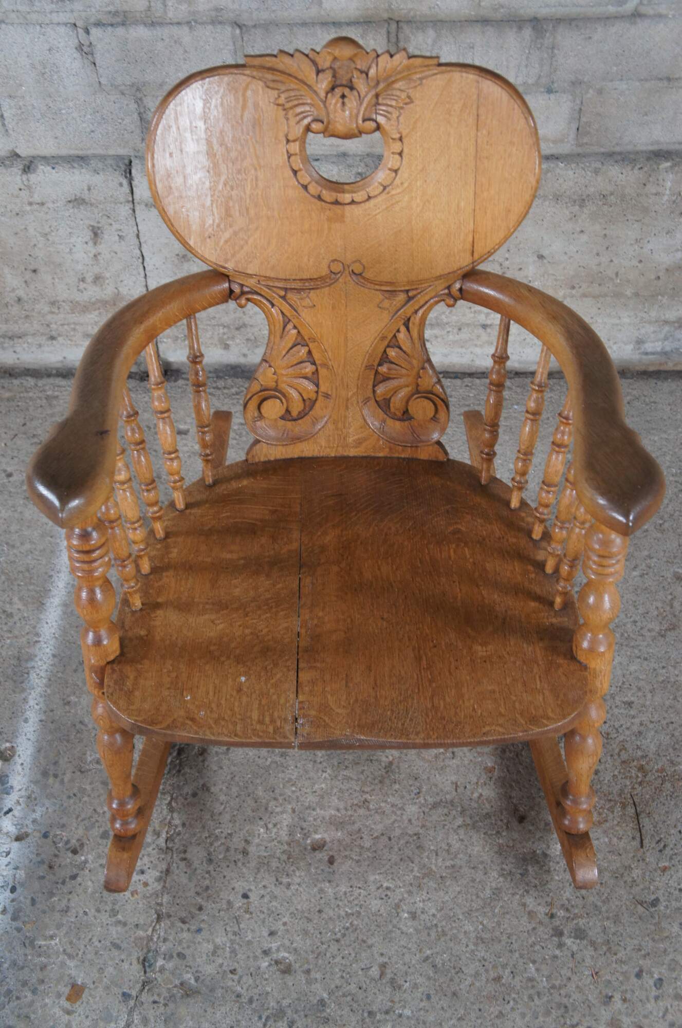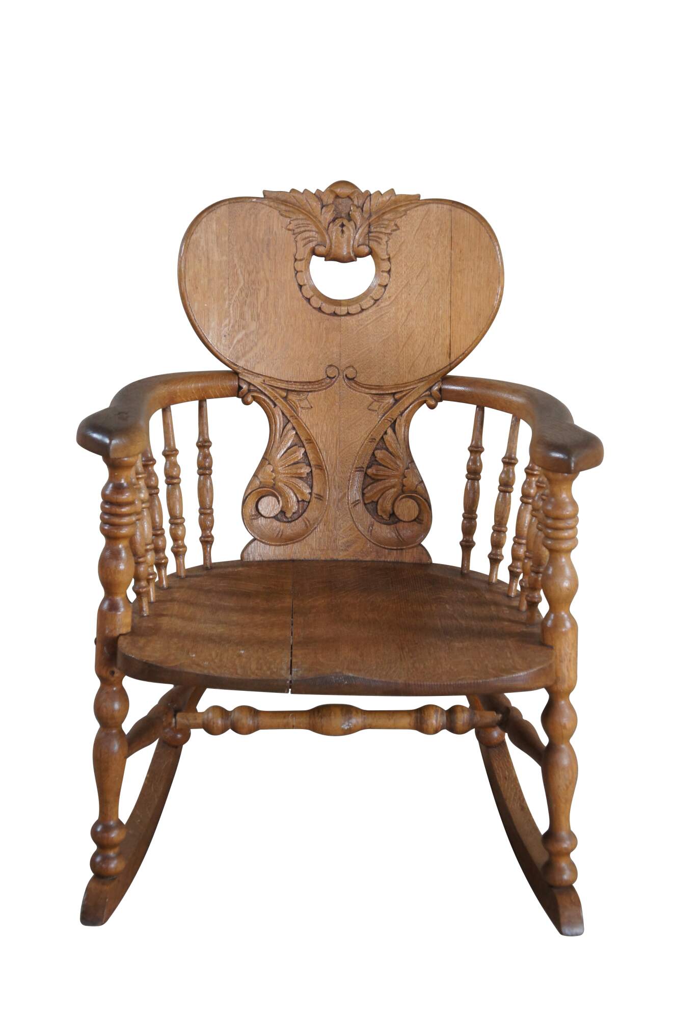 Late Victorian Rocking Chair. Attributed to Stomps Burkhardt of Dayton, Ohio. Made from quartersawn oak with a heart shaped back, carved and pierced with acanthus foliate and "C" scrolled splat. The chair has a barrel back form with turned spindle supports. Features a contoured seat and turned stretchers.