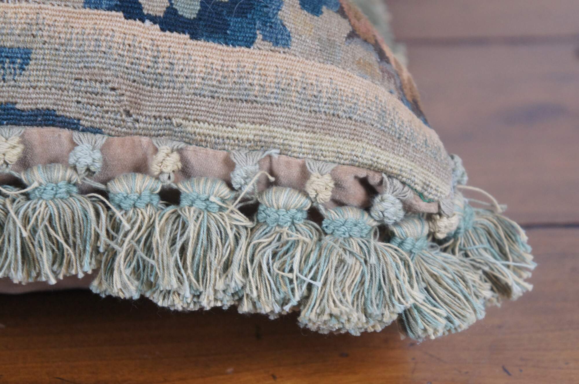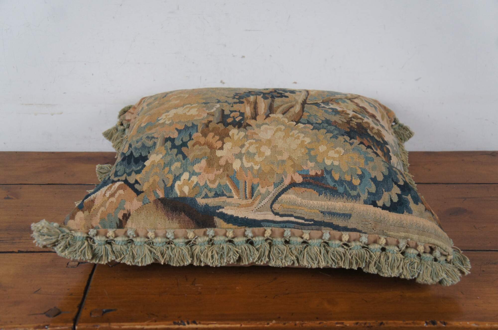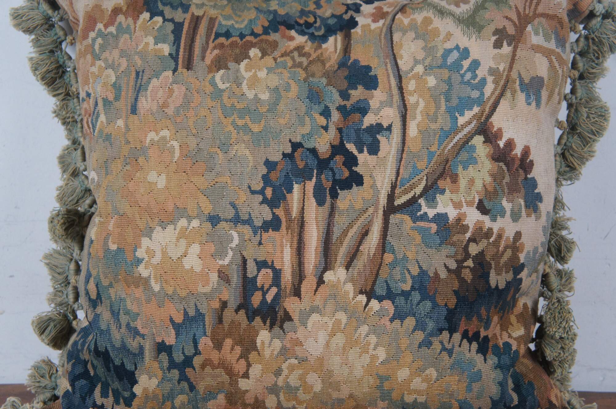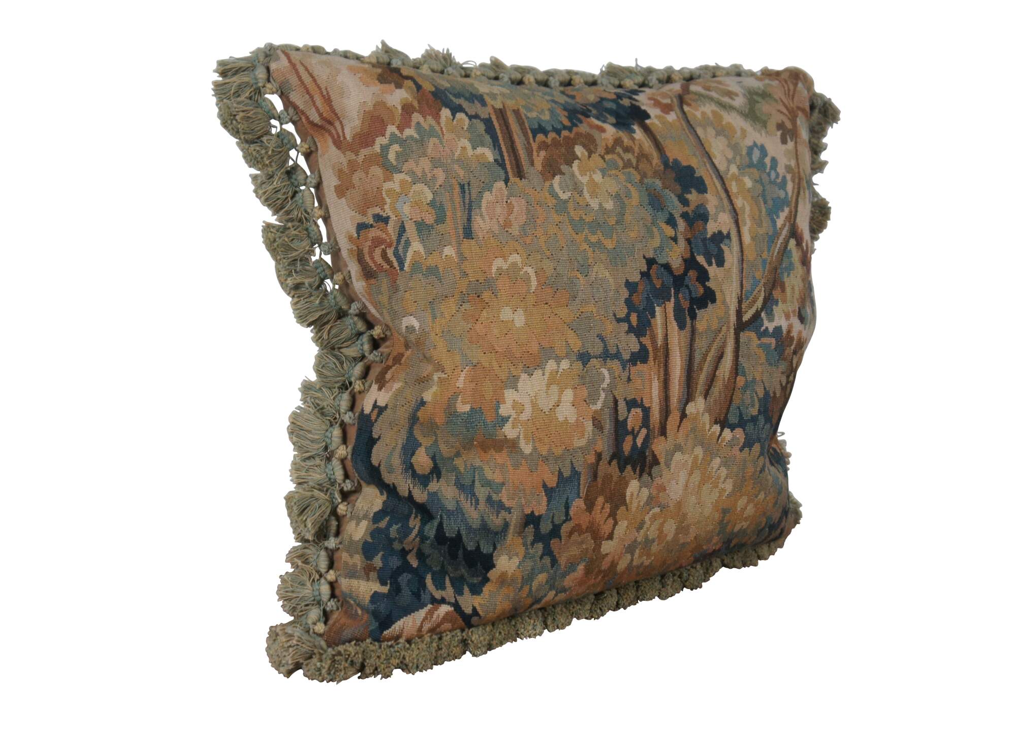 20th century French Aubusson style square throw pillow, embroidered with an Impressionist forest landscape. Green and beige tassel trim. Beige velour back with zipper closure. Down filled.
