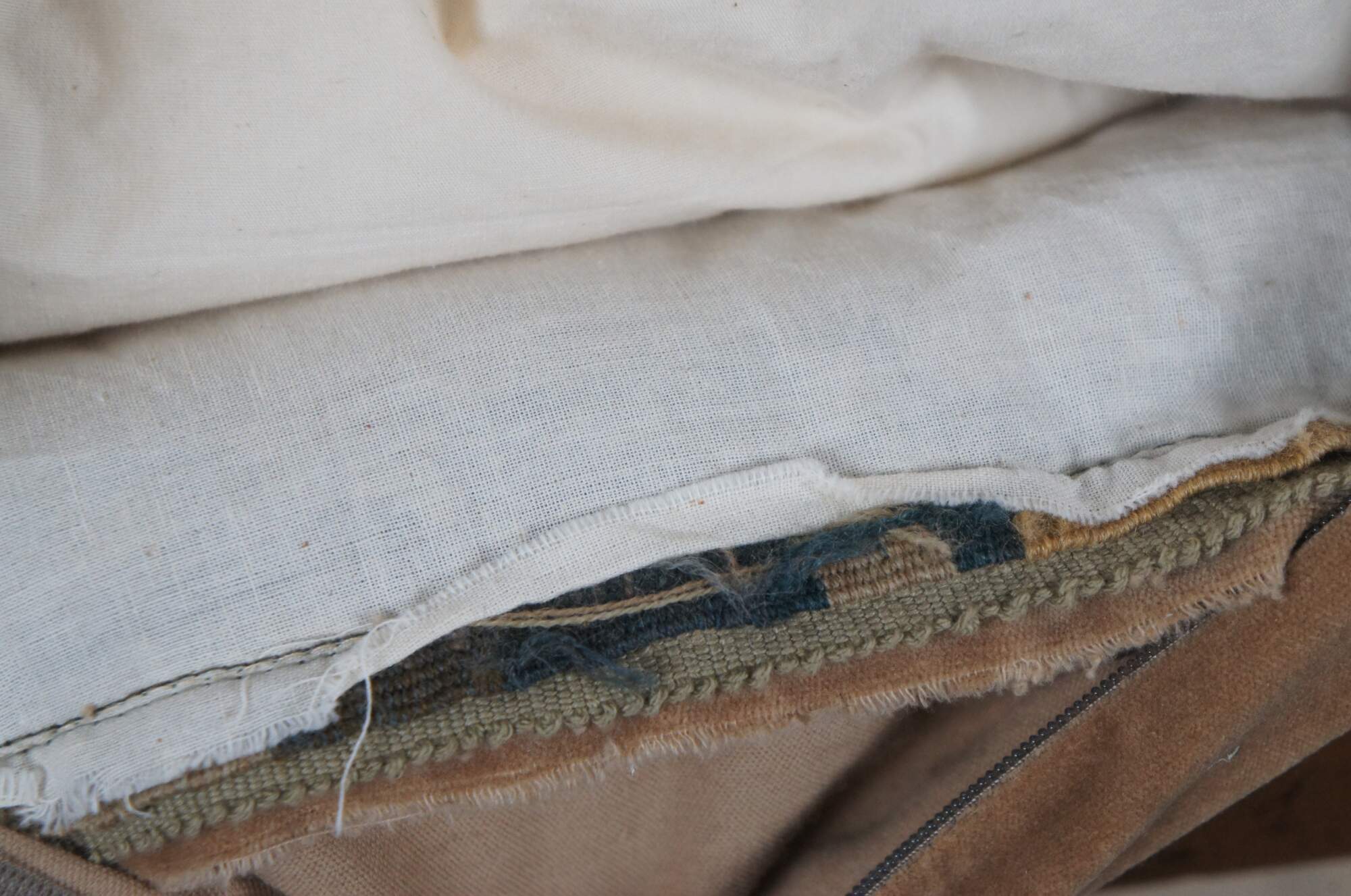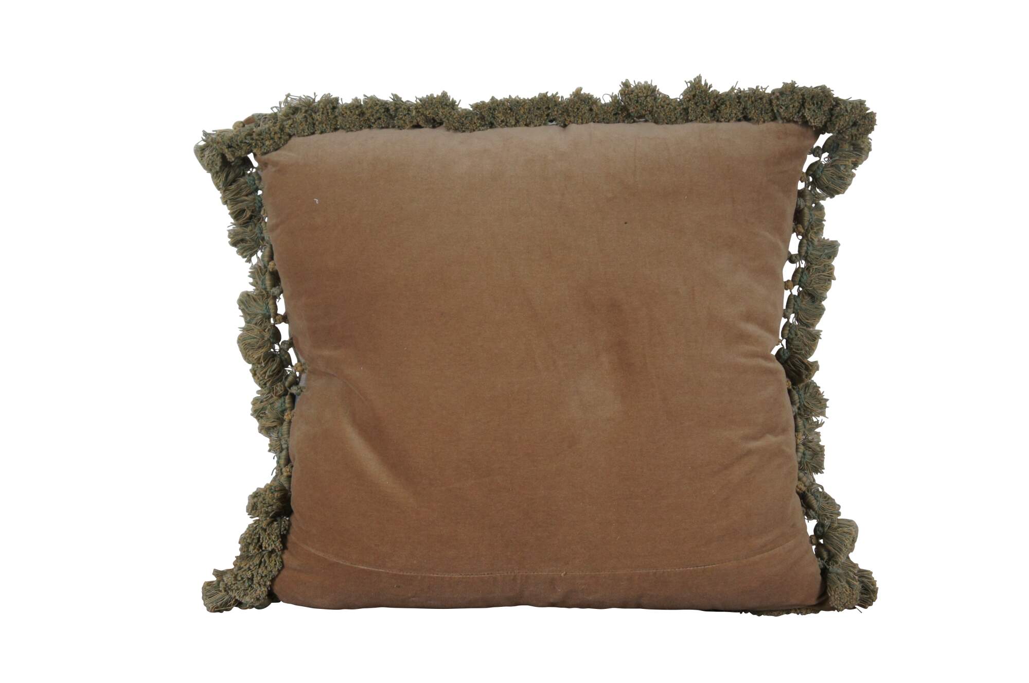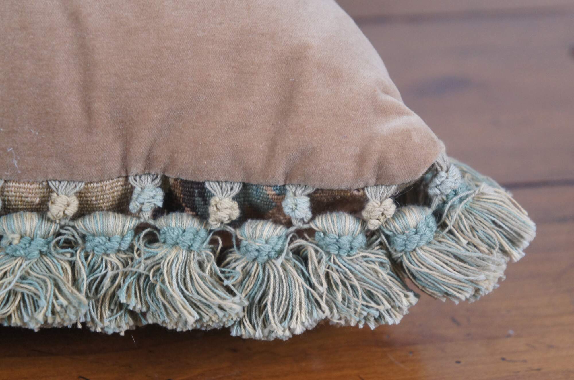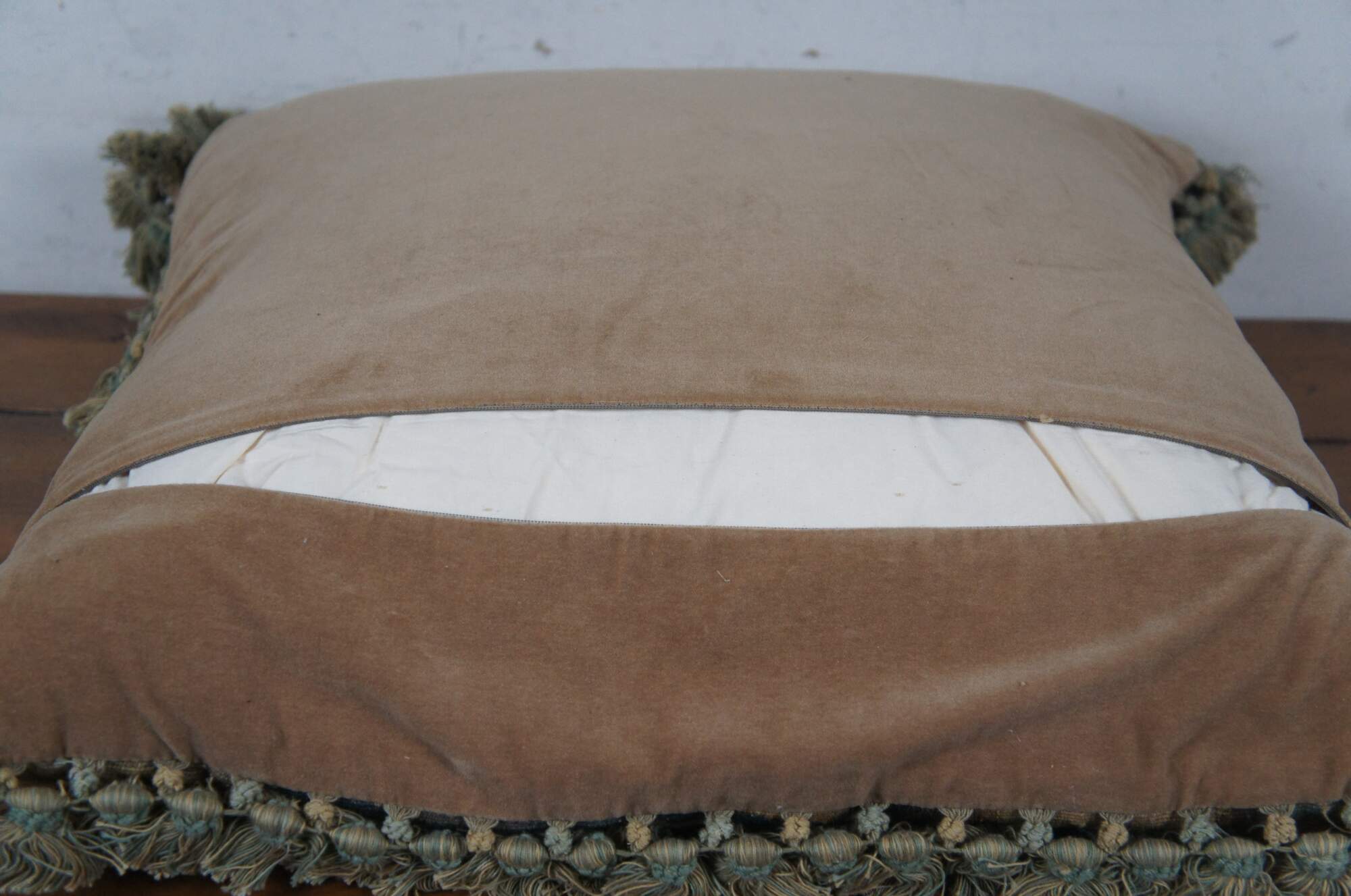 20th century French Aubusson style square throw pillow, embroidered with an Impressionist forest landscape. Green and beige tassel trim. Beige velour back with zipper closure. Down filled.