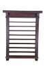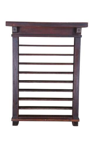 An antique wall mount pool ball rack. Made from mahogany with 9 shelves and a unique square inlay towards the top.