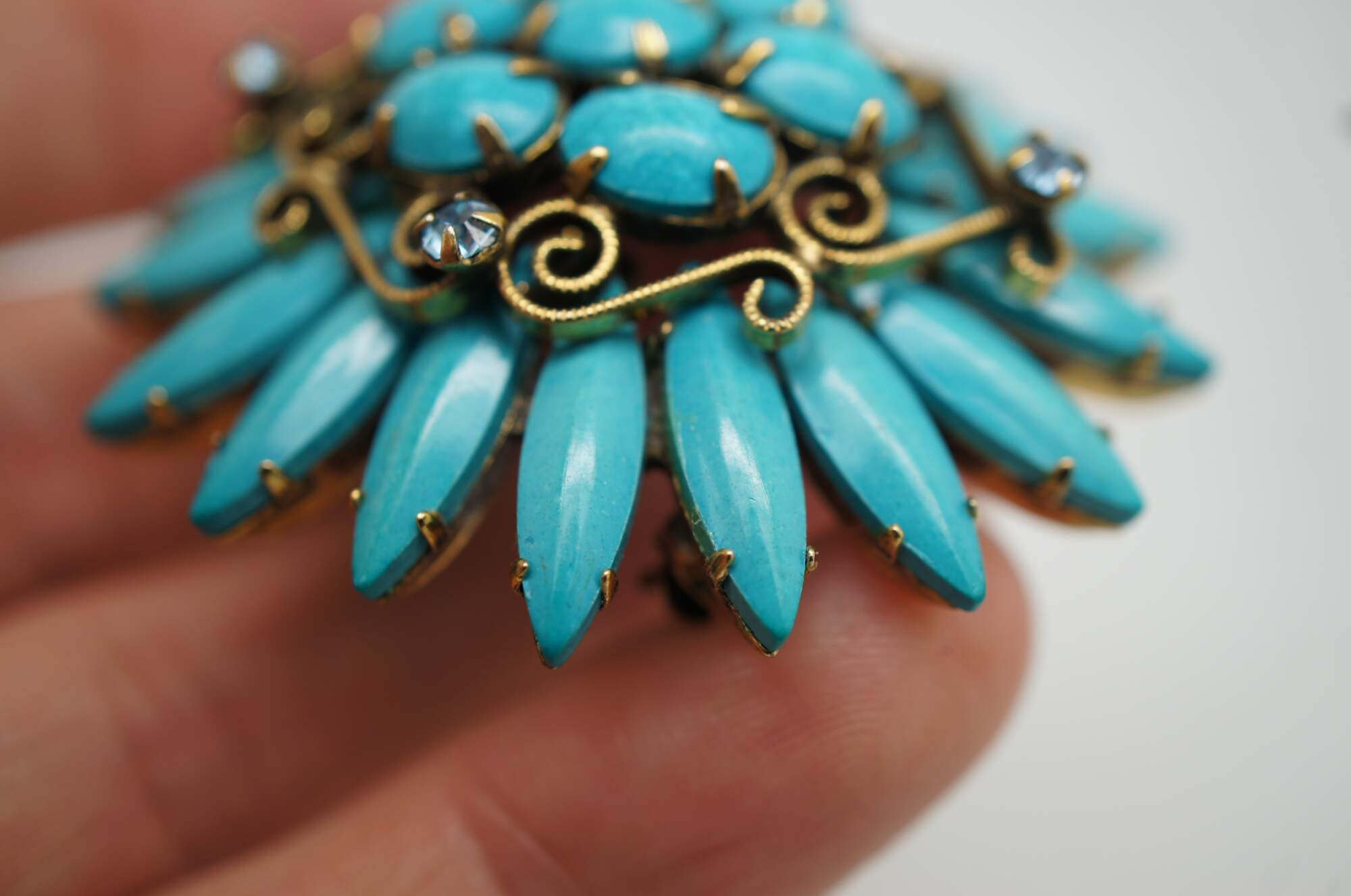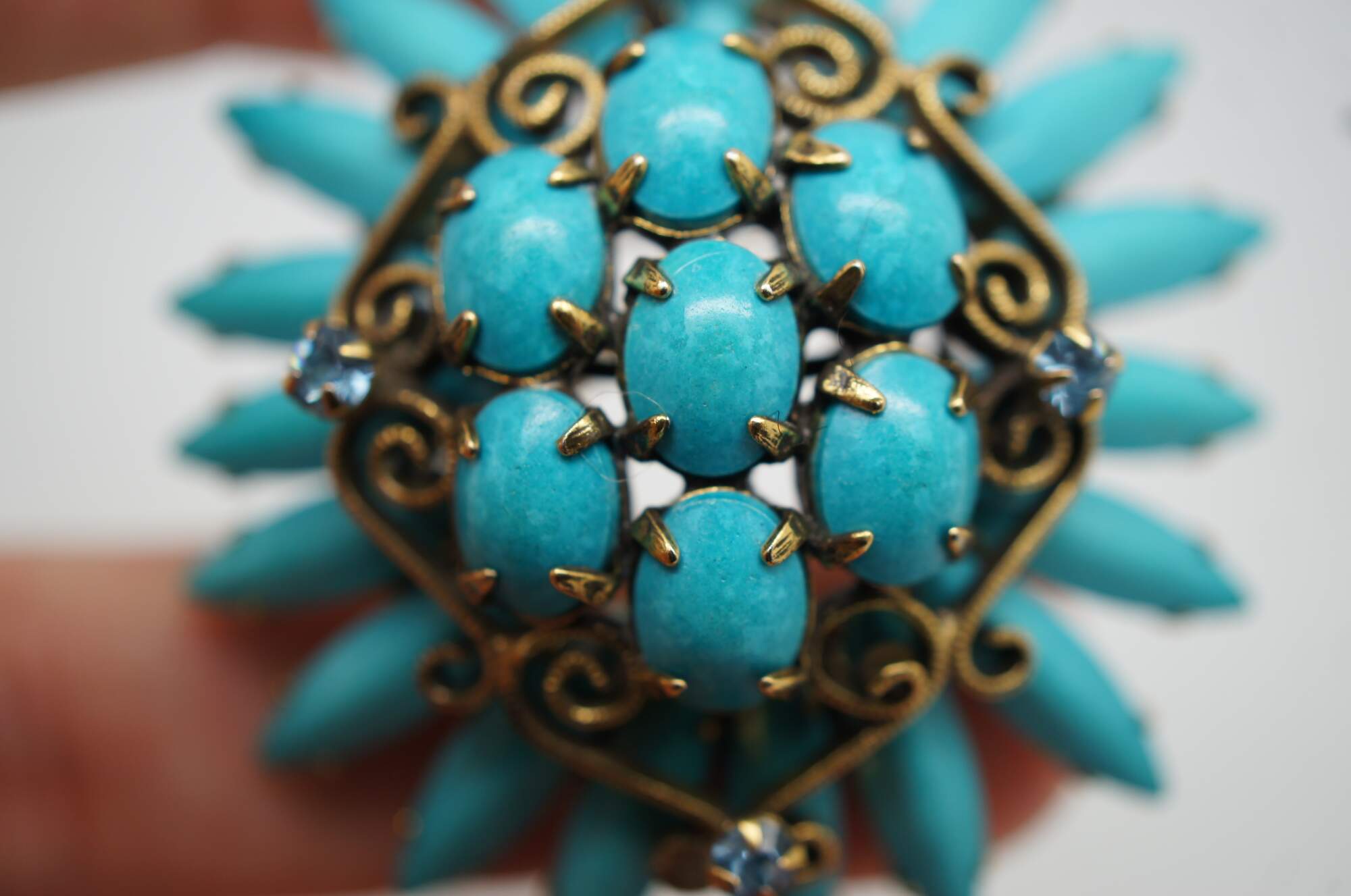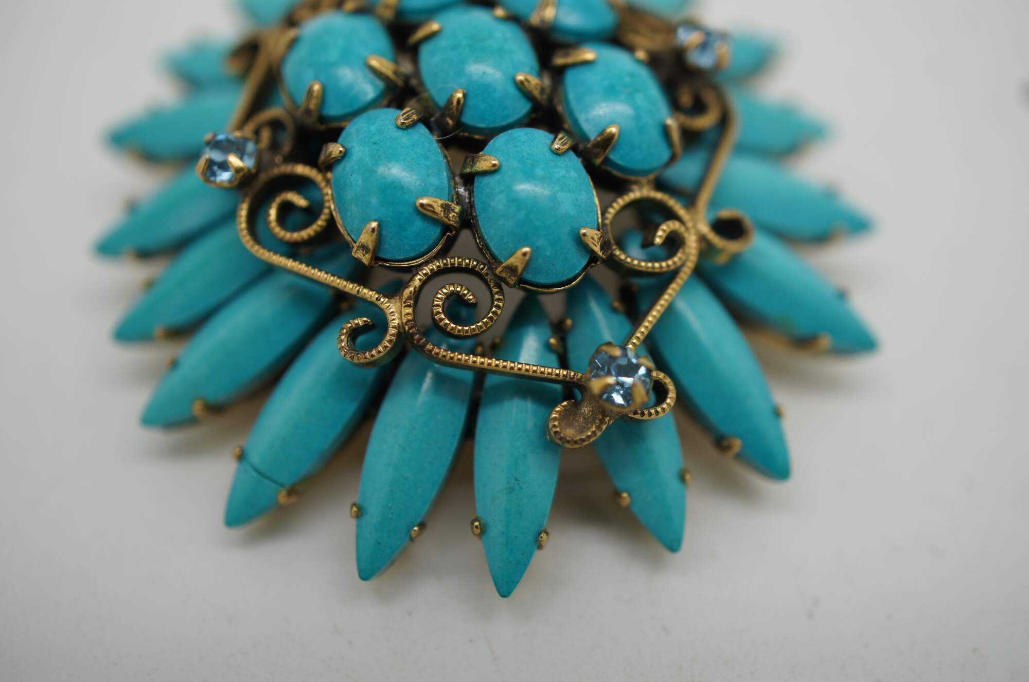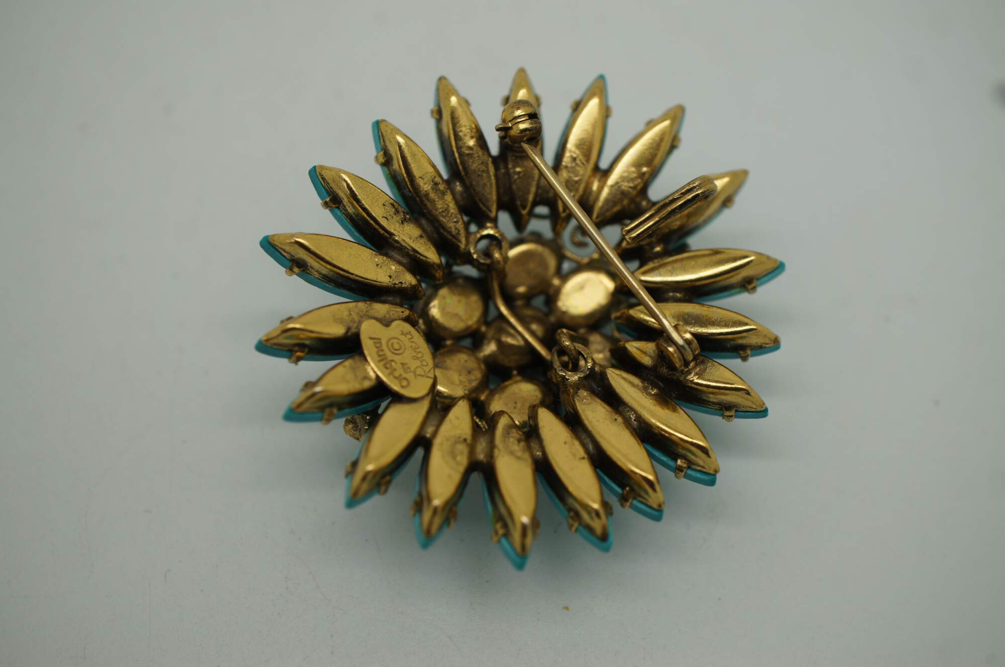 Mid 20th century Original by Robert pin / brooch featuring a Southwest inspired design of turquoise stones arranged in the shape of a flower, accented with scrolling brass and aqua rhinestones.