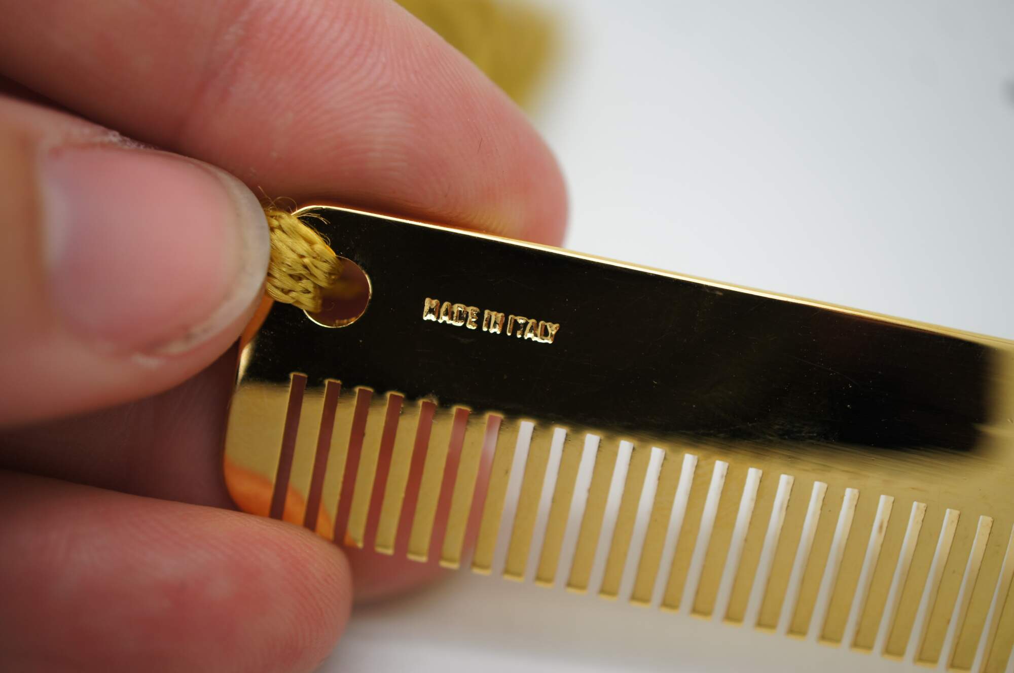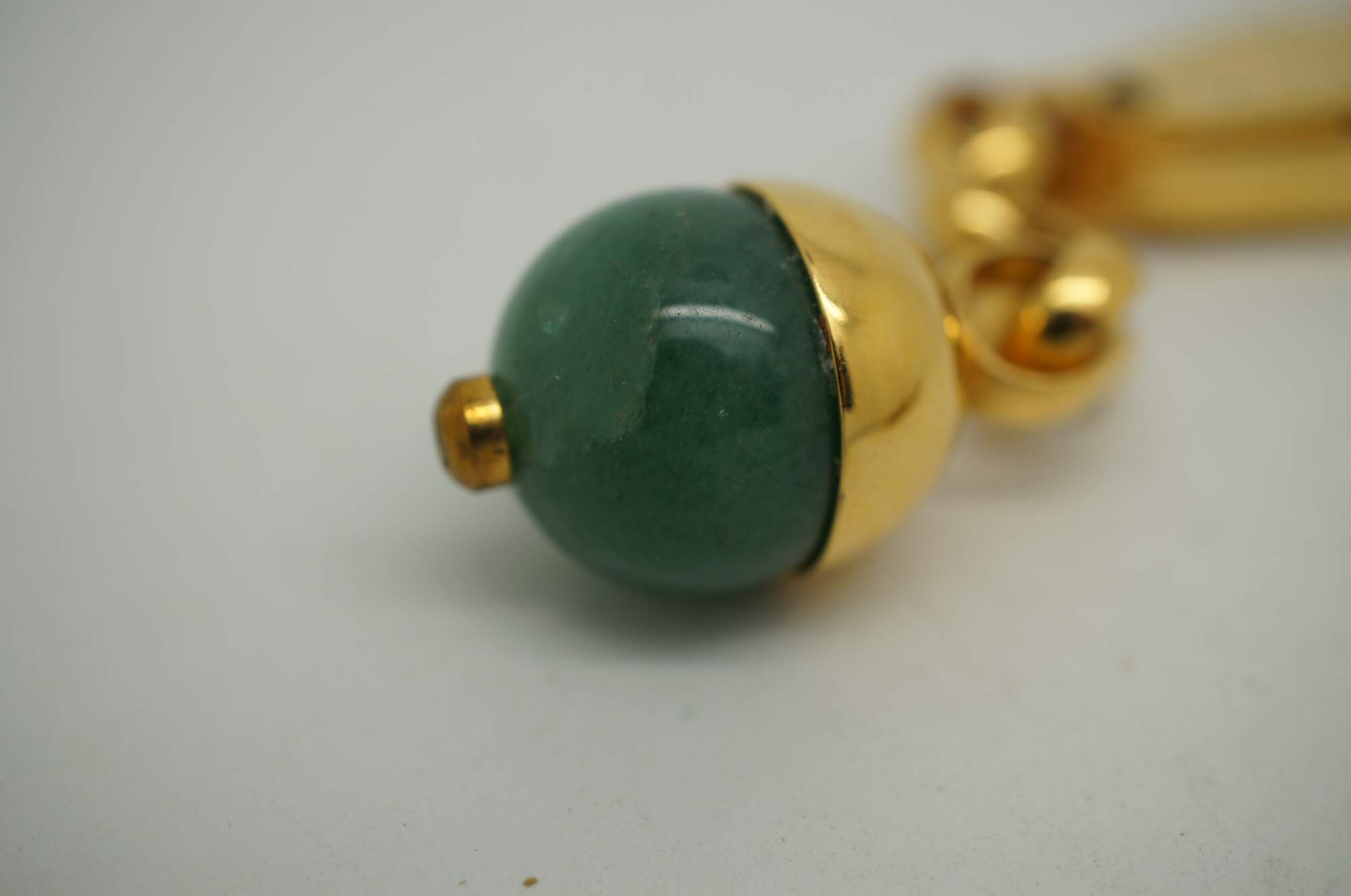 Late 20th century pair of Judith Leiber purse accessories in bright gold plated metal - one pocket comb with tassel and one clip key chain / fob with round jade green stone, capped to resemble an acorn.