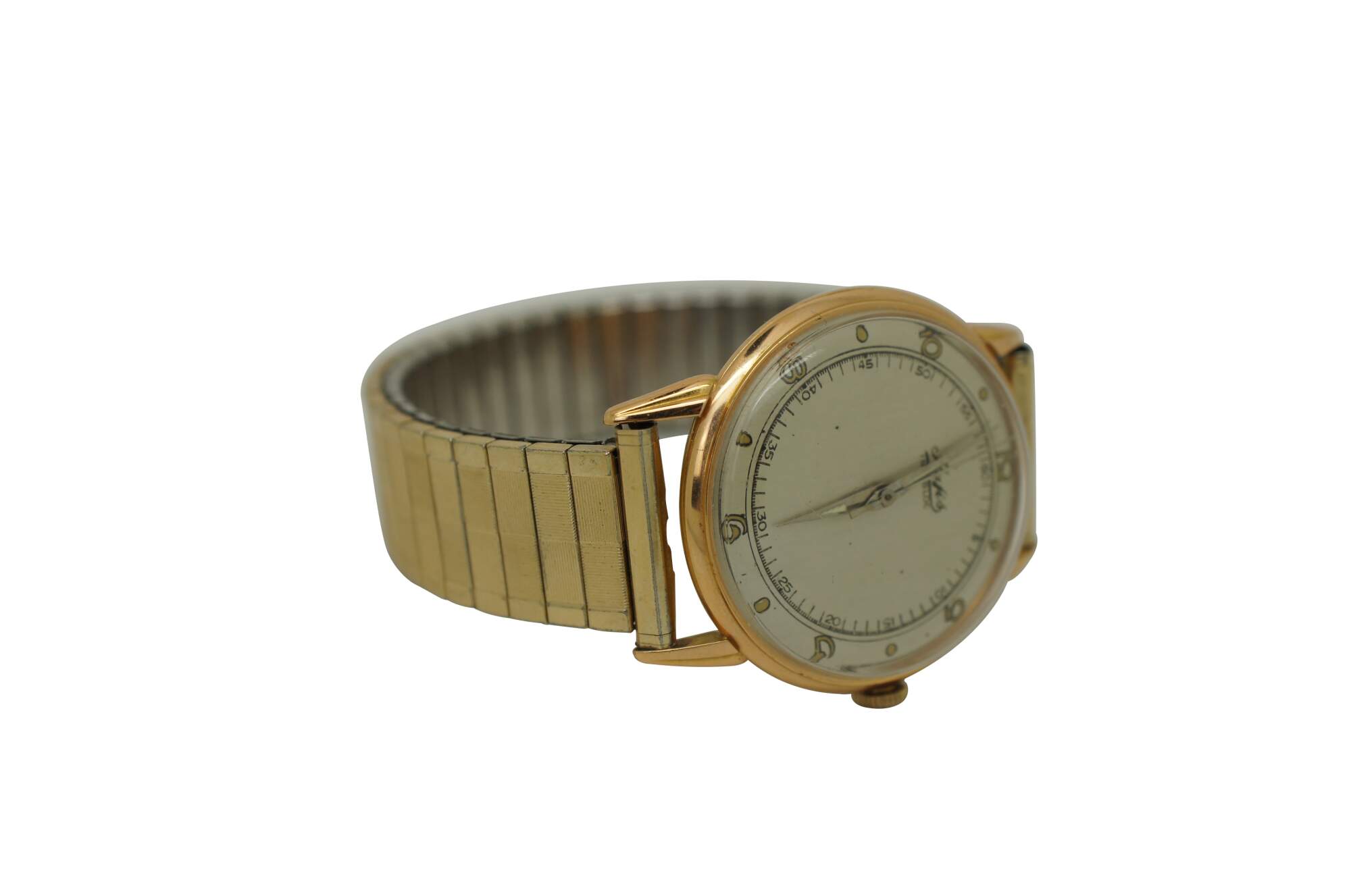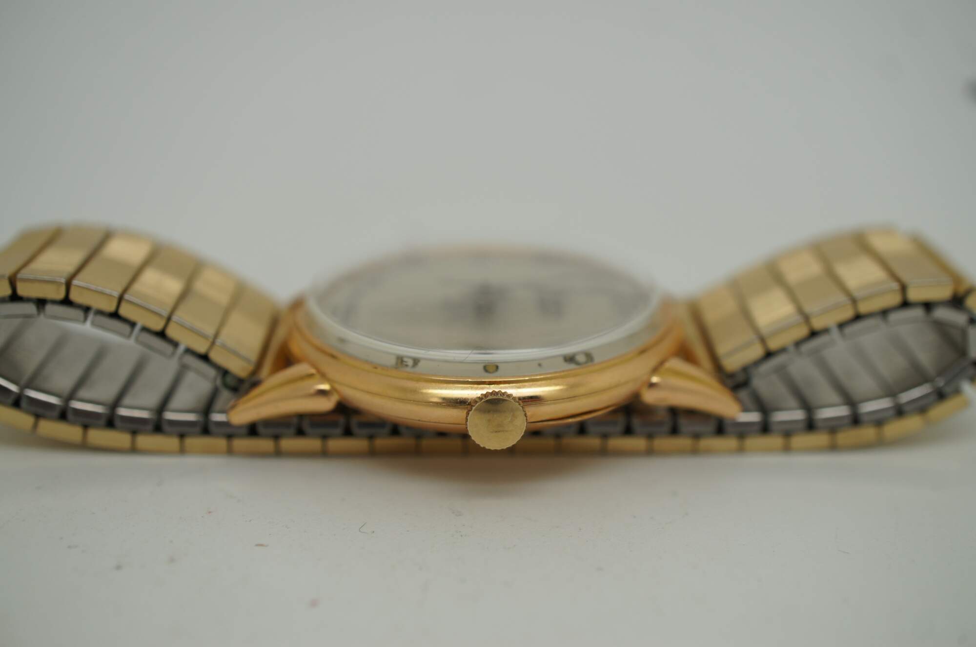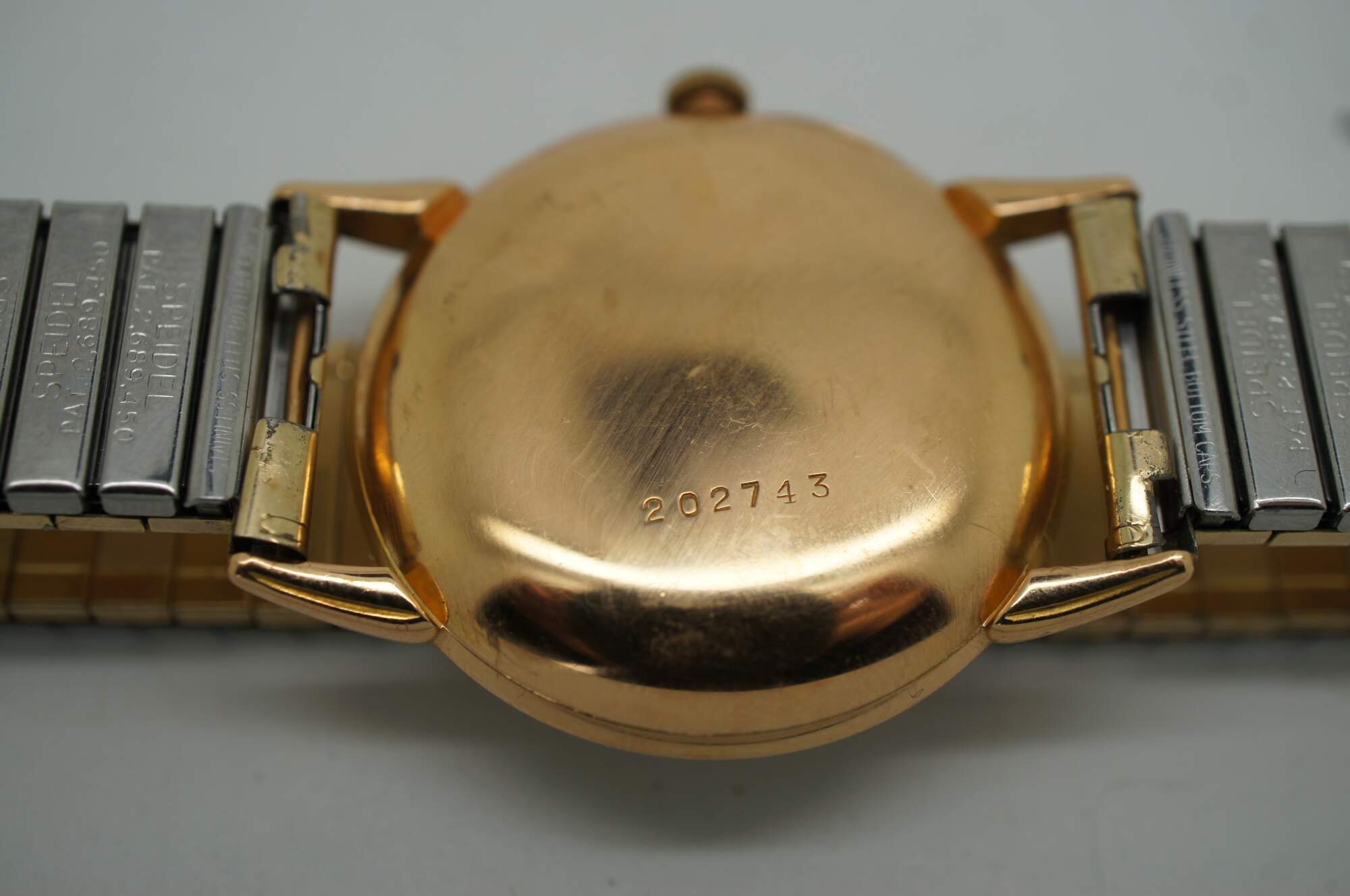 Rare early to mid 20th century Hafis art deco mechanical wrist watch with Incabloc shock protection system. 18K yellow gold case, 0,0750 fineness, serial number 202743. Hammer head shaped Swiss Poinçons de Maître mark, registration number 102 - indicates the case was made by Amez-Droz & Cie / Boîtes de montres Zéma (Zema Watch Boxes) / Jean Born. Silver tone face with gilt painted Arabic numerals and enumerated seconds. Spear shaped hands accented with glow-in-the-dark paint. Currently on a Speidel stretch link band with 10K gold filled top caps. Silver tone face with gilt panted Arabic numerals and enumerated seconds. Spear shaped hands accented with glow-in-the-dark paint.