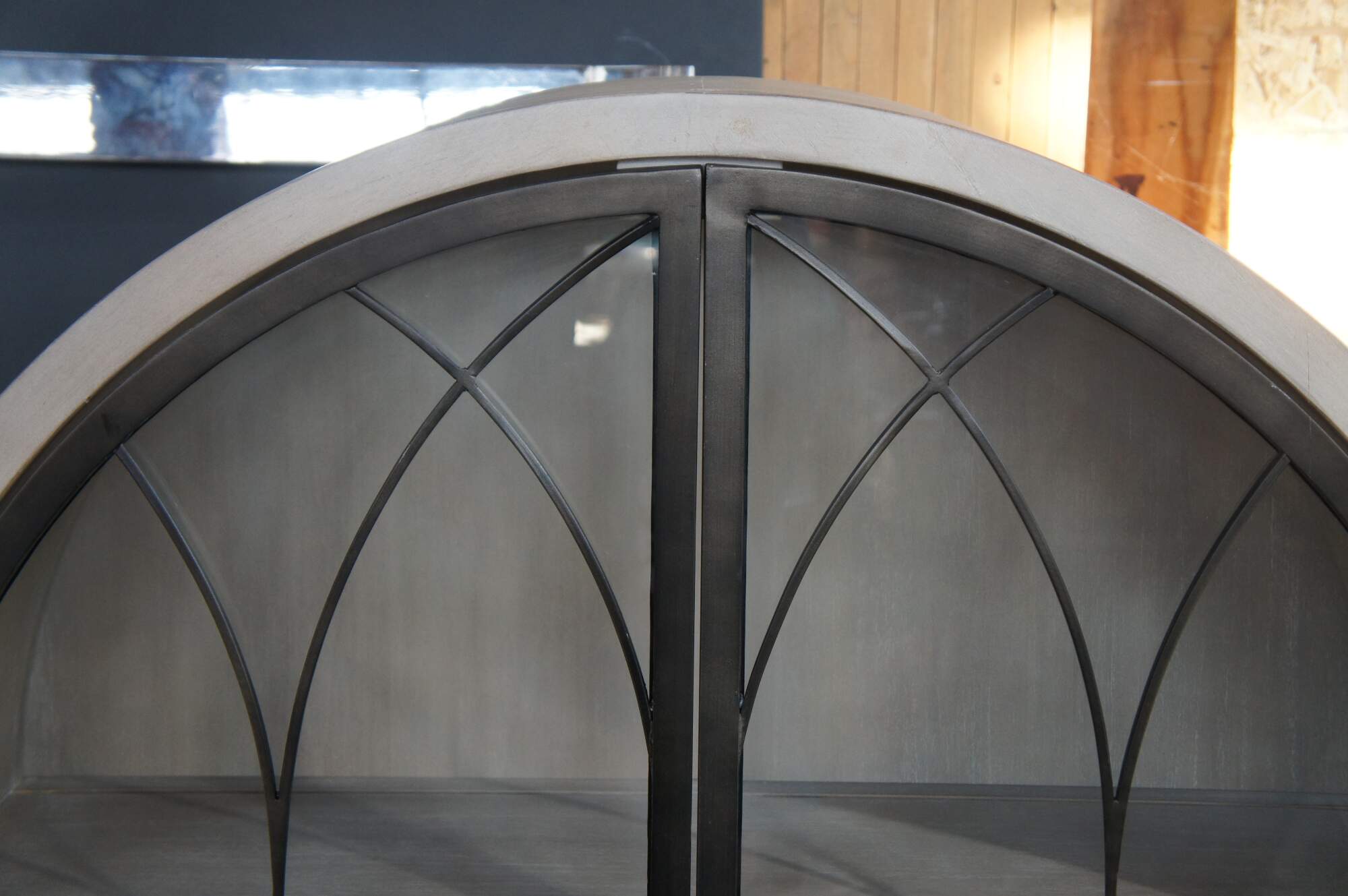 The Aris Glass Door Cabinet was inspired by a graceful European Gothic window. The cabinet features a white washed finish with custom-welded, bronze metal frame doors and matching splayed feet. Slender silhouette and shallow 14" depth are perfect for narrow spaces or dining rooms where you need to maximize space. One fixed and two adjustable shelves with plate grooves offer lots of display space.