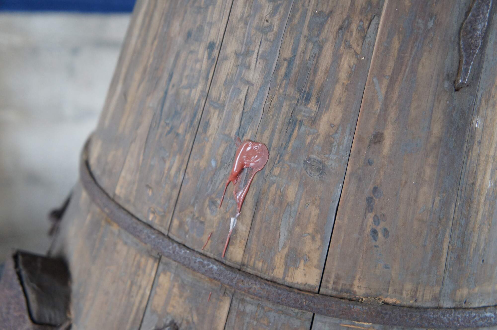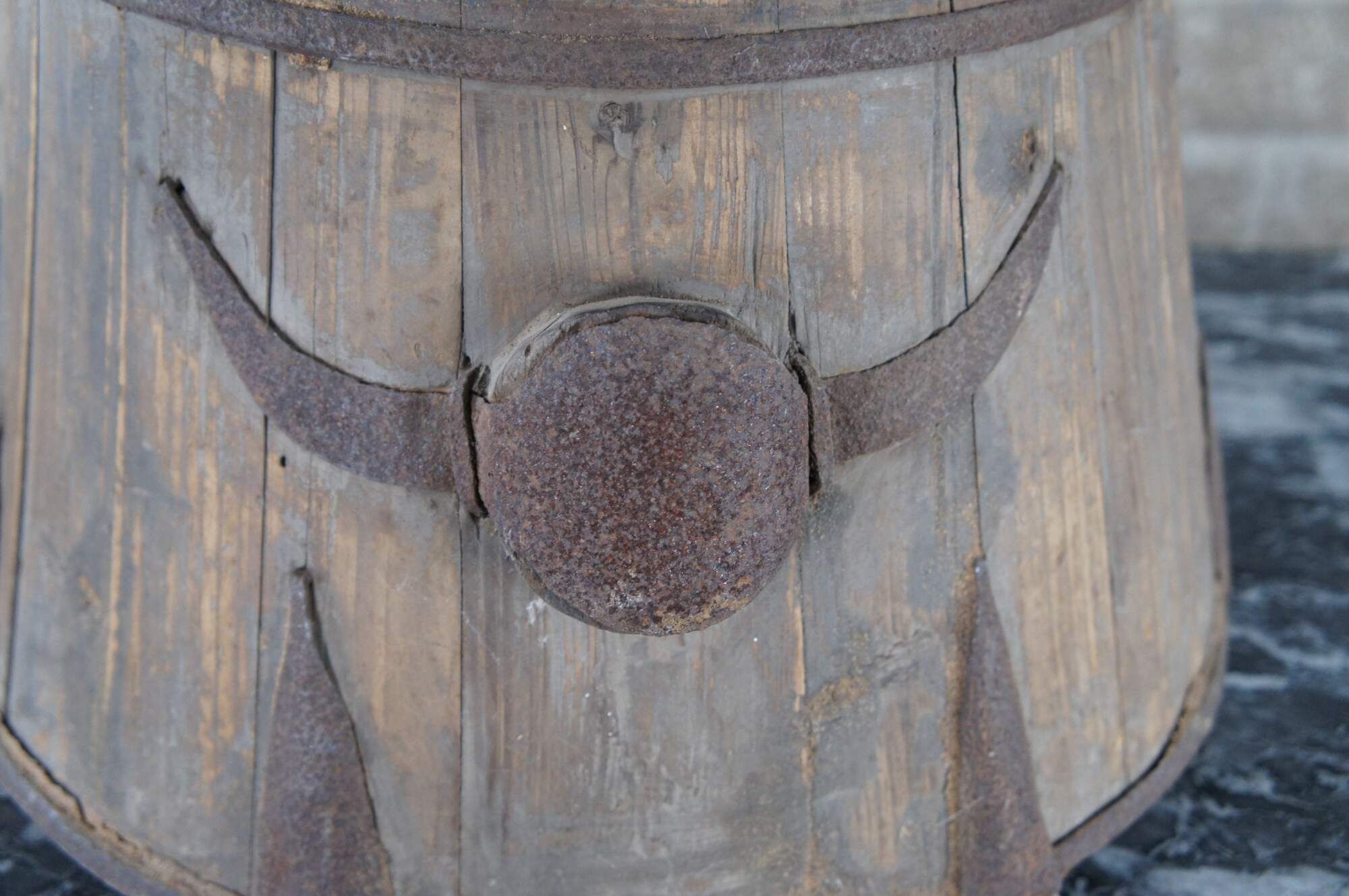 Chinese Shanxi barrel form banded iron wooden rice measure, bucket or basket. Aged with rustic patina and wax import stamp. Circa second half 20th century.