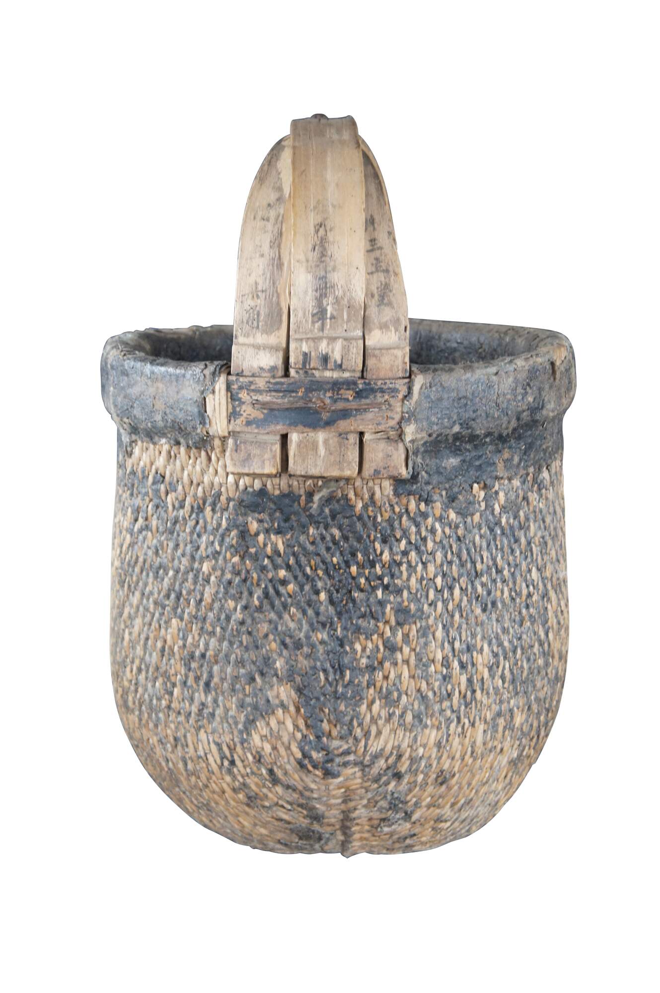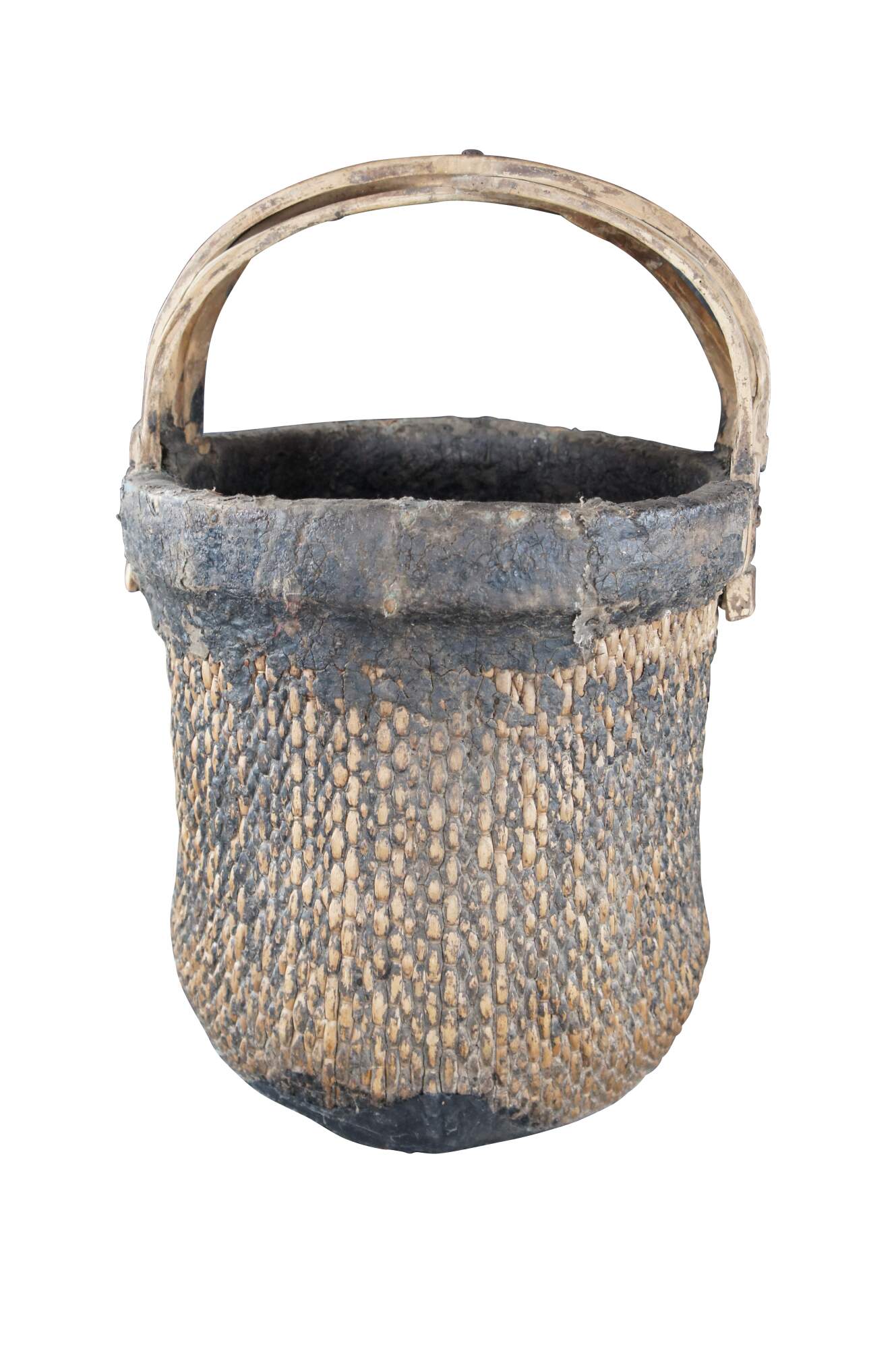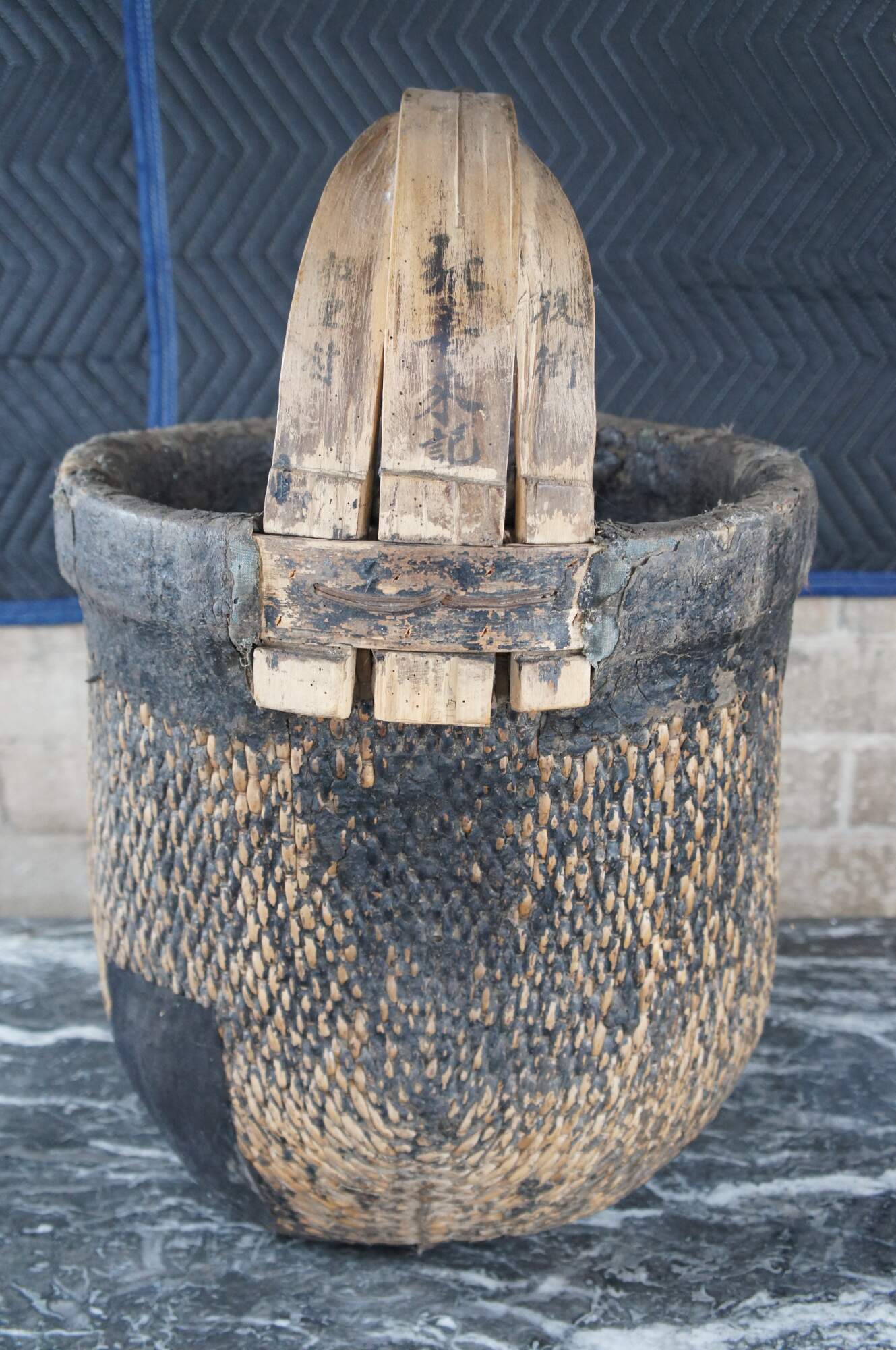 Early 20th Century Chinese Rice Basket. Made from woven reed with a bentwood handle and caligraphy.