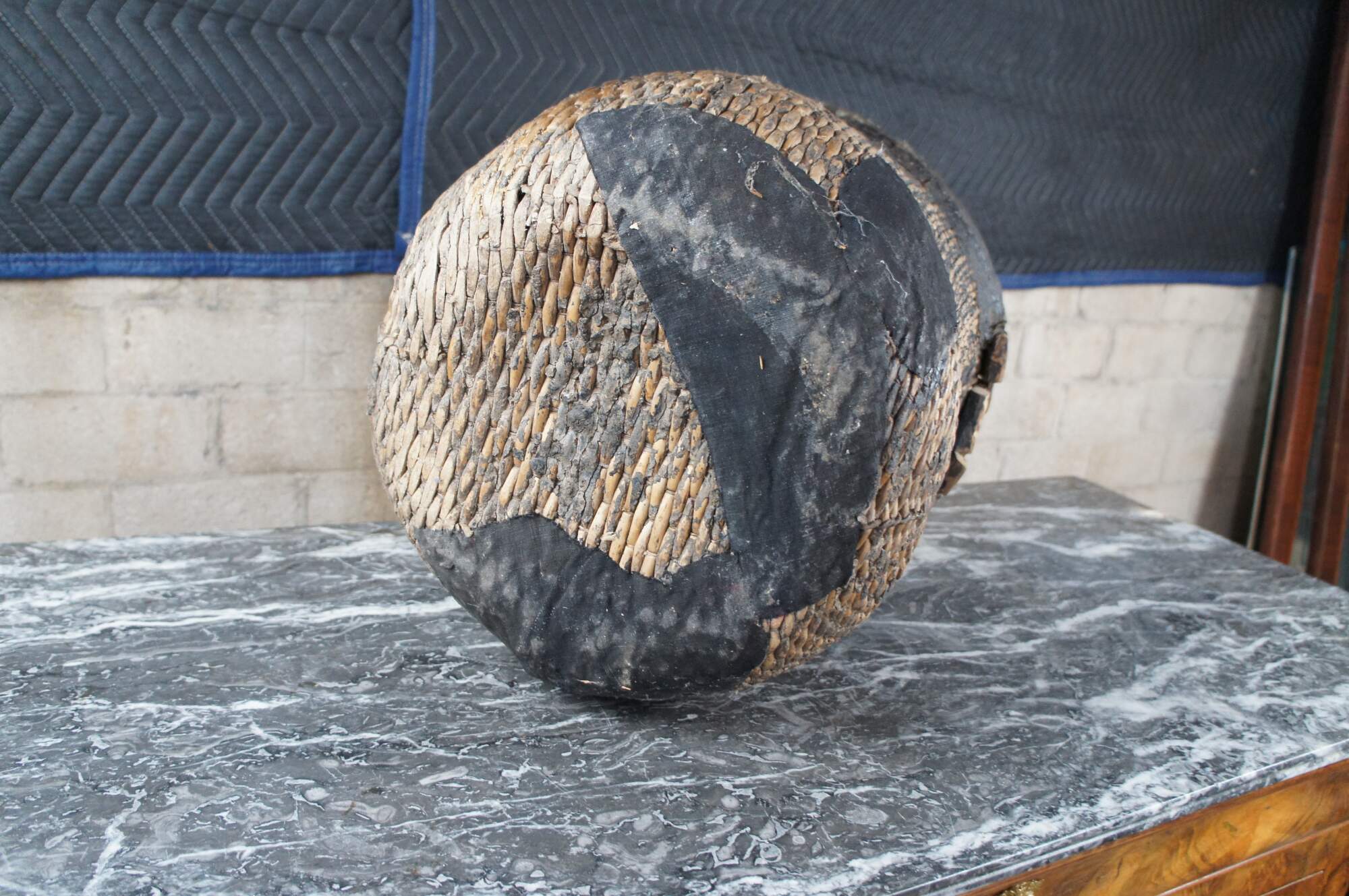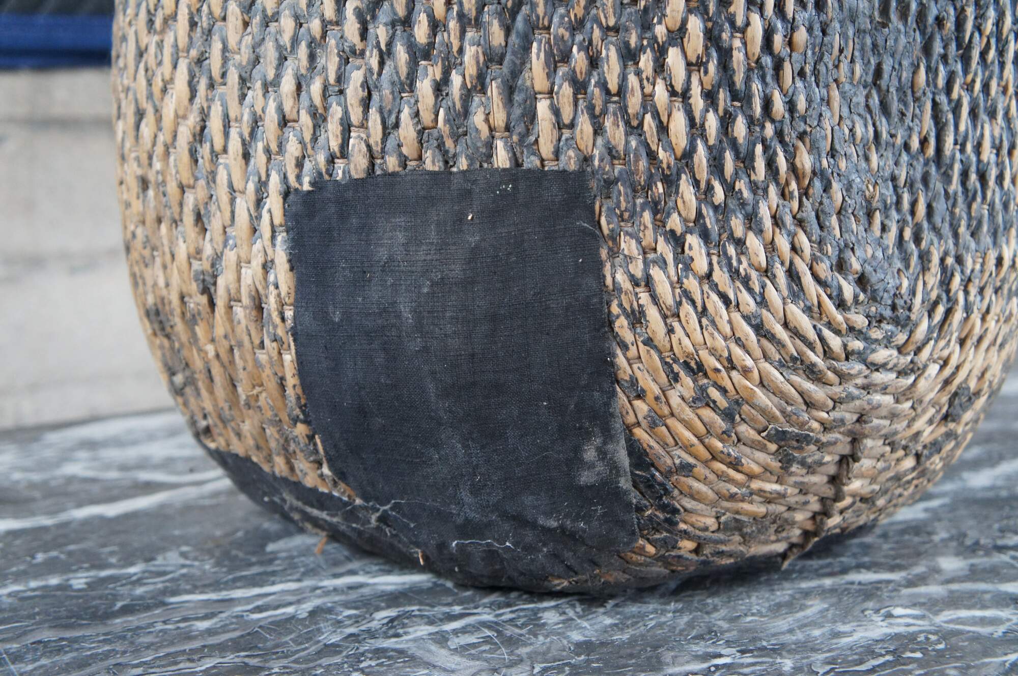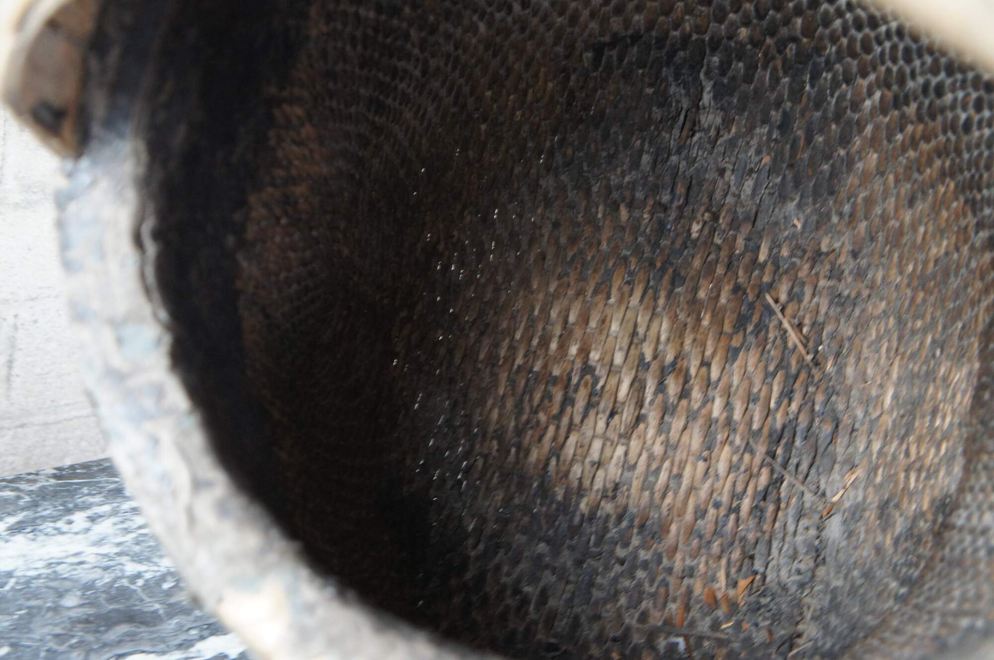 Early 20th Century Chinese Rice Basket. Made from woven reed with a bentwood handle and caligraphy.