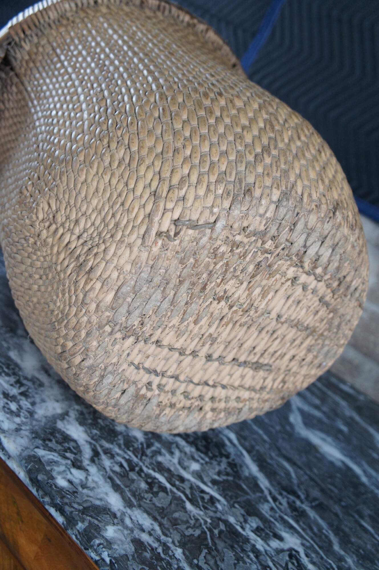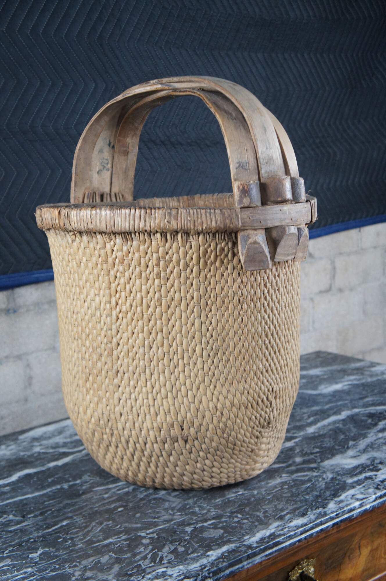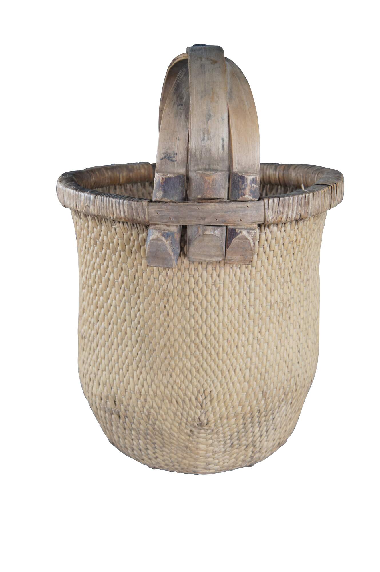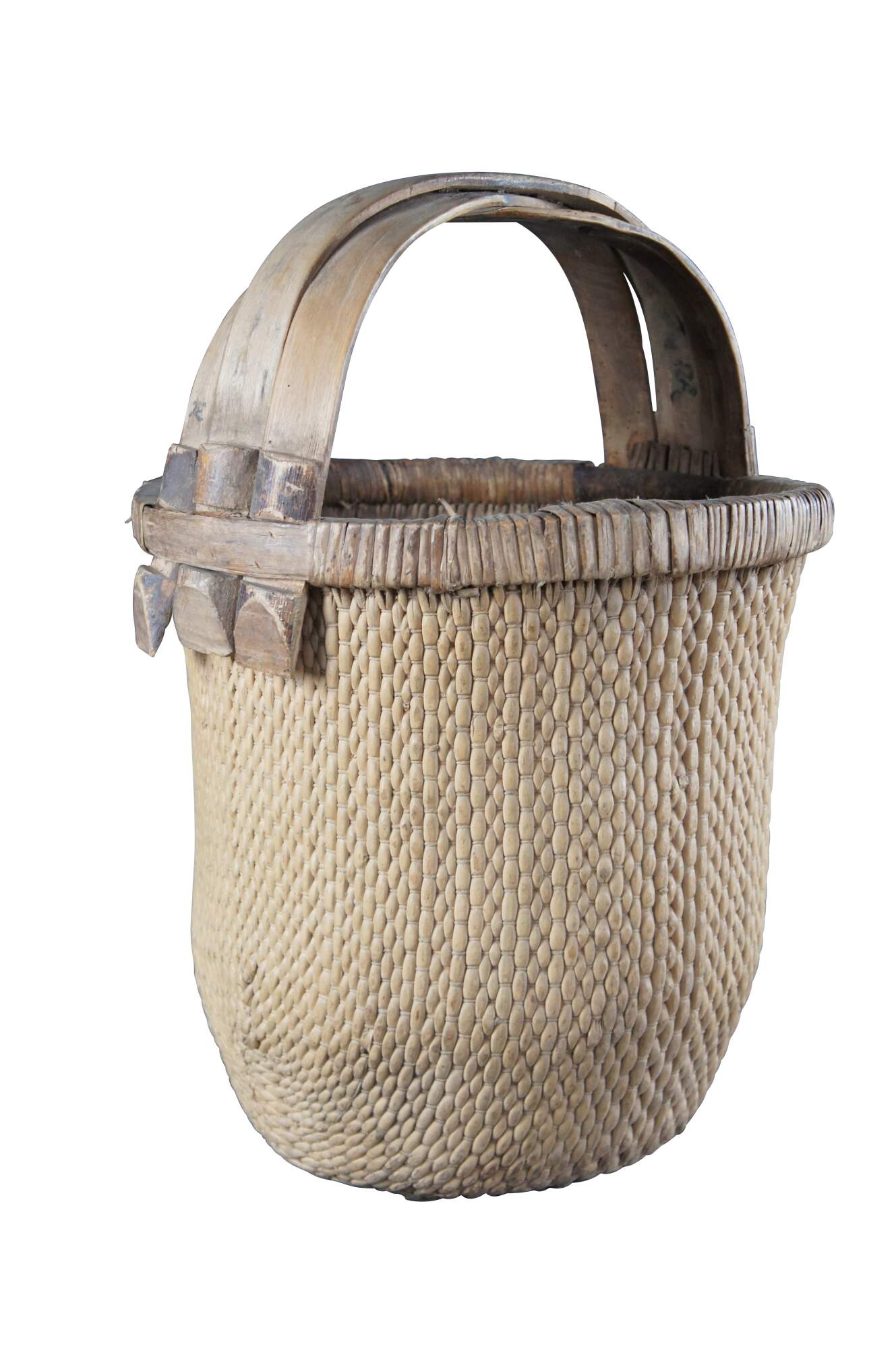 Early 20th Century Chinese Rice Basket. Made from woven reed with a bentwood handle and caligraphy.