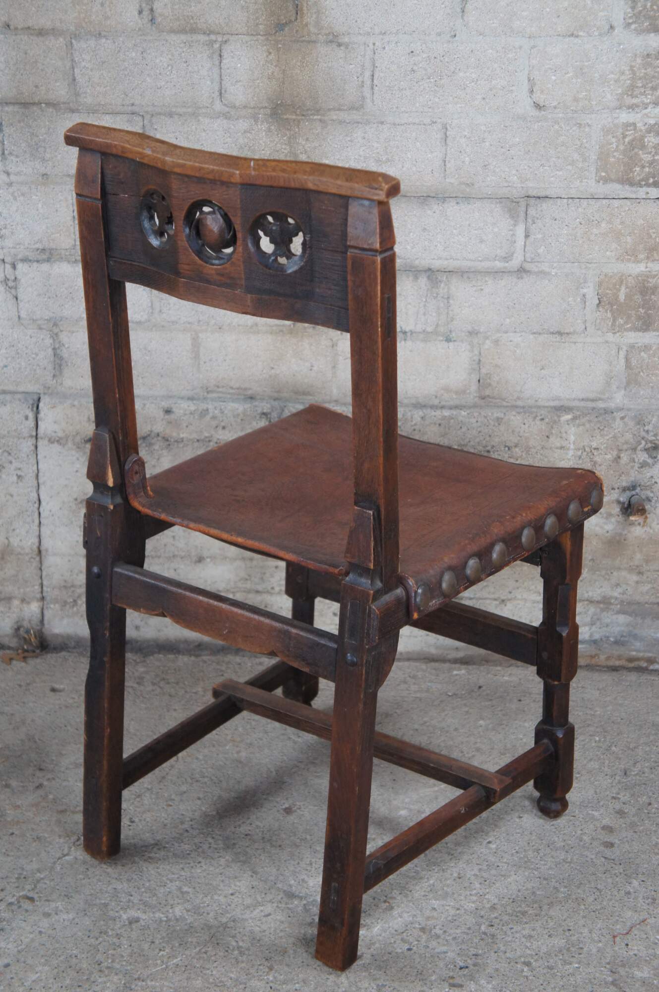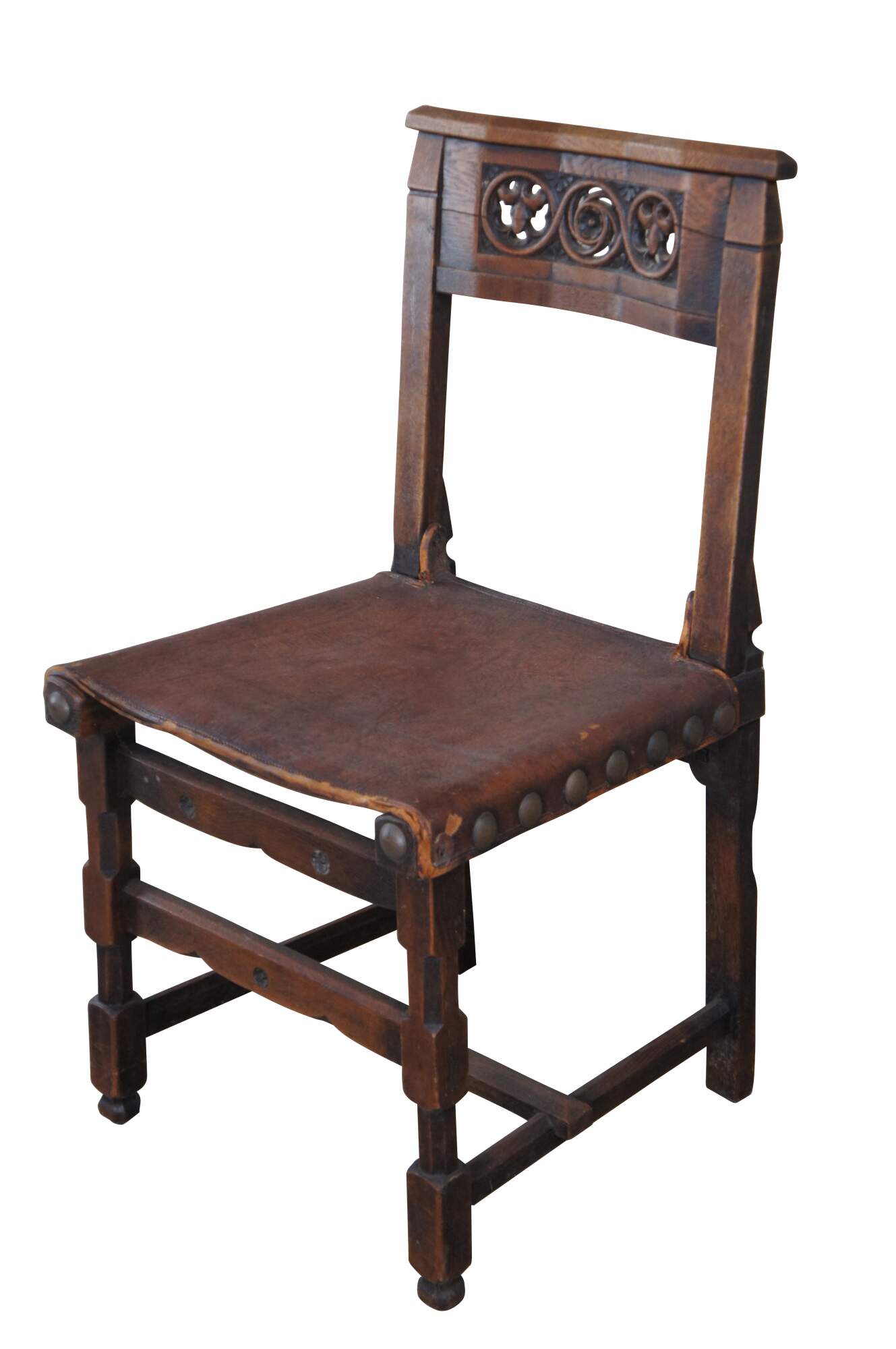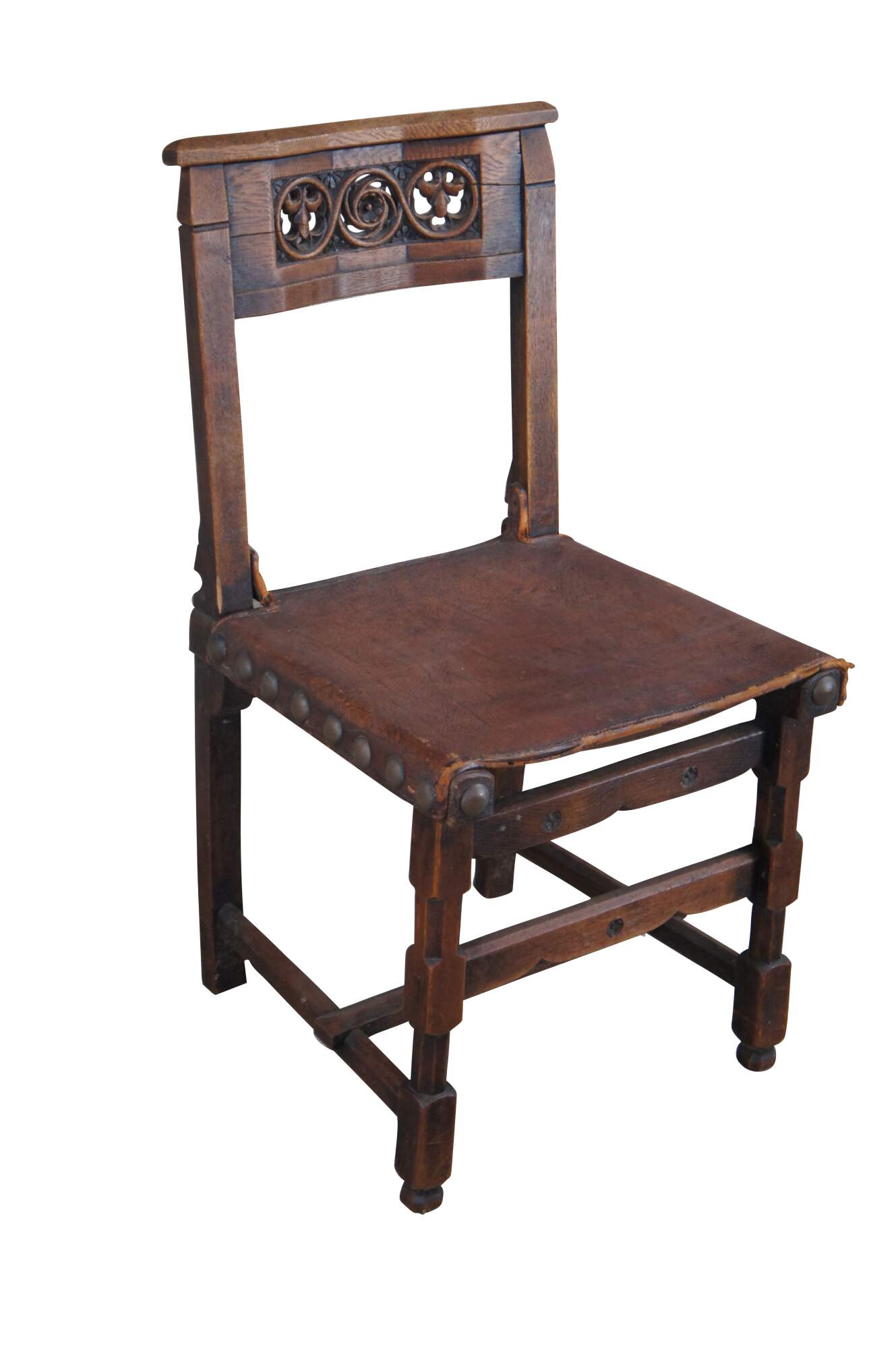 Antique spanish revival side chair. Made of quartersawn oak featuring mortise and tenon joinery with Celtic inspired design of reticulated / pierced florals / flowers and leaves over a thick leather seat with large nailhead trim.