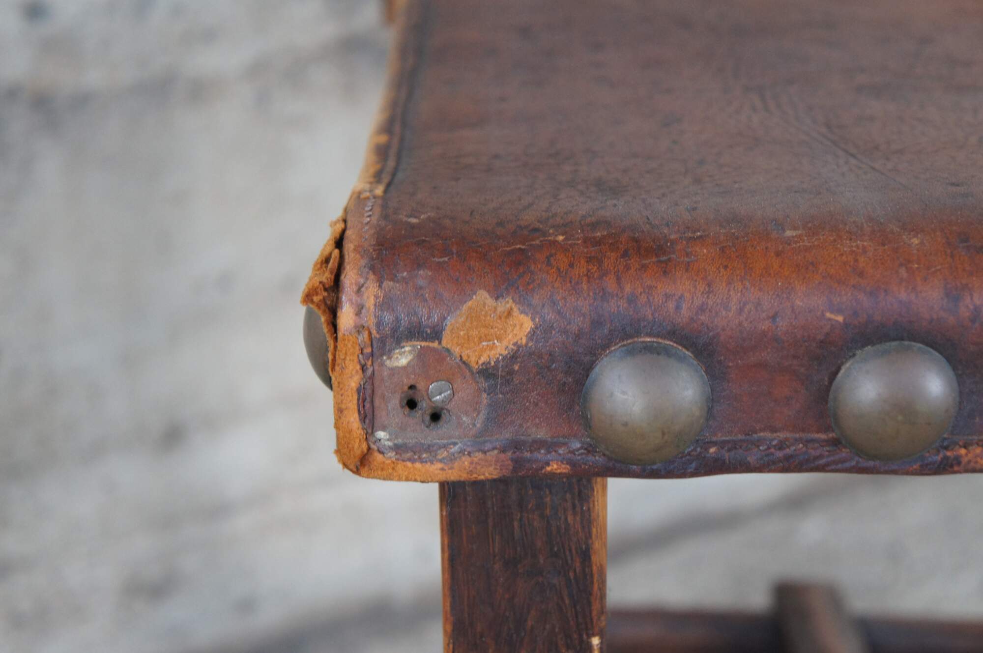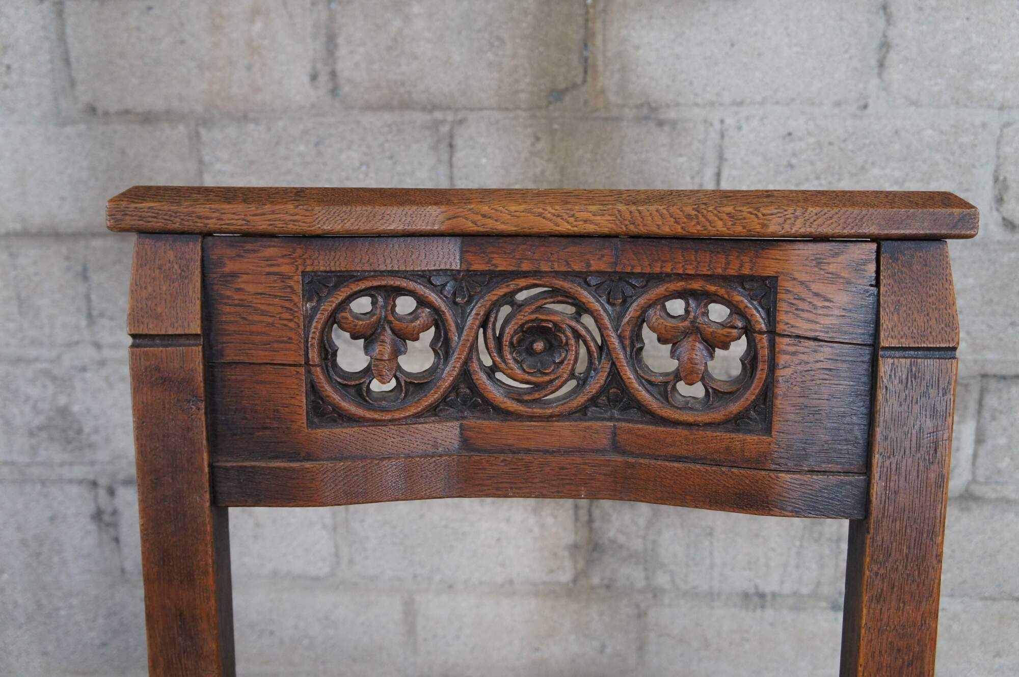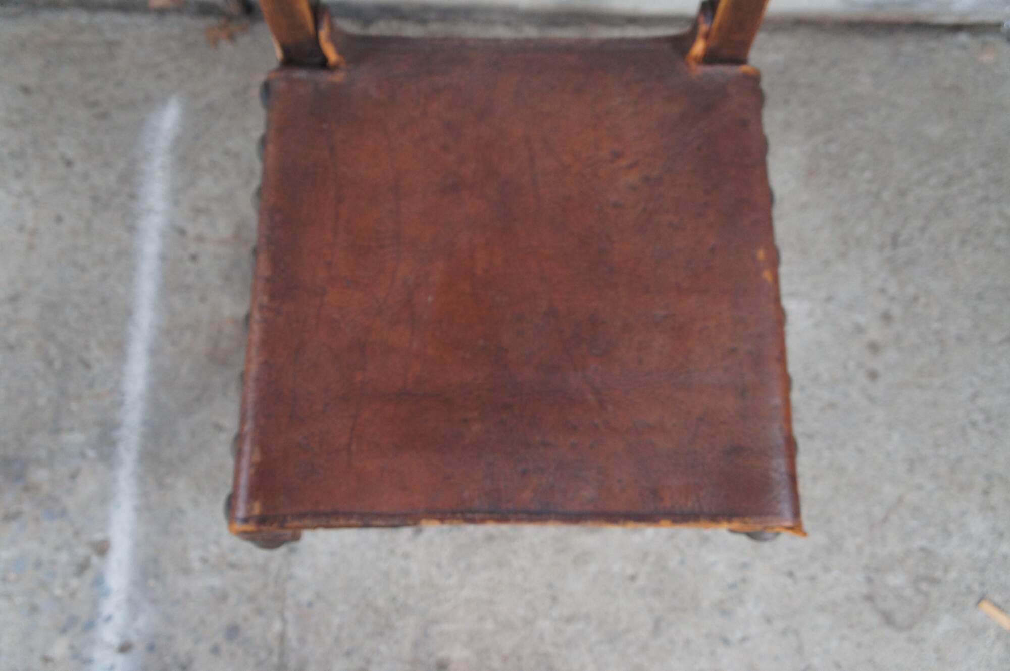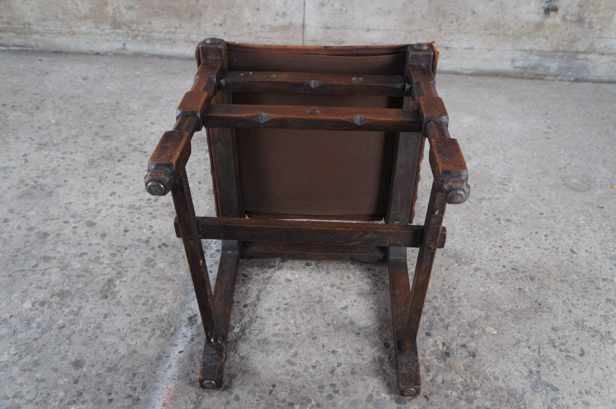 Antique spanish revival side chair. Made of quartersawn oak featuring mortise and tenon joinery with Celtic inspired design of reticulated / pierced florals / flowers and leaves over a thick leather seat with large nailhead trim.