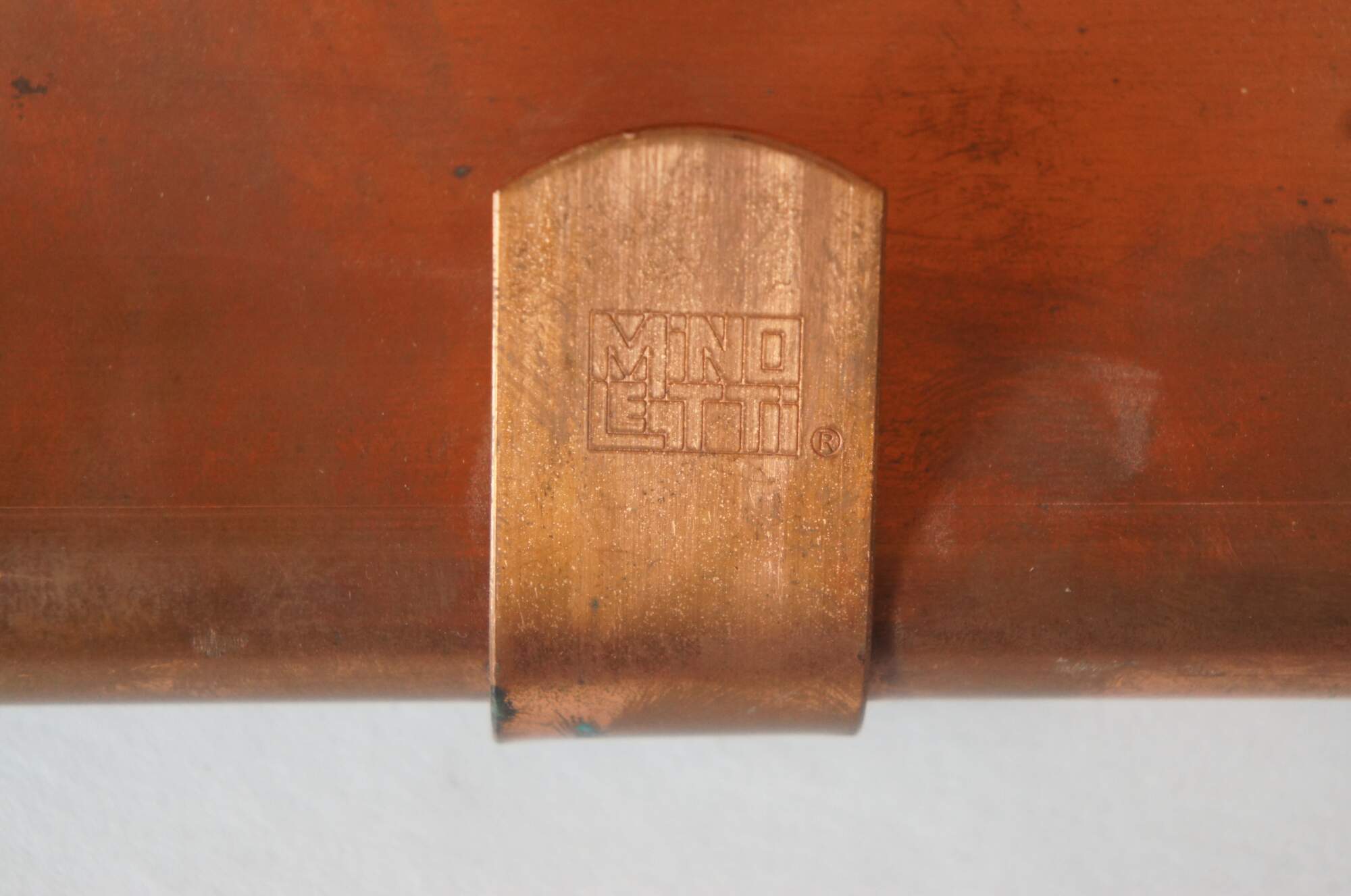 Late 20th century Minoletti copper downspout gutter segment, outlet embossed with a sun, and half-spherical end caps. Includes base connector and one support bracket. Numbered 330/100.