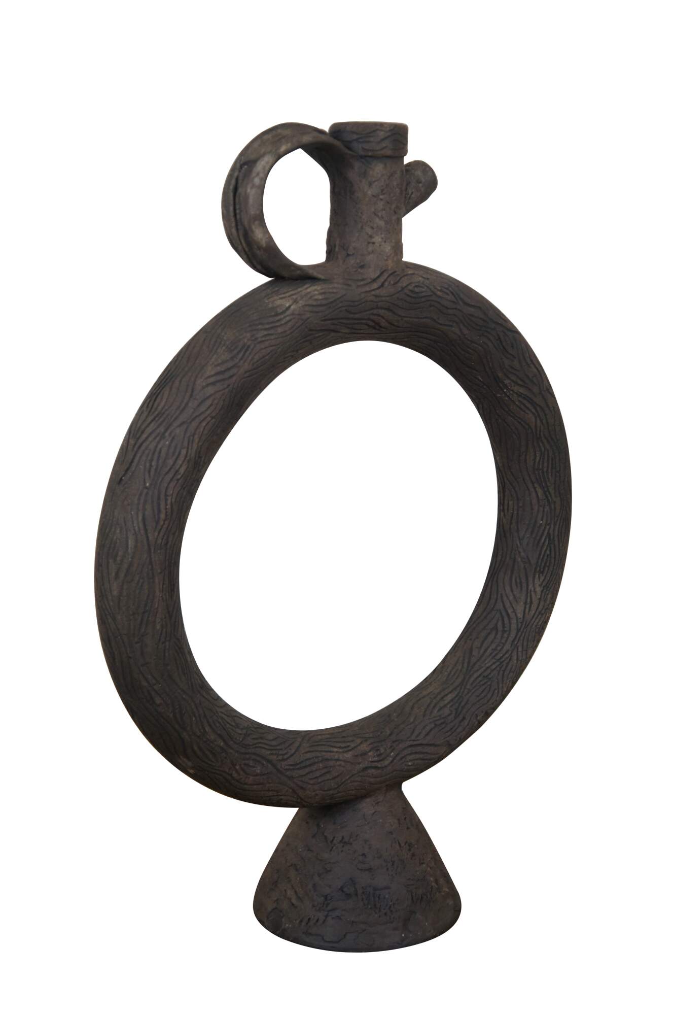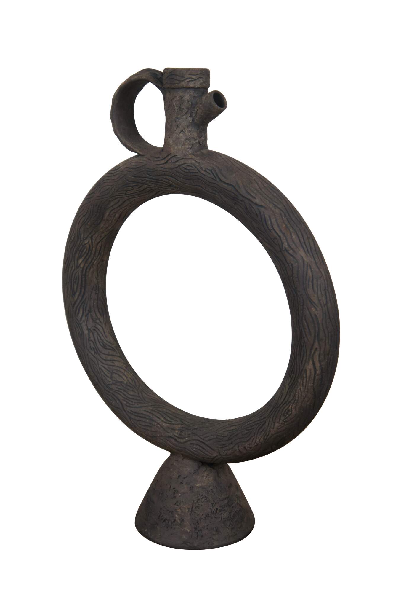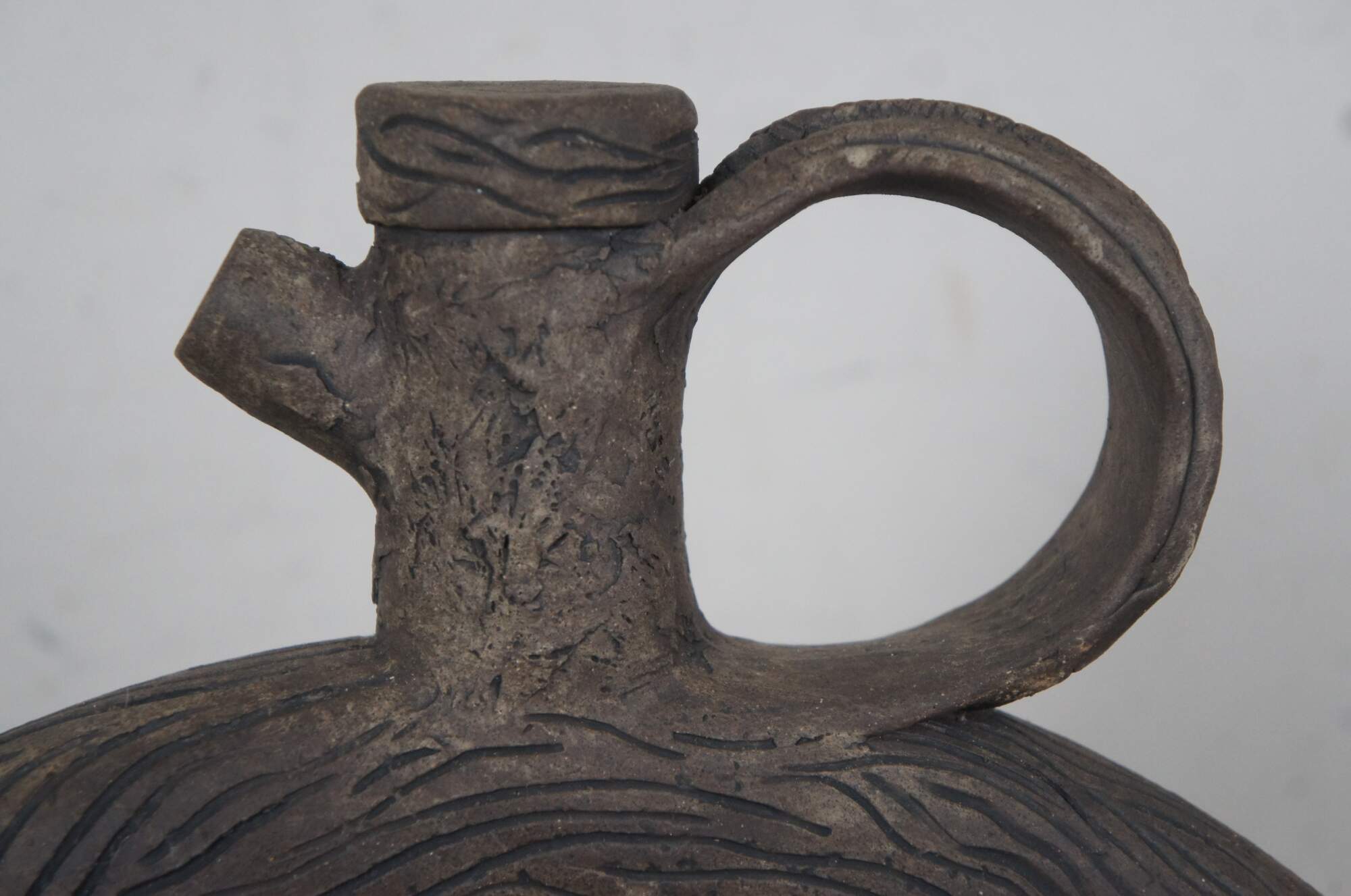 20th century unglazed brown art pottery decanter jug / bottle / pitcher with conical base, faux stopper, and handcrafted wood grain / tree bark texture.